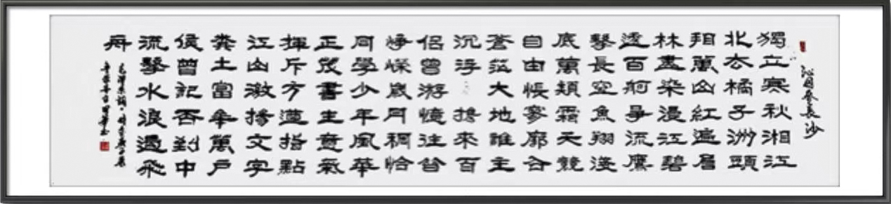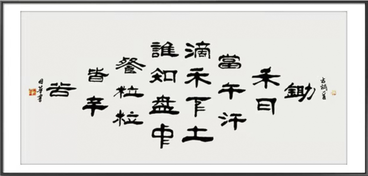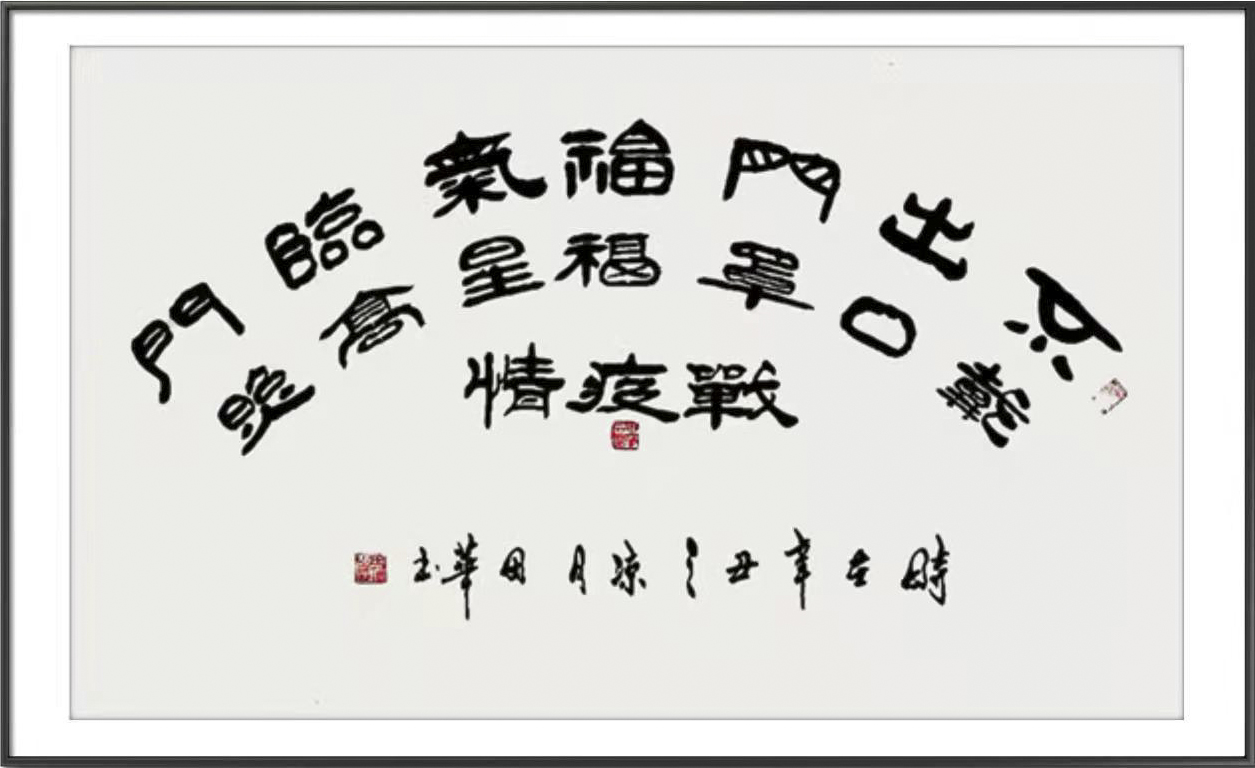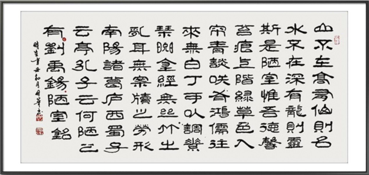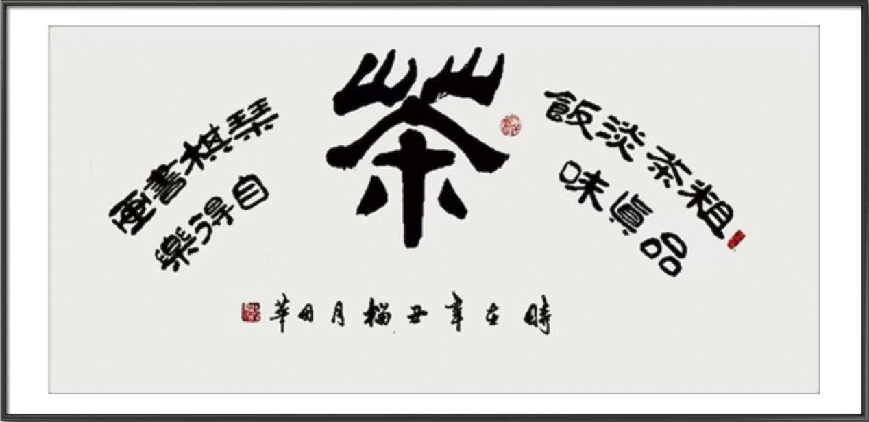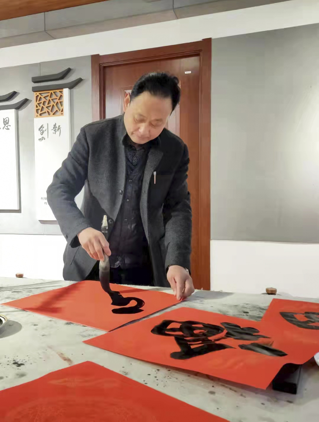他自幼酷爱书法、篆刻艺术,博学众长、独辟蹊径,40余年临池不辍,楷、隶、美术体等各种书法兼收并蓄,且有所创新,他的书法字如其人,字里行间透出本人的性格,他精于隶书自成一体,撇见其境,捺见其界,初观给人新颖,耳目一新,细察如赏画卷,耐人寻味。在蚕头燕尾的基础上,标新立异,用书法之笔意,展现绘画之意境,达到大俗大雅之境界。