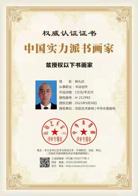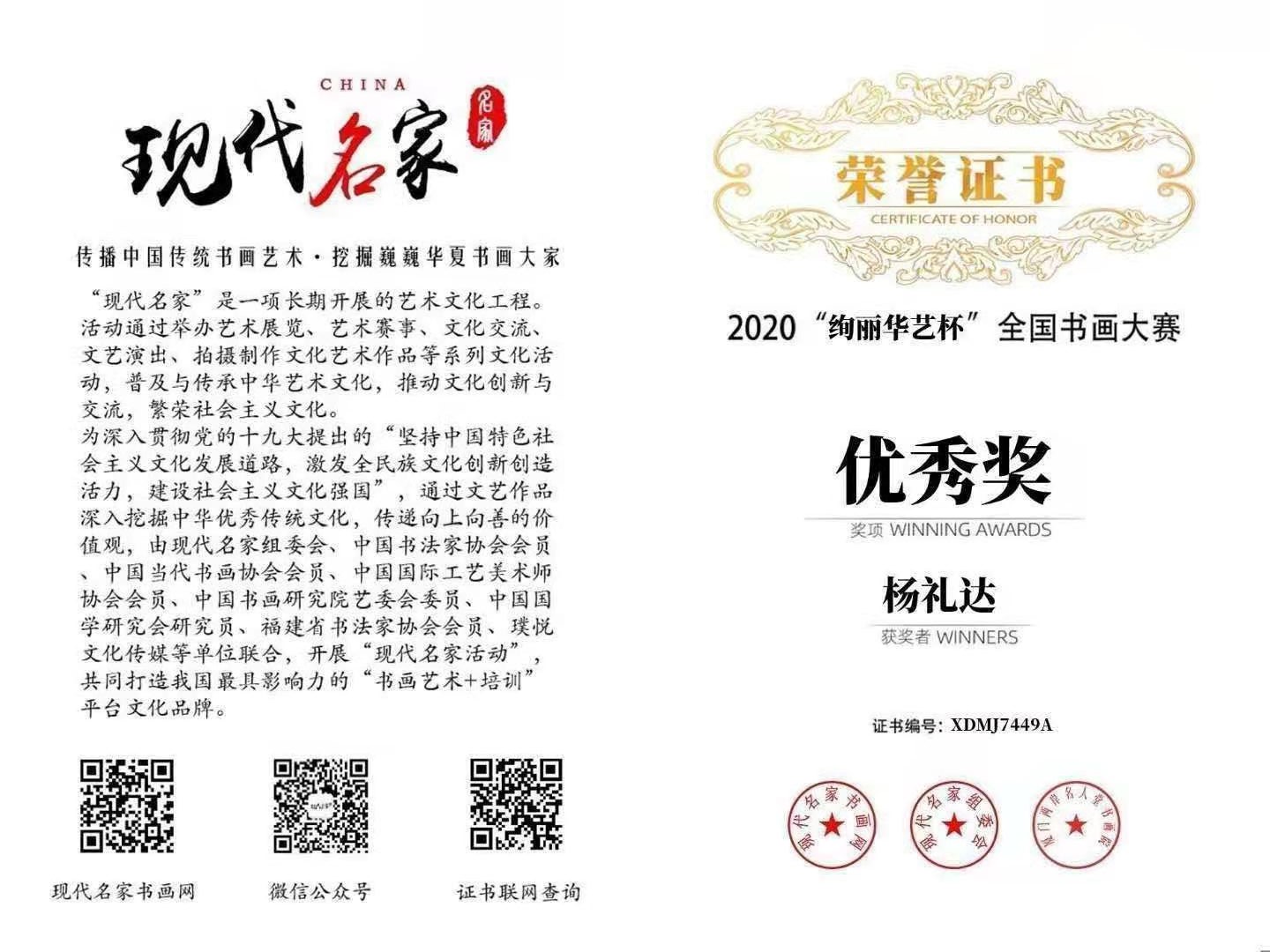 2020年参加现代名家绚丽华艺杯全国书画大赛优秀奖、书画艺术大师数据中心评定委员会评定为中国杰出艺术家、以楷、隶、草、篆为主。