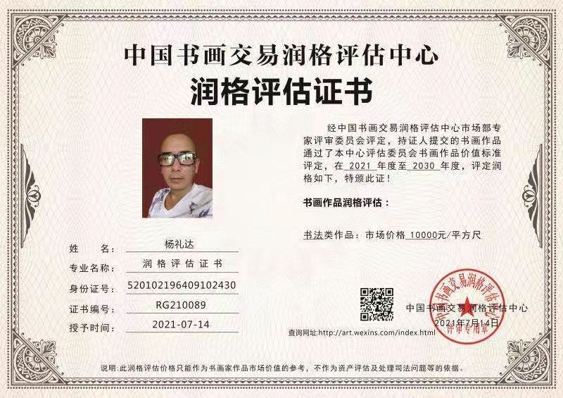 2004年被中国美术学院社会美术水平考级中心评定为9级书法师。