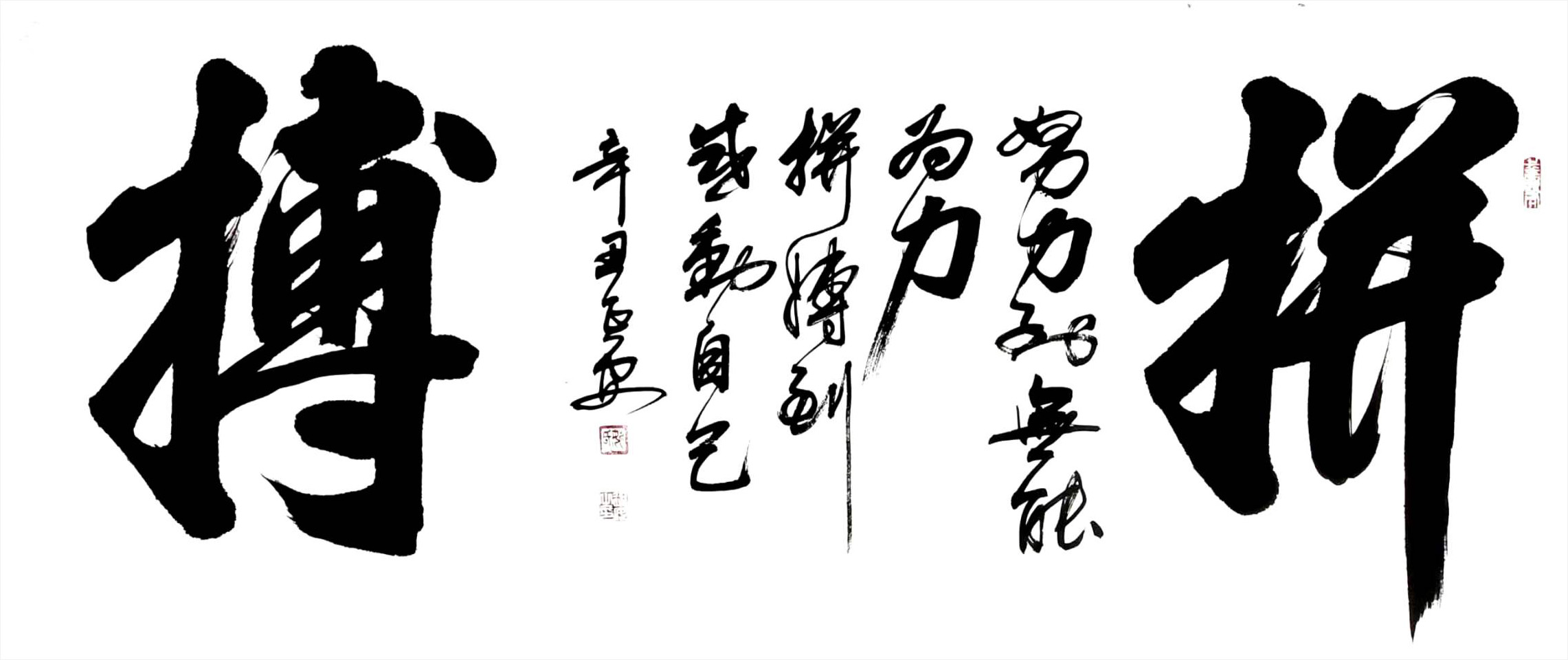 榜书上更是颇有造诣。从古今名家中汲取营养,钻研行草技巧,从生活中积累素材,从传统中求得创新。在长期的揣摩苦练之后,已深悟笔法之奥妙。