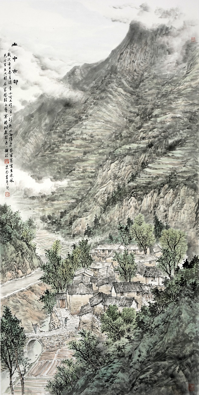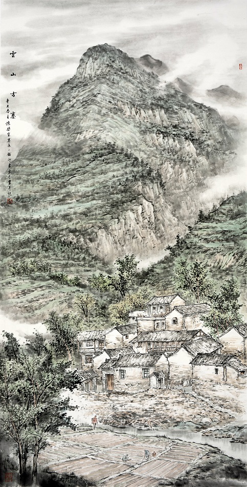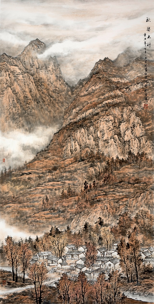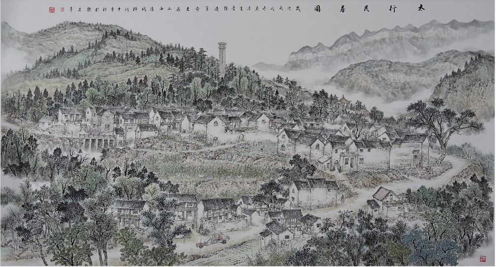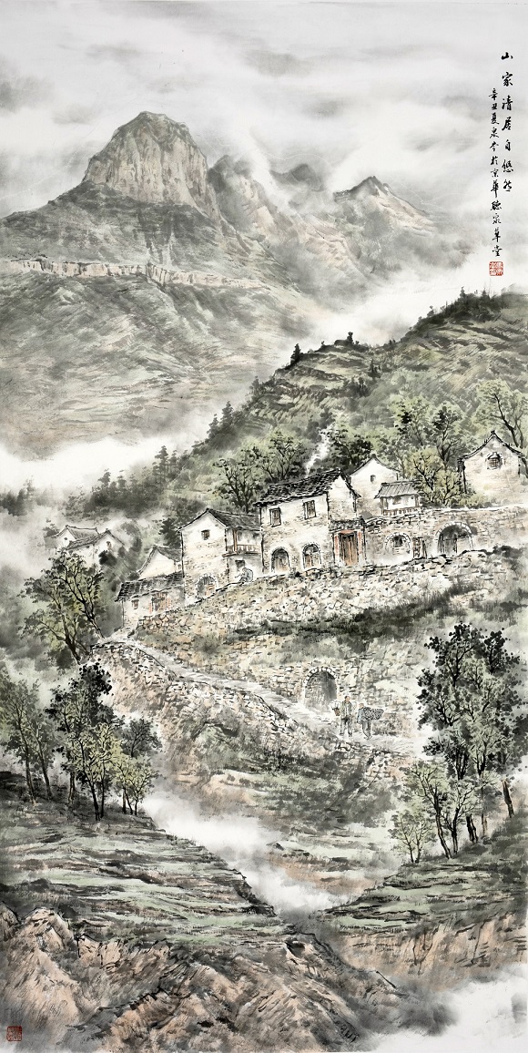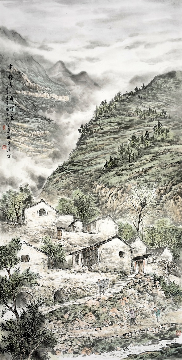 今日我们欣赏马学军先生的众幅山水作品,即能深刻的感受到他对这一传统丹青文化的高度体悟,与此同时,在作品中他也并没有将笔墨技法归之于口号和想象,而是全部落实到了自然的山水形意之上。笔法的表现力在色彩的加持下得到了全面的个性升华,而墨和色之间的双重运用更是能将太行山脉的恢弘气势尽展无遗!通幅山水形意,可见于那浑然雄壮的博大山林,亦可见于那似险绝从生的悬崖峭壁,近处古寨村居循循而落,犹入桃源之境,令人心神驰往,生机无限,而远处青峰云烟则又徐徐而生,缥缈缭绕间似有若即若离之境,配以绵延千里的广袤叠岭,即更能反映出于一种境随心造的高超妙意!