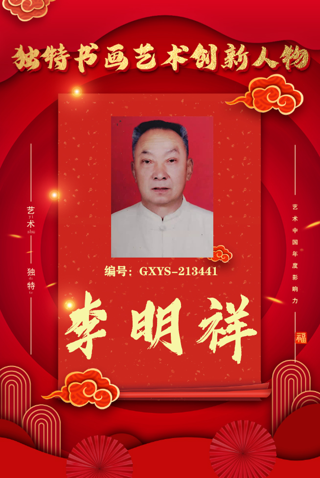 李明祥出生于1953年1月20日。本人自幼酷爱书法,当年上学很少用铅笔 小学三年级就有描红,而且还要搭桥(就是 在描红每个字的上横格梁和竖线上写小字)。参军后如鱼得水,在完成本职工作后主临摹赵孟頫字帖直到今天,博采众长,50多年的笔墨耕耘中形成独有风格。现为宁夏老年书画协会会员,宁夏书画艺术发展促进会理事,宁夏老年大学学员,中国老年书画协会会员,中国中外名人文化研究会艺术委员会荣誉主席,国典书画会员, 夏传统文化交流促进会副会长,宁夏铁路书 画协会常务会长,北京宣和书画艺术研究院宁夏分院会员,国际同心会世界总会职委会监委。作品入展纪念中国工农红军长征胜利80周年全国首届书画精英展,现场笔会作品被首届书画精英展组委会收藏。作品多次被台湾国际同心会世界总会长收藏。一幅毛泽东《清平乐·六盘山》在几次北京笔会上,被广州中山大学教授、清华大学终身教授收藏。收藏者遍及新疆,福建,广州安徽青海等几十个省区。为解放军艺术学院现场挥毫泼墨深受各界好评。加在北京举办“中国力量责任、担当、行动海内外中华儿女大型爱国主义主题活动现场笔会。在北京以荣誉会长身份出席“ 两学一做”学习教育暨2016年代楷模新春 团拜会。2017参加年由海南人民艺术家、中国民族书画院举办的“弘扬中华文化,助力一带一路”文化交流大会暨中华杰出艺术家书画品巡展。被中国文化信息协会评选为中国十佳文化大使。