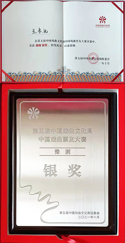 2021年获全国第五届戏剧票友大赛(豫剧)银奖。