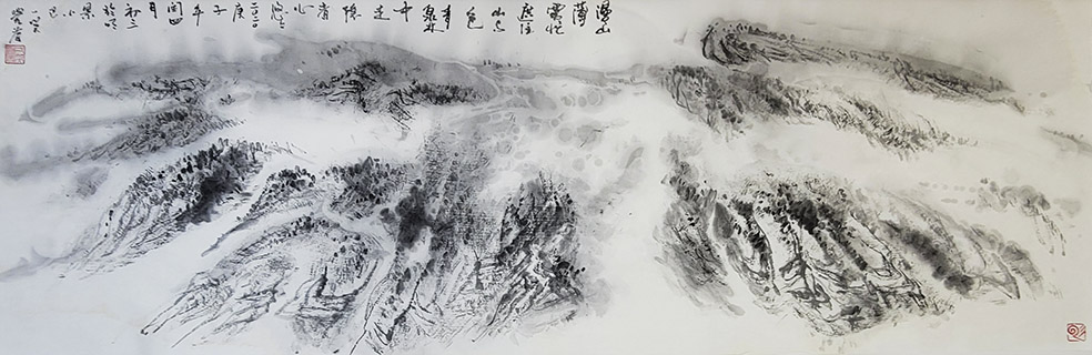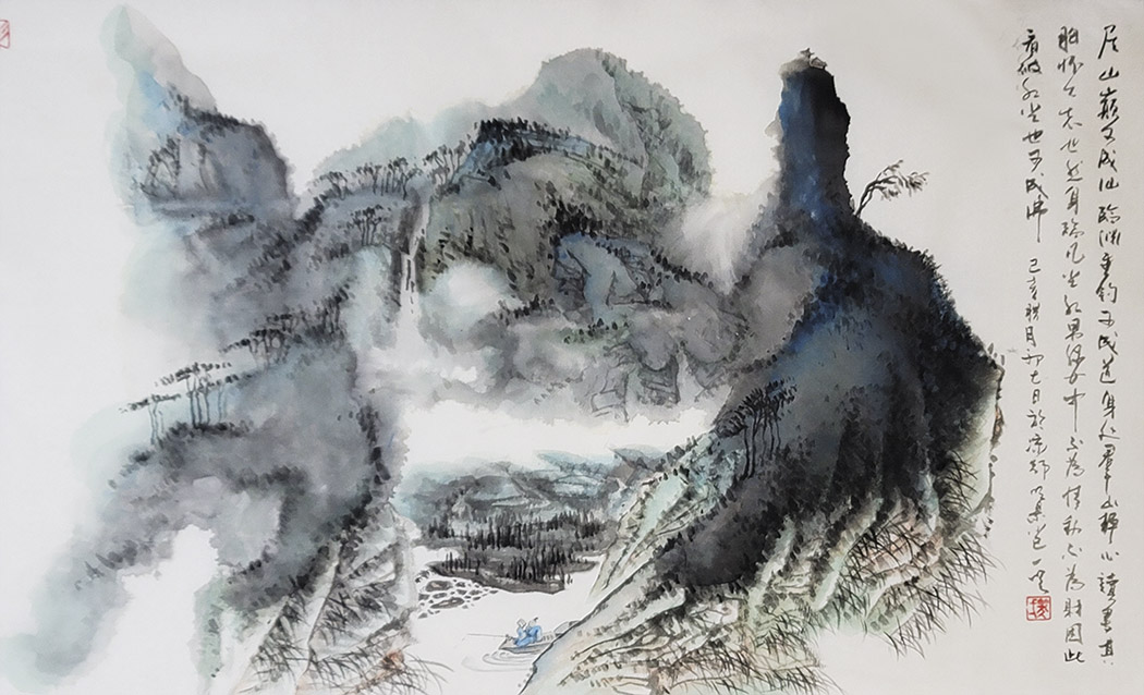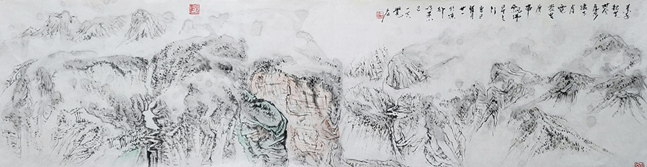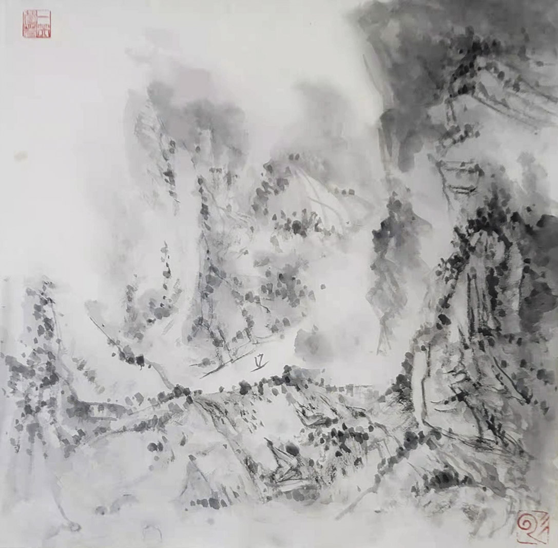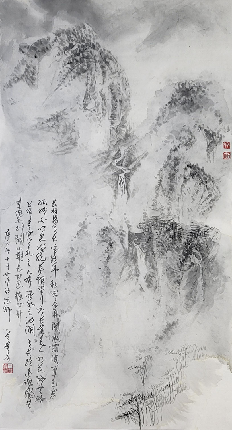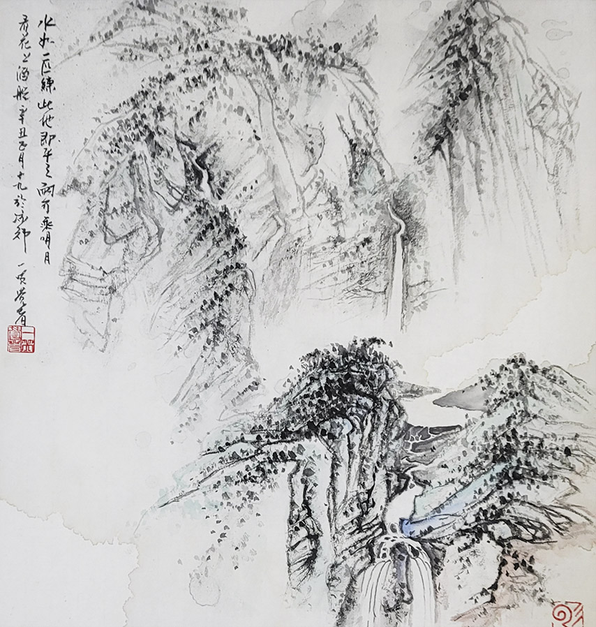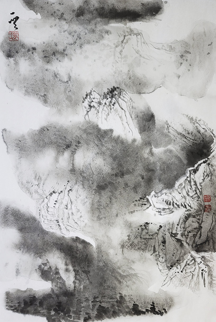 一笑觉者对历代大师作品心追手摹,尤其对近代山水画大师黄宾虹、陆俨少钟爱有加,在不断总结、探索的过程中形成和完善了自己独特风格的表现技法——泼水法。以这种独特的表现技法,描绘出了乌蒙山水的烟云变化,体现了云贵高原山水的险峻,曾有诗赞乌蒙: