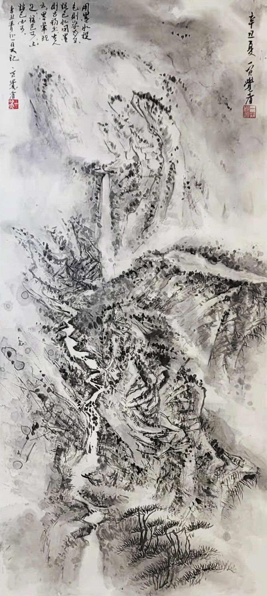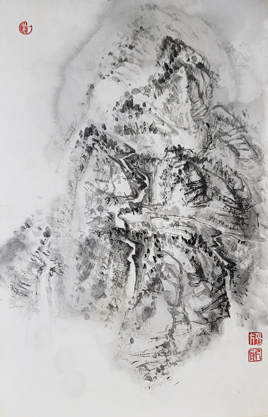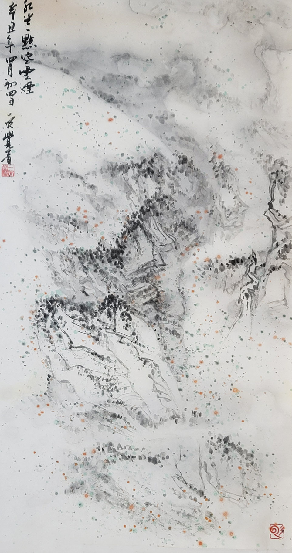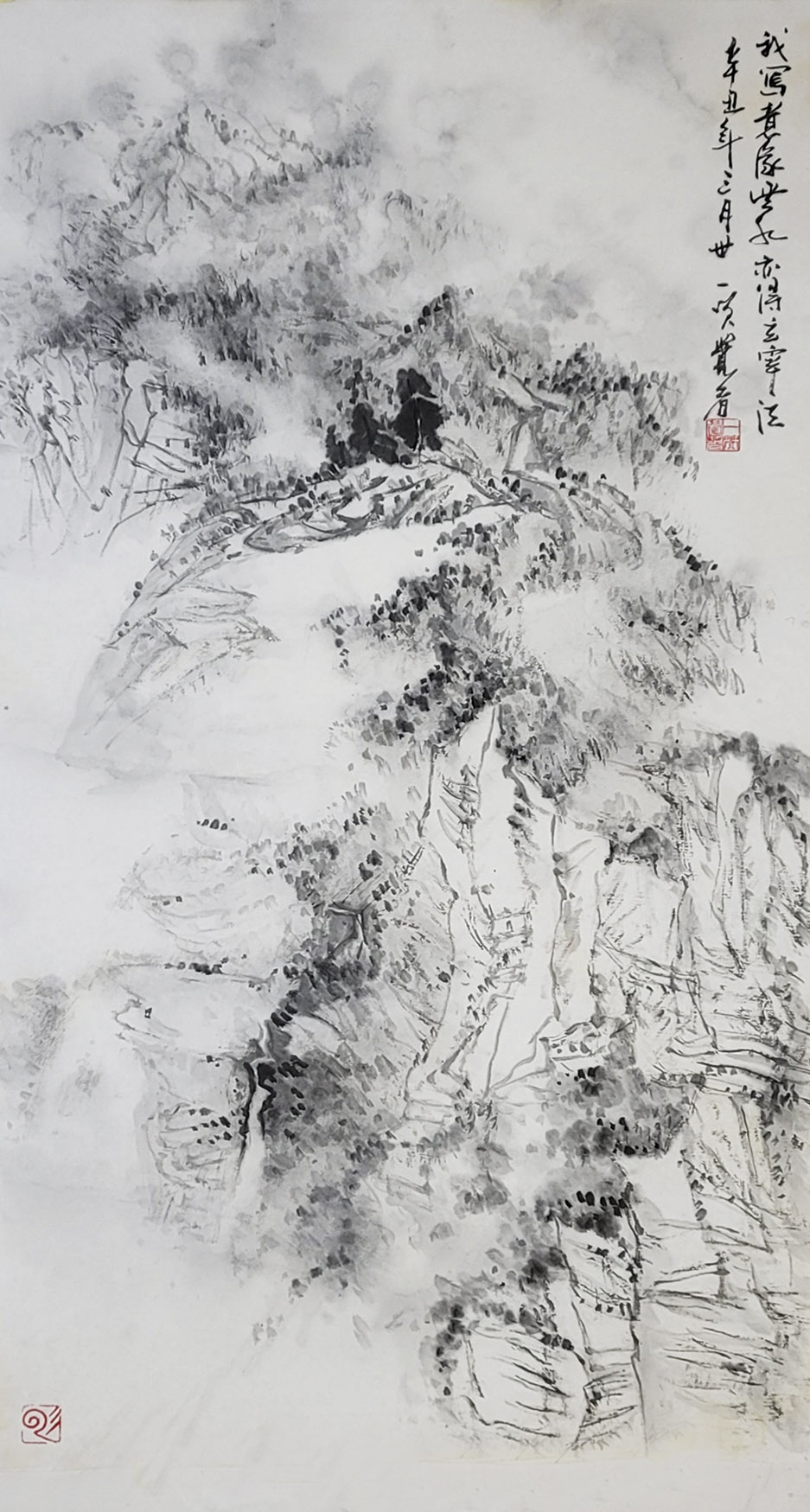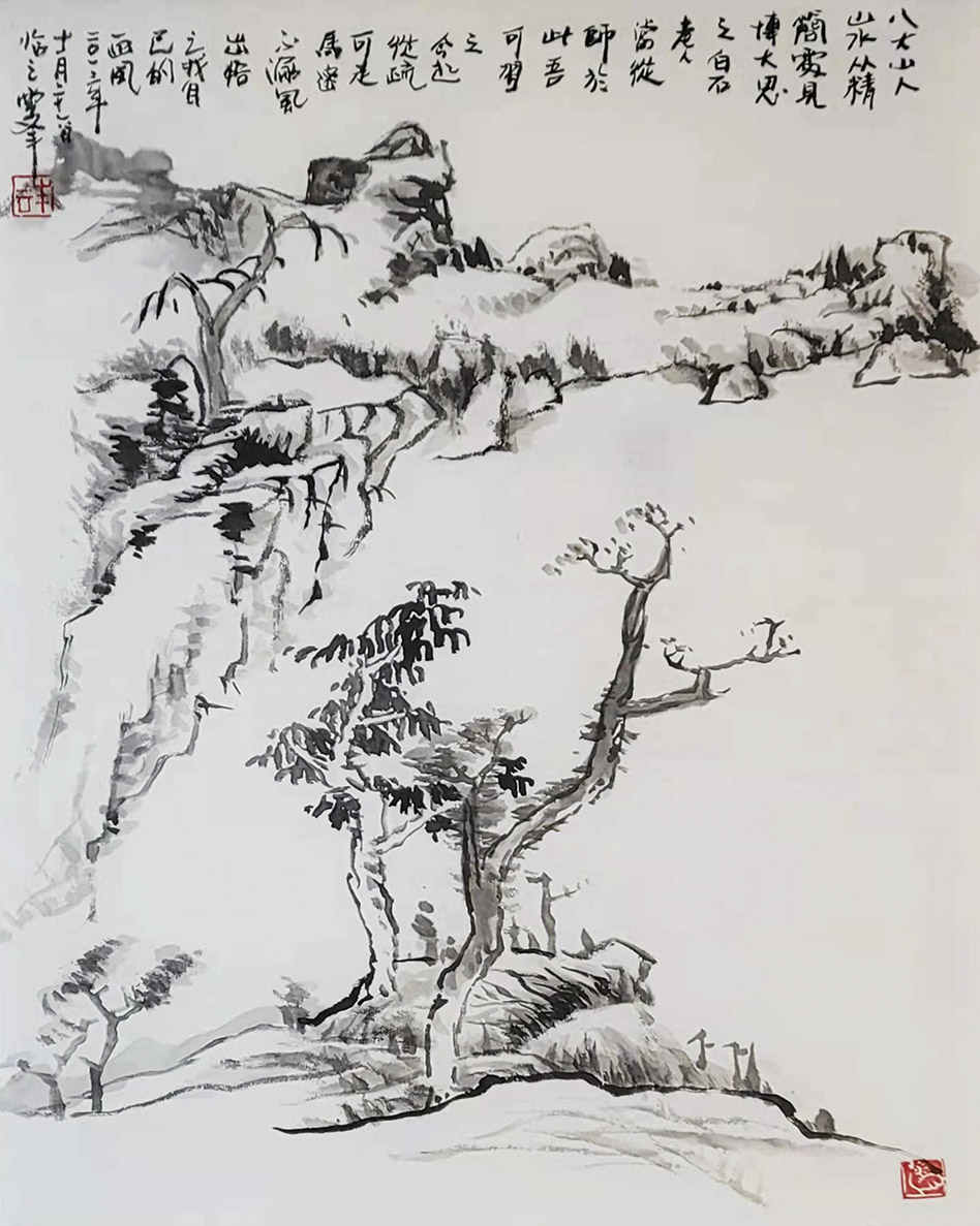 一笑觉者对历代大师作品心追手摹,尤其对近代山水画大师黄宾虹、陆俨少钟爱有加,在不断总结、探索的过程中形成和完善了自己独特风格的表现技法——泼水法。以这种独特的表现技法,描绘出了乌蒙山水的烟云变化,体现了云贵高原山水的险峻,曾有诗赞乌蒙: