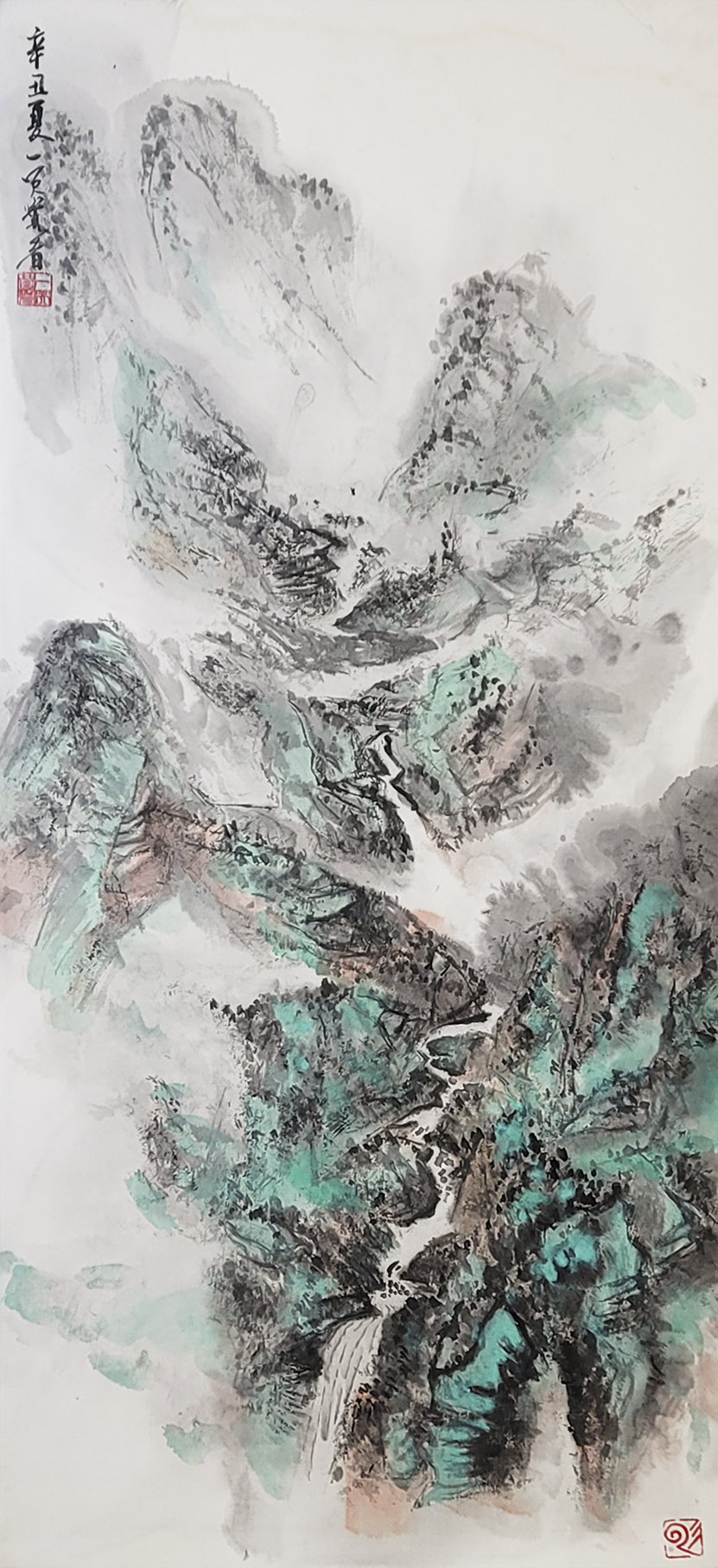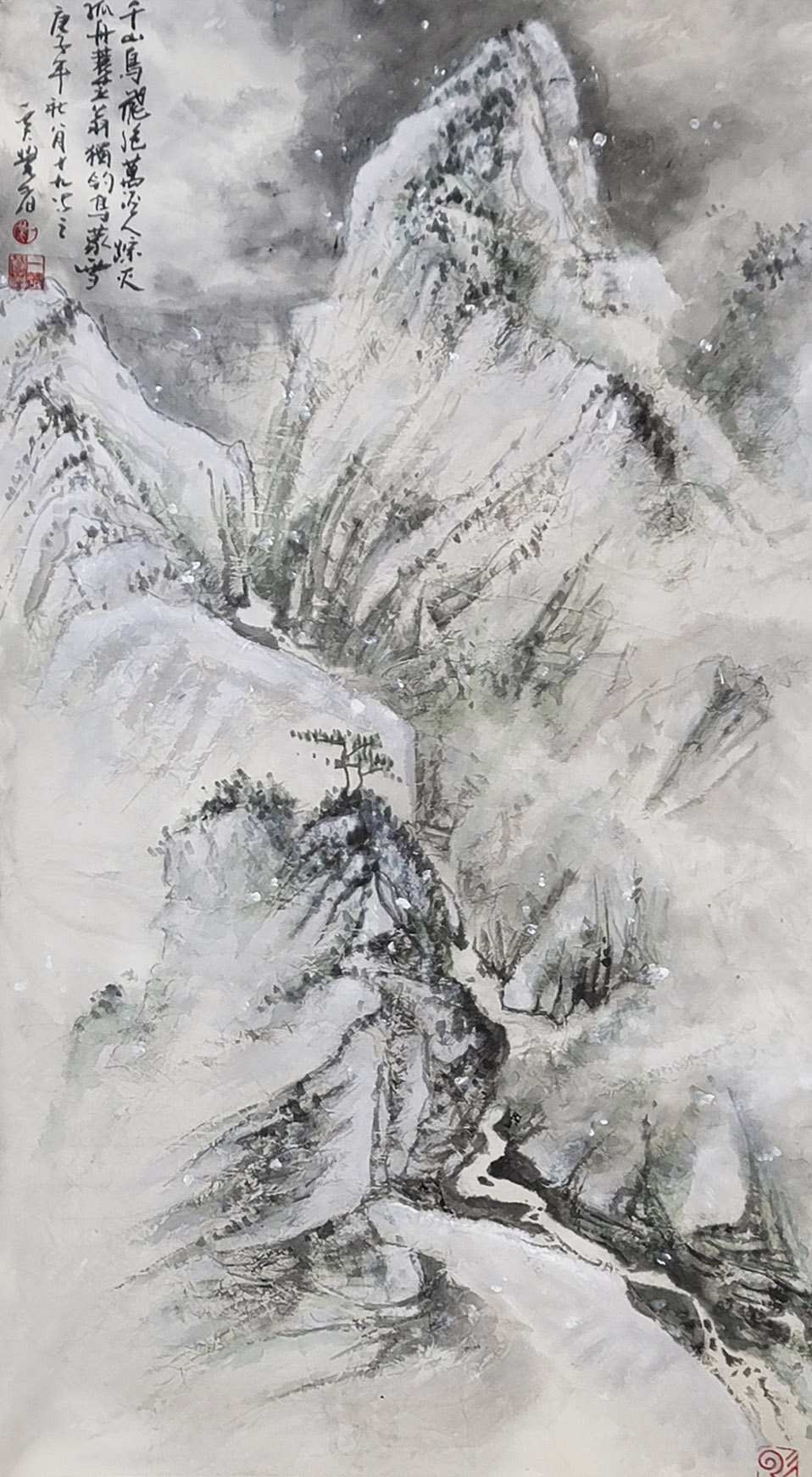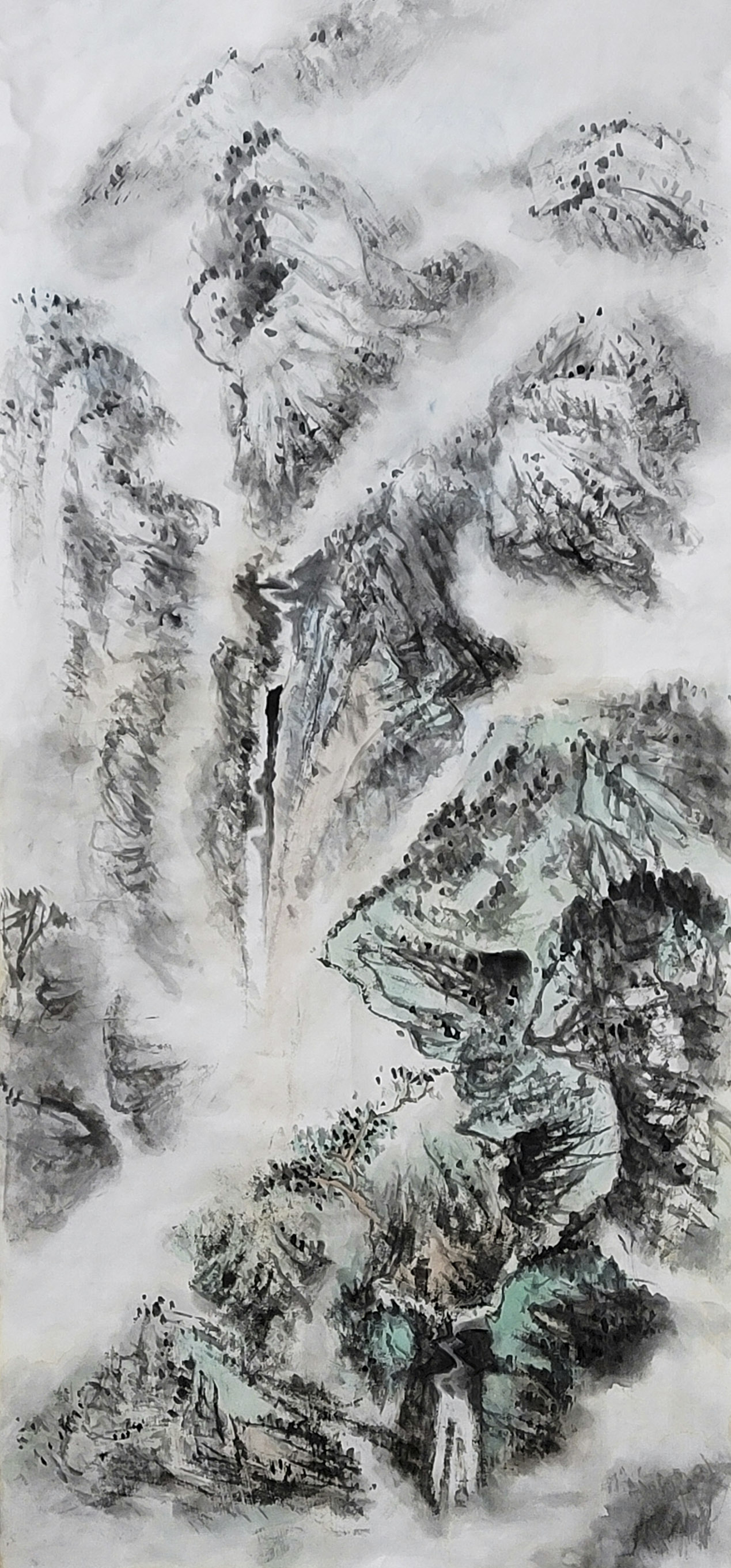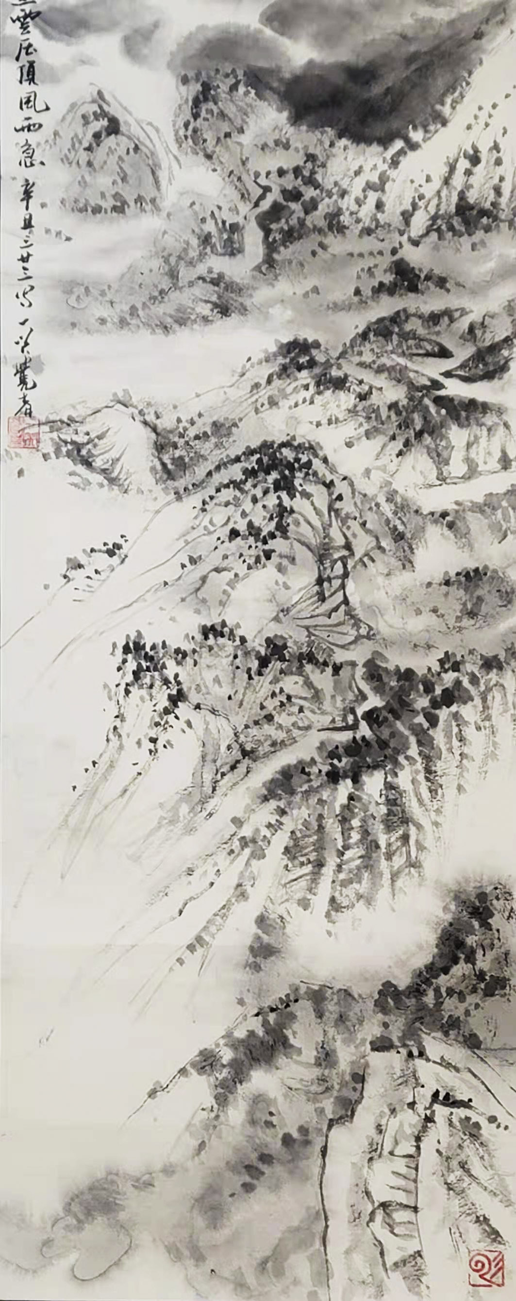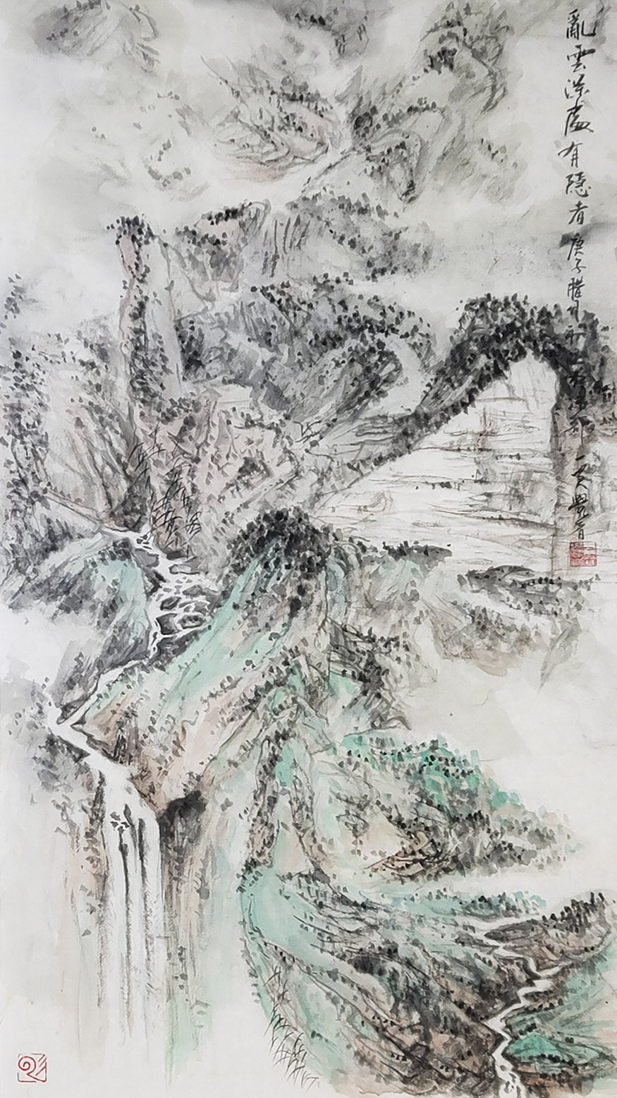 一笑觉者对历代大师作品心追手摹,尤其对近代山水画大师黄宾虹、陆俨少钟爱有加,在不断总结、探索的过程中形成和完善了自己独特风格的表现技法——泼水法。以这种独特的表现技法,描绘出了乌蒙山水的烟云变化,体现了云贵高原山水的险峻,曾有诗赞乌蒙: