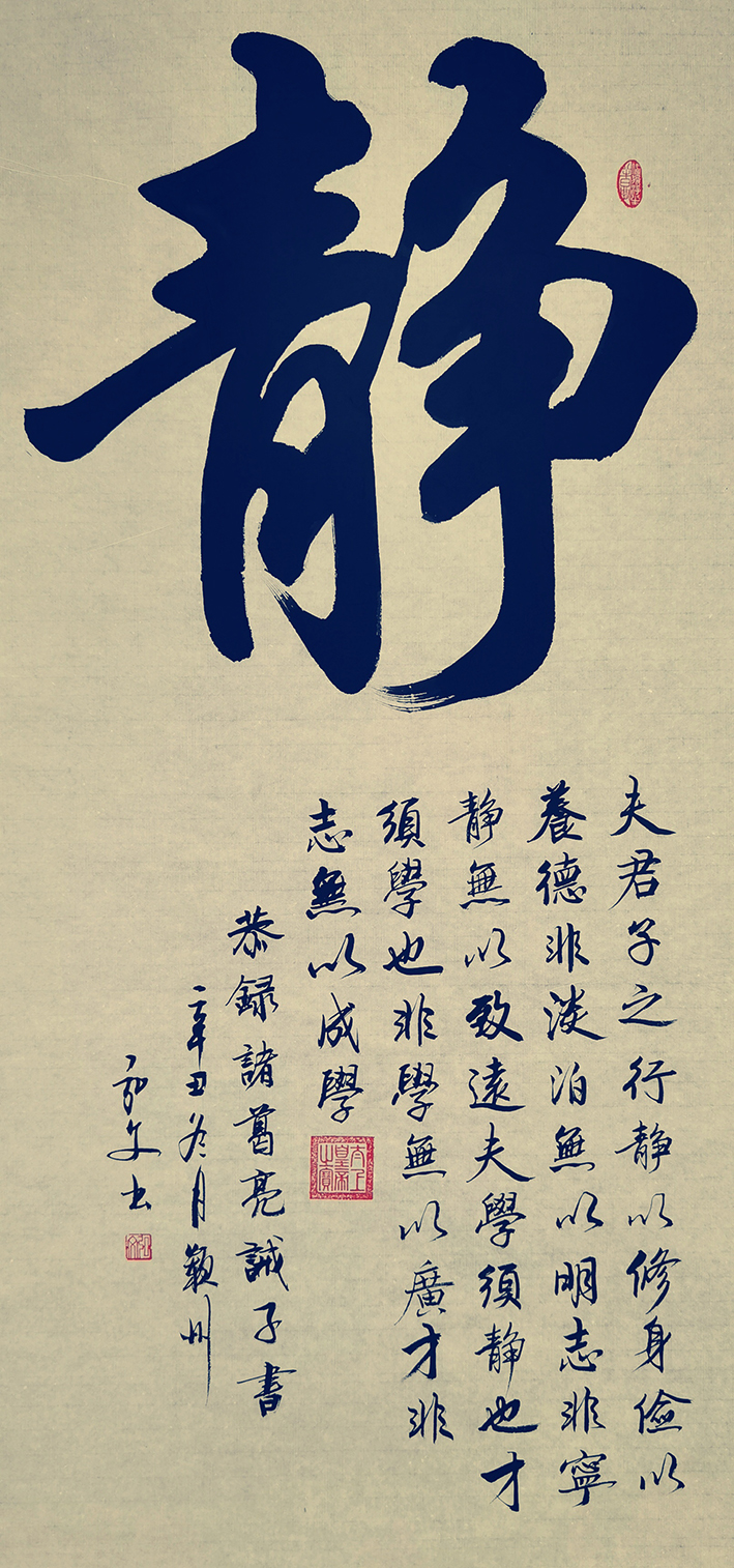 我不知用何种方法介绍中国书法,有朋友一定会问我:中国书法是什么?我会很自豪的告诉你,中国书法是中国特有的传统的汉字书写艺术或书写方法,这里强调的是汉字,如果离开了汉字,就不叫中国书法了,阿拉伯文、拉丁文、英文等文字的书写也叫书法,特有的传统的指的是中国传统的文房四宝笔、墨、纸、砚等工具,离开这些传统的笔墨纸砚书写的书法,比如用刀、筷子、头发、勺子等工具的书写,我不否认它也是书写汉字的补充,姑且叫写字,写字与书法是两个概念,有人认为“写字就是书法”。其实,写字和书法完全不是一码事。简单的说,写字主要是实用,书法则是供人们欣赏的一门艺术,它除了保持一定的实用价值外,更多的是以艺术的形式、依托于一定的对象,表现出或娇媚、或端庄、或雄伟、或潇洒、或飘逸。当然,写字与书法两者都要体现出美感,但美的境界不同,一种是朝着使用美的趋势而发展,一是朝着艺术美的趋势而表达。并经过感情之动态而弛思造化,冲破“法”而获得“意”,以抒发自己的感情,使字的气势风神表现出艺术的美和魅力,给人以熏陶作用。而实用的一面,虽然也要表现美,但所追求的并不是跳跃、飞动、神采,而是实用、普适、专用,也就是要将汉字书写的上下方正,前后齐平,左右均衡就可以,没有那种心旌摇荡,心弛神往的感觉。