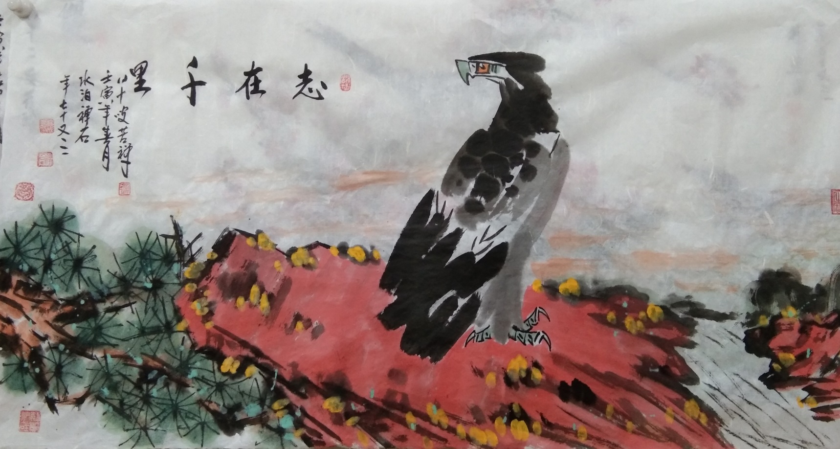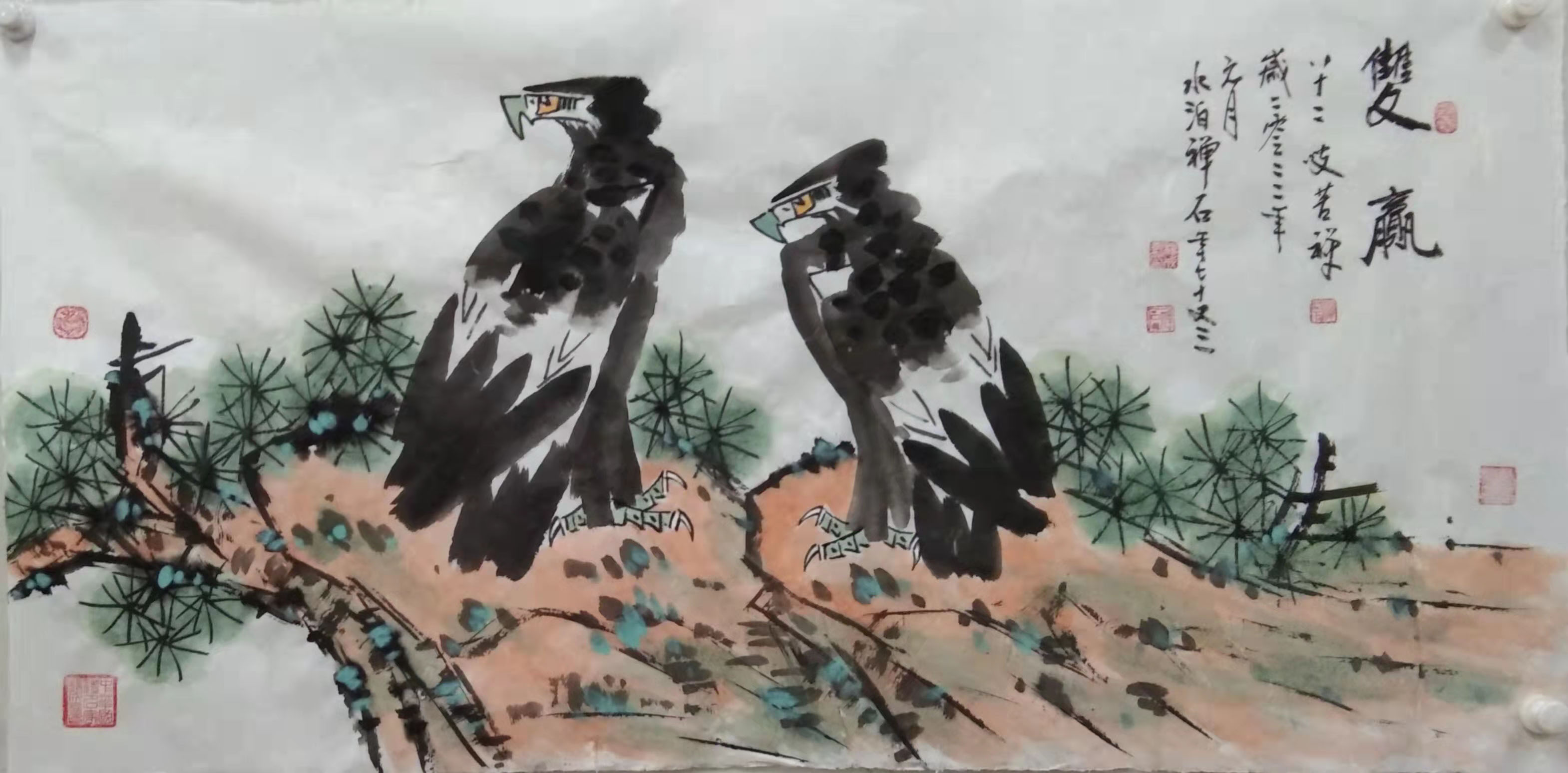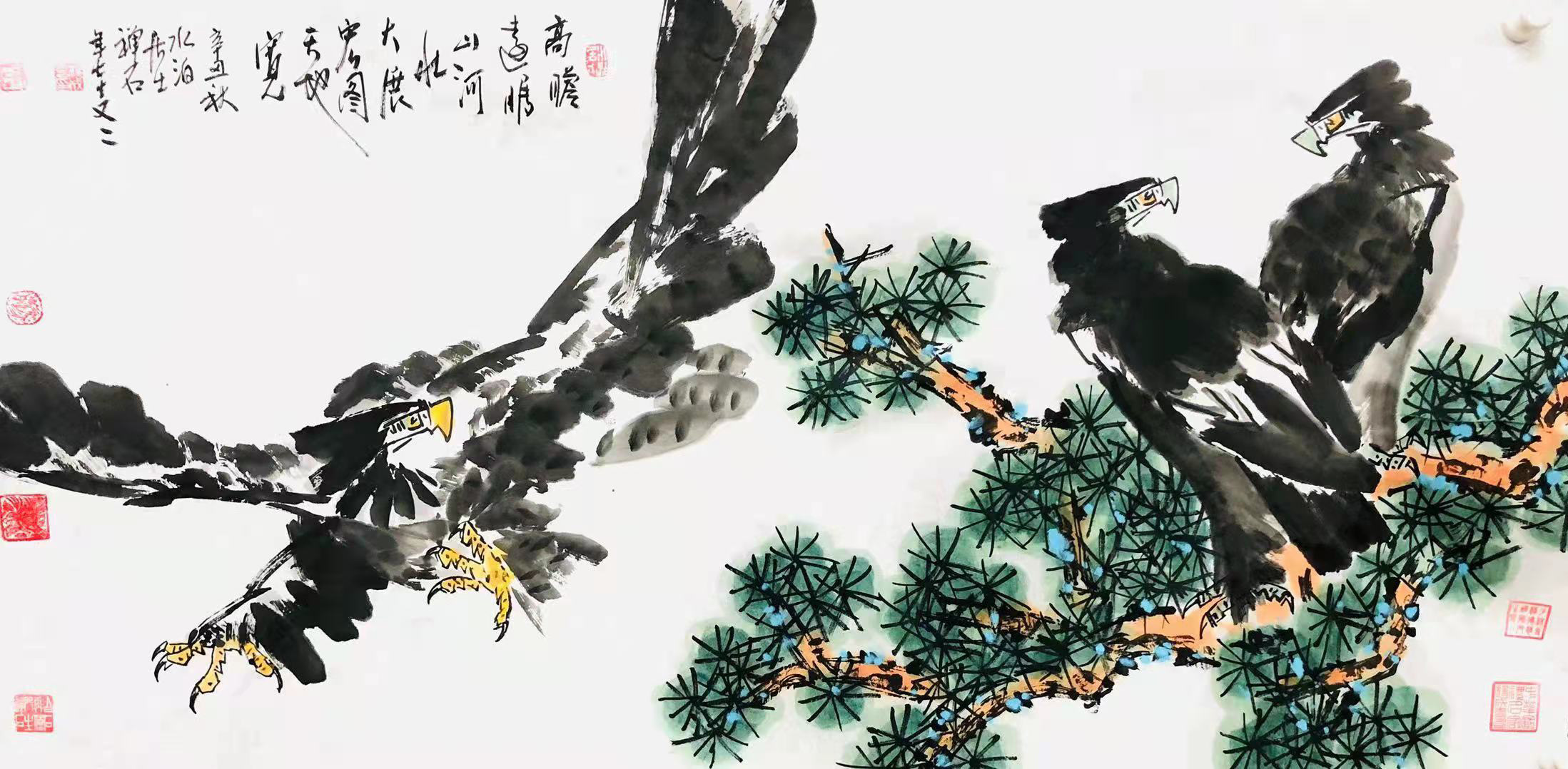 《鸿瑞》图七十一只鹰被收藏,《双鹰》 《单鹰》《长寿图》《盛世高歌》《春颜》《荷花》《牵牛花》等作品被收藏,作品鹰被上海吴昌硕纪念馆馆长吴超老师收藏,提名为鹰王称号并篆印并拍卖。