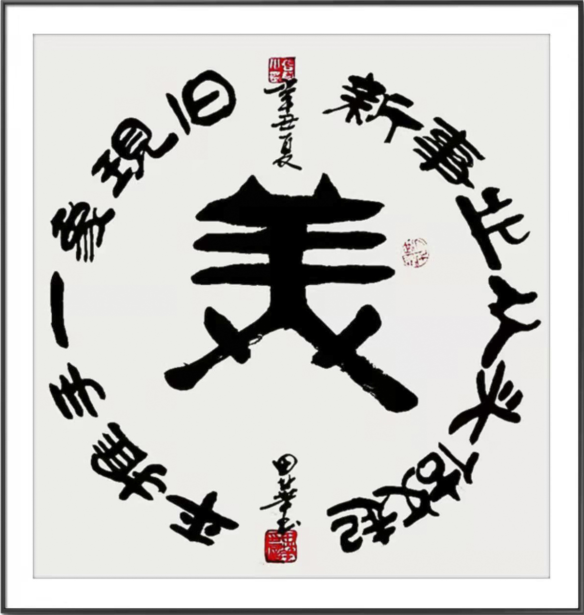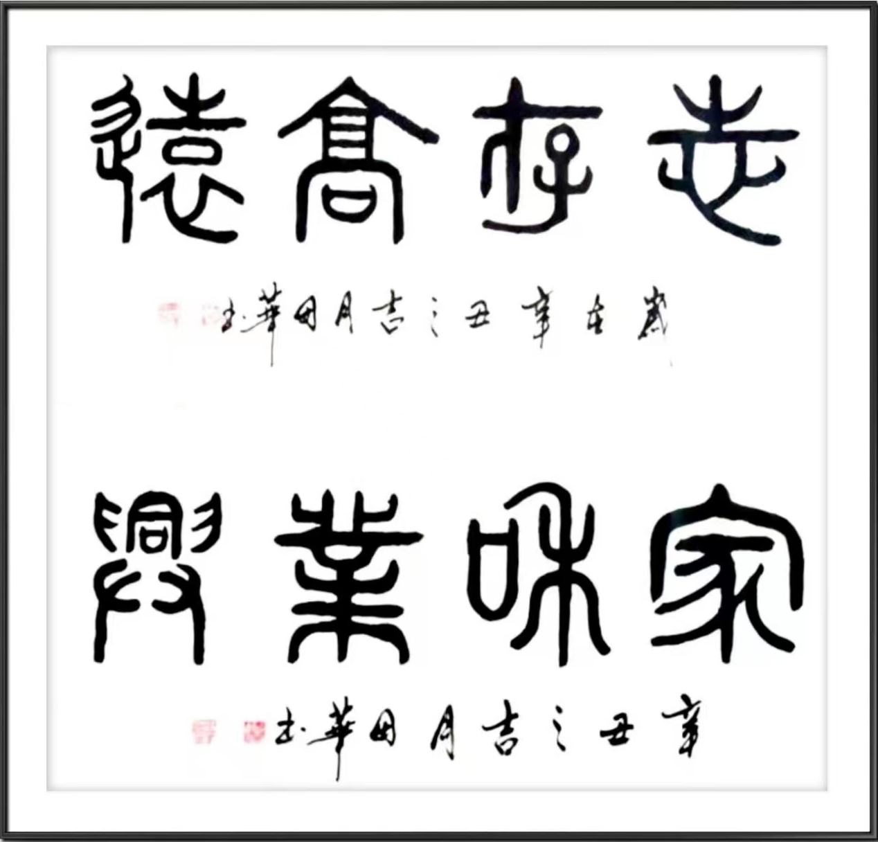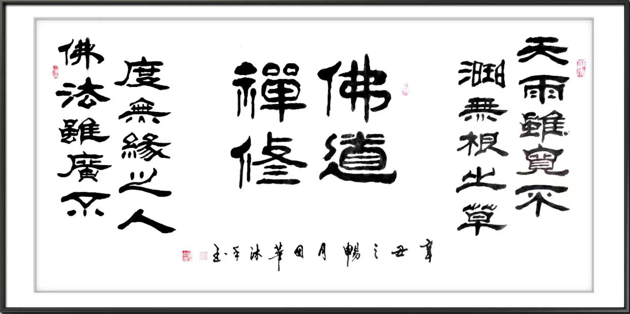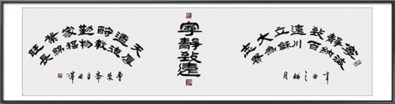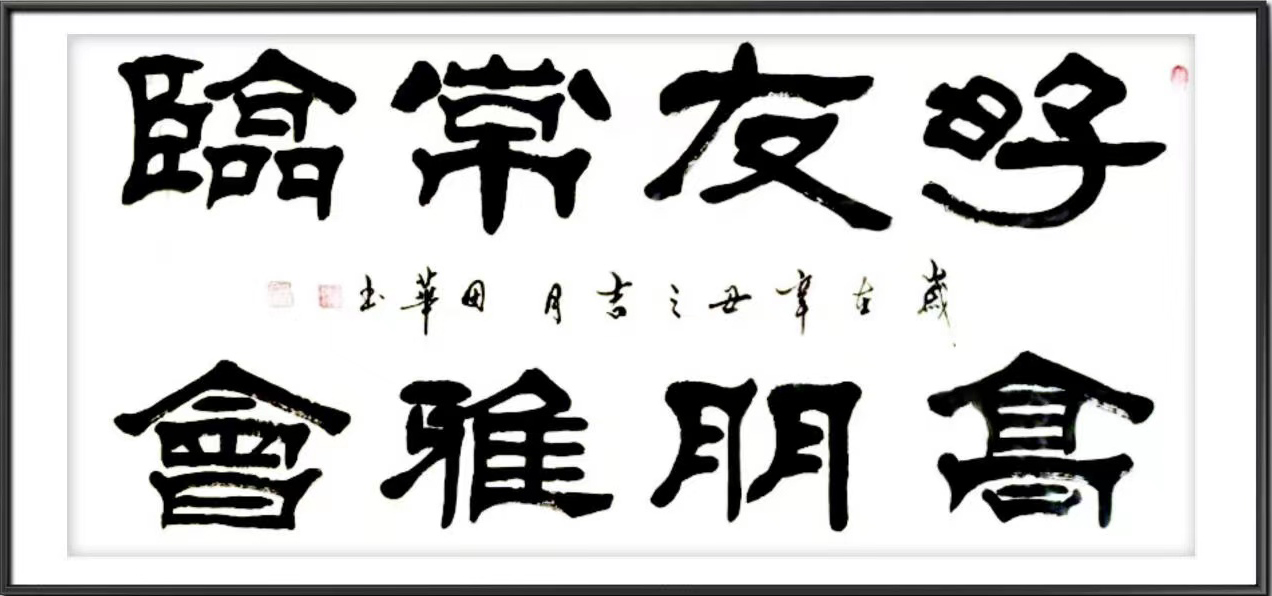 他自幼酷爱书法、篆刻艺术,博学众长、独辟蹊径,40余年临池不辍,楷、隶、美术体等各种书法兼收并蓄,且有所创新,他的书法字如其人,字里行间透出本人的性格,他精于隶书自成一体,撇见其境,捺见其界,初观给人新颖,耳目一新,细察如赏画卷,耐人寻味。在蚕头燕尾的基础上,标新立异,用书法之笔意,展现绘画之意境,达到大俗大雅之境界。