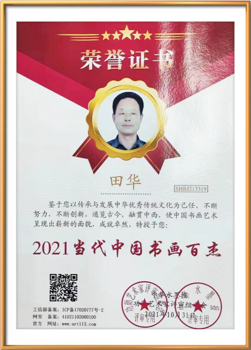 田华,1989年7月中国书画函授大学毕业,师从欧阳中石。现为中国书画家联谊会书画教育工作委员会委员,中国国家书画院特聘书法家、联合国可持续发展目标推进委员会公益书法大使、温哥华中国书画院院士、中国硬笔书法家协会会员、CETV水墨丹青书画院会员,山东省老干部书画研究会会员、北京华夏诗联书画院助理研究员、临沂市、区书法家协会会员,国家一级美术师,建党百年授予全国艺术楷模,入编书画师资数据库。