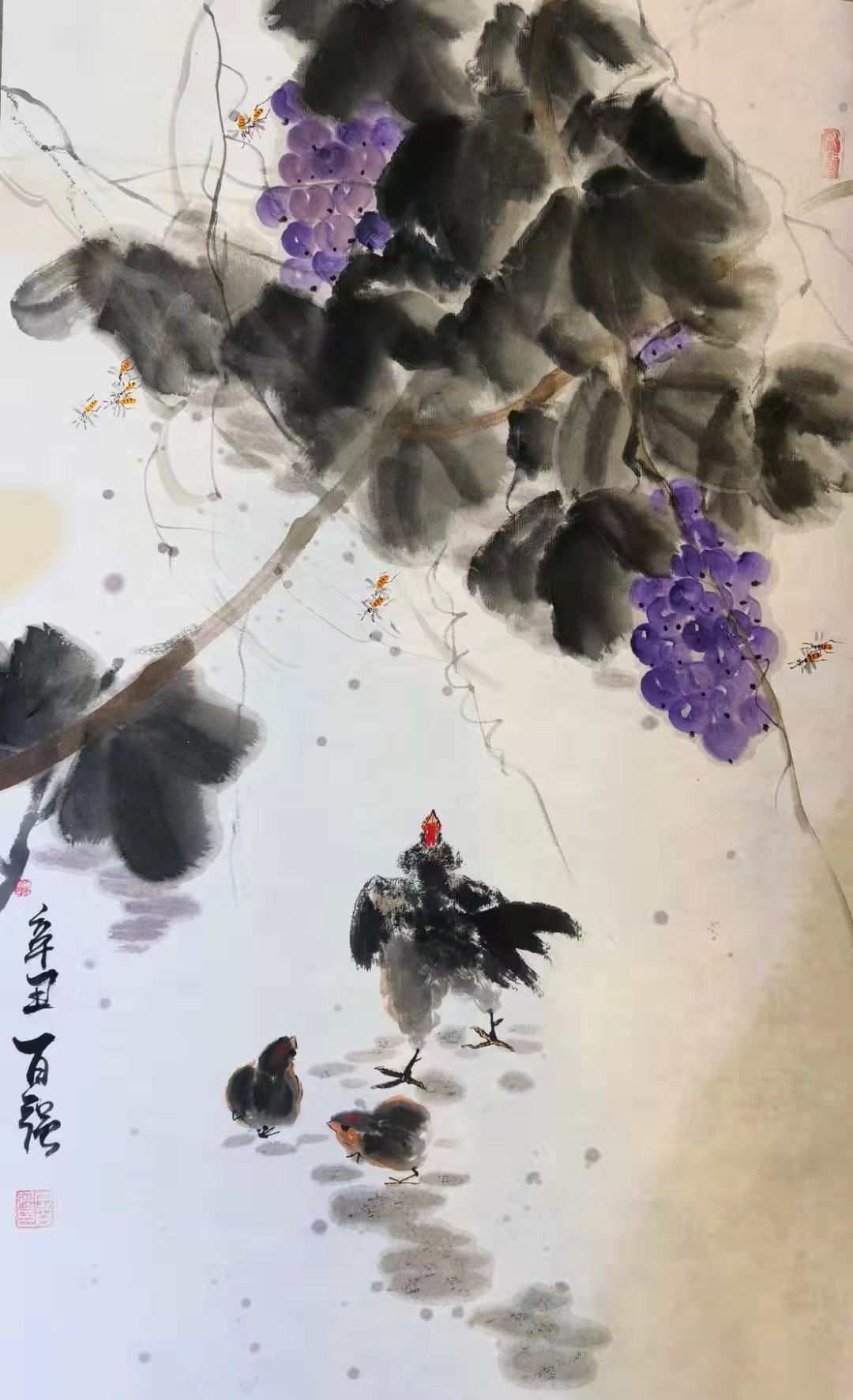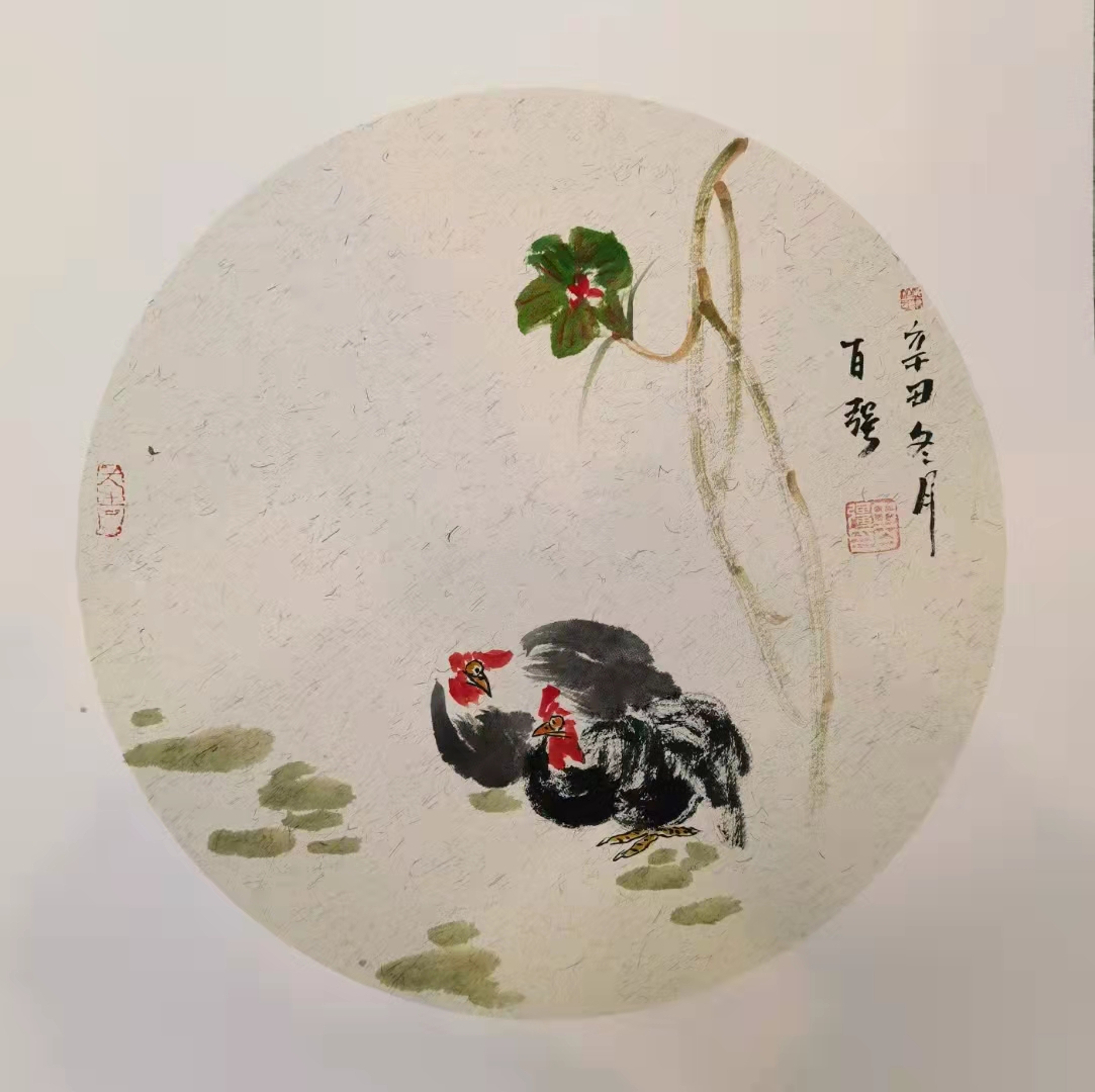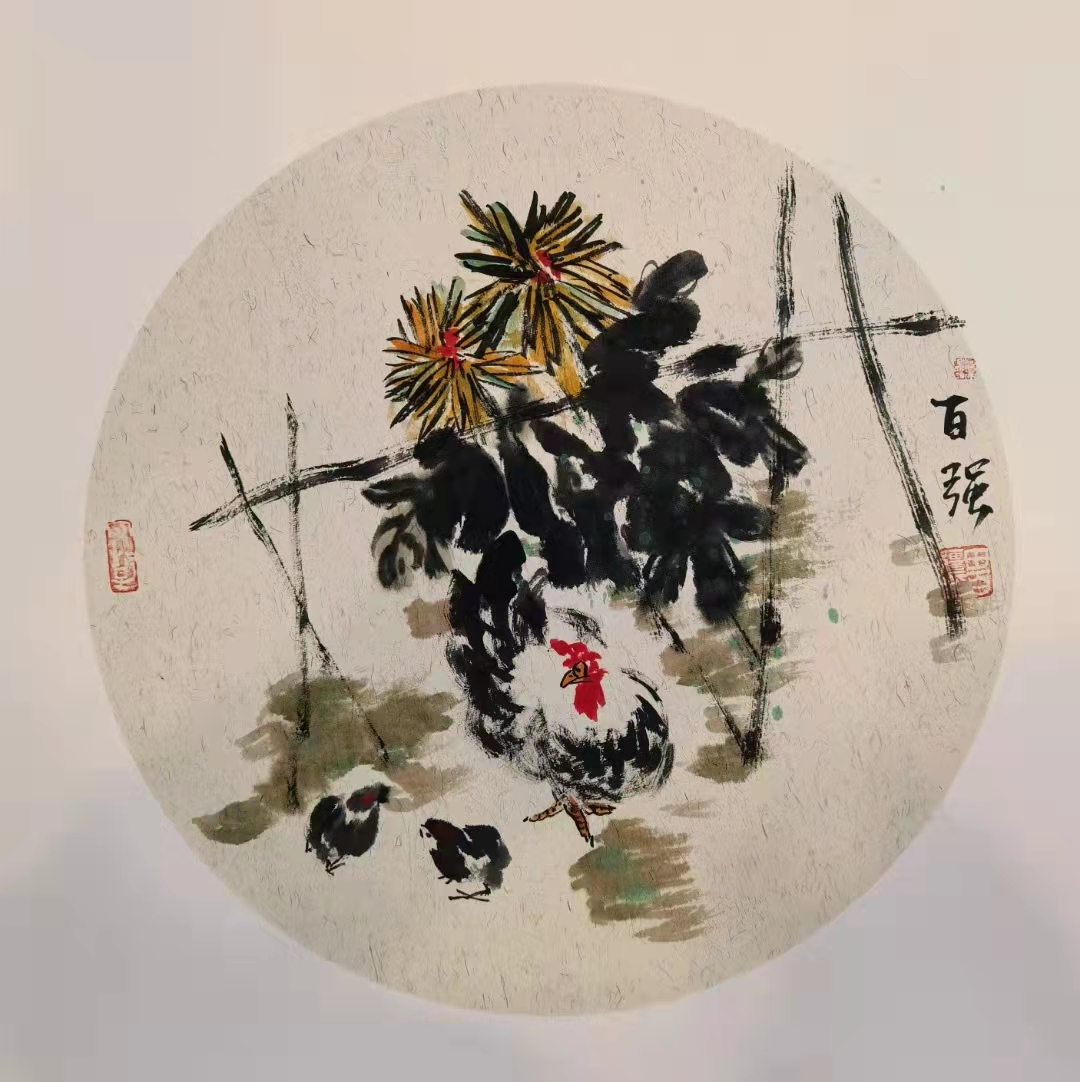 百强选学的是写意花鸟画。齐白石老人对中国写意花鸟画的造型要求是在“似与不似之间”,要求既不“媚俗”,又不“欺世”。百强在其画中就充分体现了这点。他的画既有黑与红、赭与青的色彩强烈对比,又有工与写、巧与拙的技法展现。在他画的草虫类花鸟画中,利用赭石画稻谷,用墨画螃蟹,用花青草绿画草虫等等,均能体现传统花鸟画的笔墨特色。尤其是他画的《红枫螳螂》中,利用曙红的浓淡鲜活、透亮画出枫叶,浓墨干笔画出枫树枝干,使画面产生强烈的对比;而且在左下方的画眼处工写出一只干笔淡墨浅赭色的螳螂,显得笔墨精妙,生机盎然。落款与用印亦恰到好处的起到了打破枝干两端的均衡,有稳定画面重心之妙用。