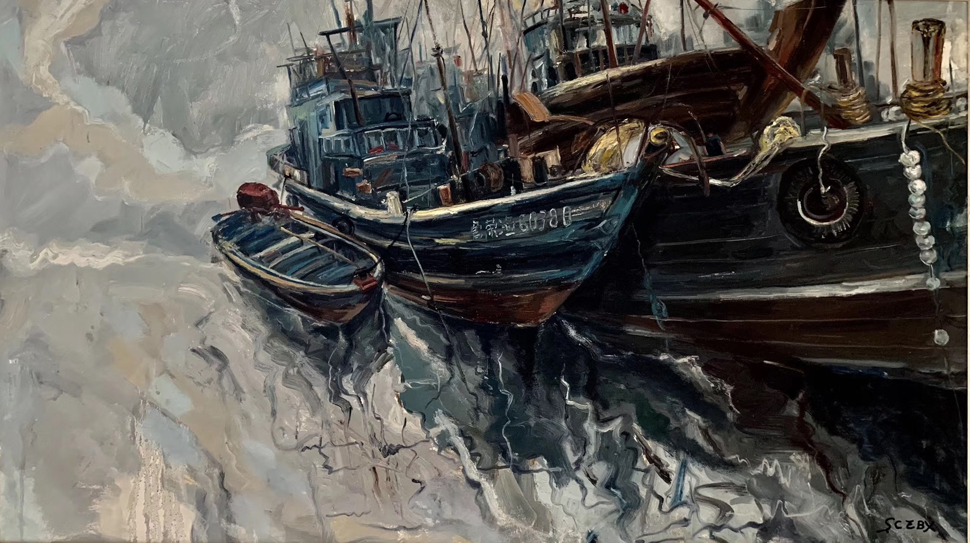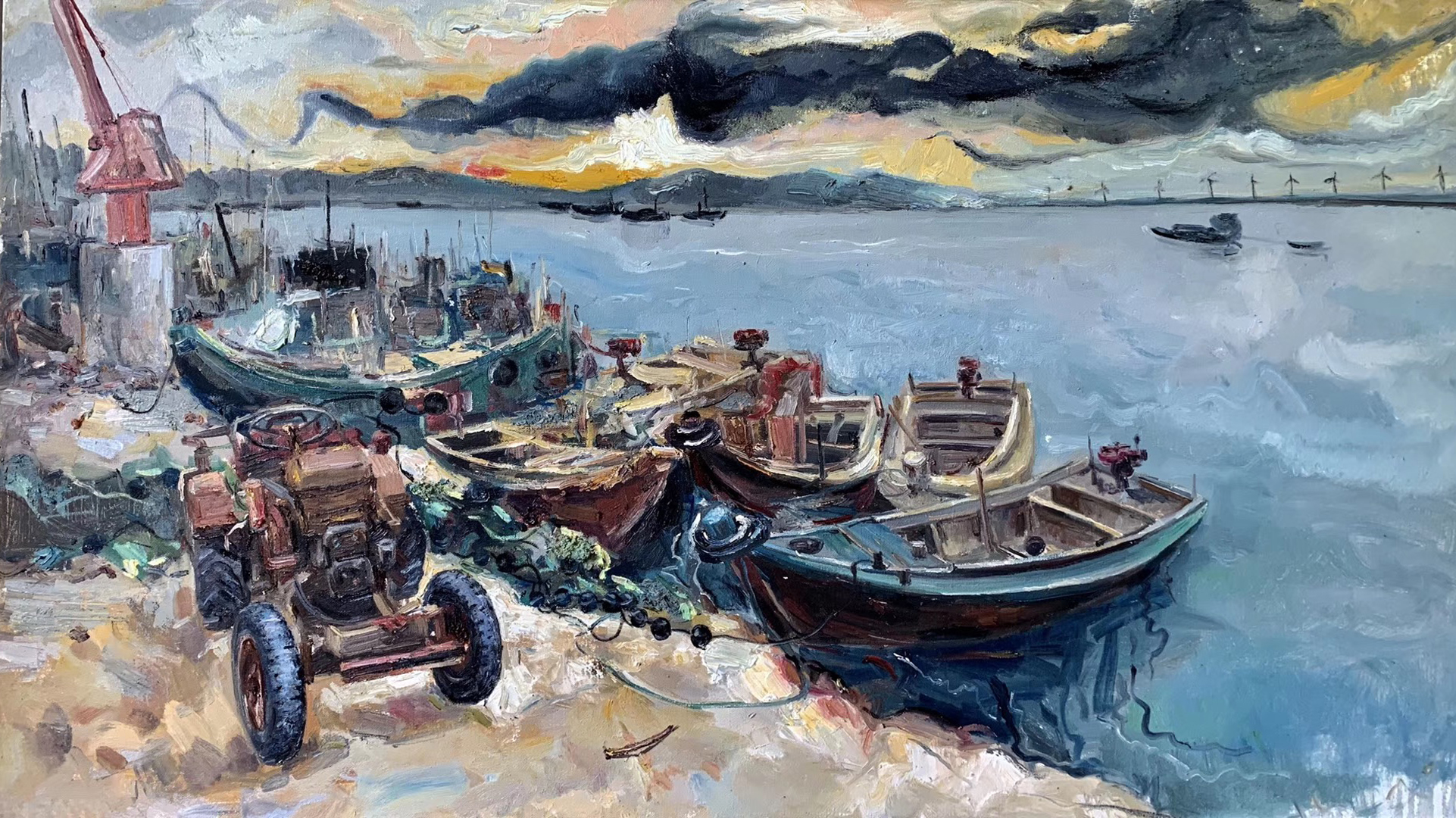 油画:作品名称:《南方的船场》2020年9月。 尺寸:40X70