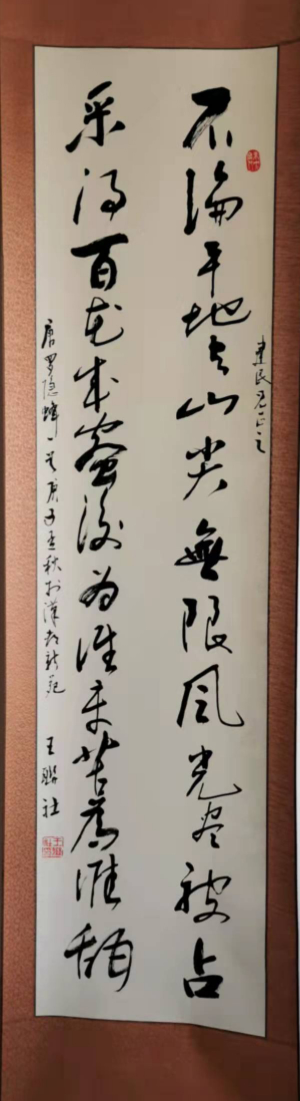王联社,笔名,墨之。网名,未央王,陕西省西安市未央区人,生于1956年,汉都新苑西马寨人,王老师从事教育工作18年,后在未央区安监局任局长,退休后习二王行草,又喜临摹于右任千字文,及历代大家名帖,善行草书,更善毛体书法,作品端秀清新,笔力雄健,富于变化,笔走龙蛇之际,又不失古朴高雅,王老师是西安市书协会员,王老师联系方式13325388800