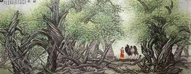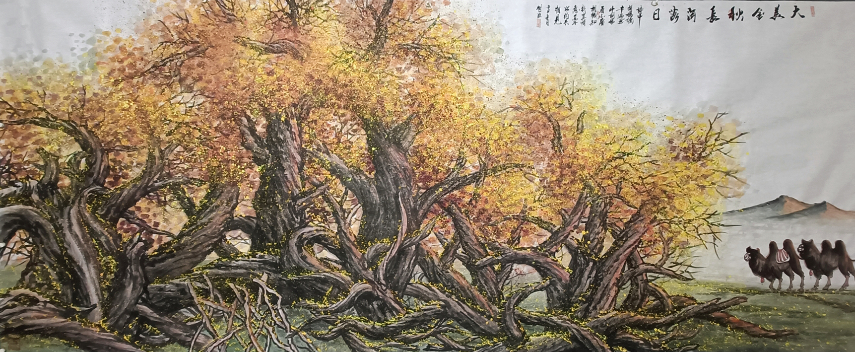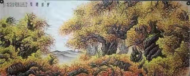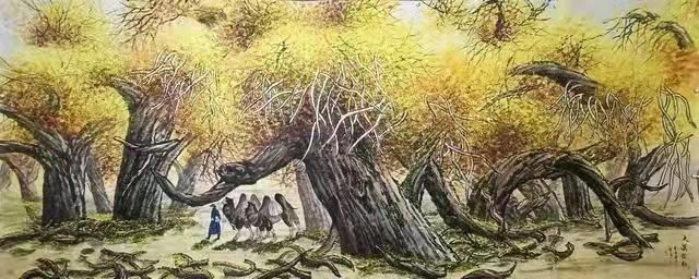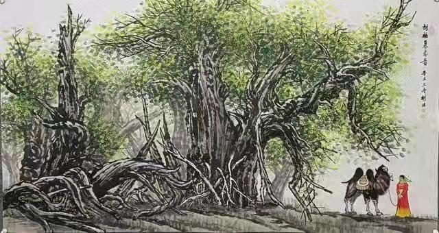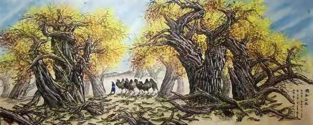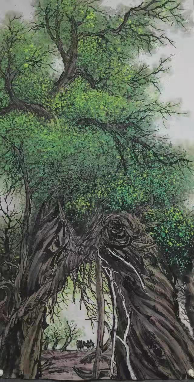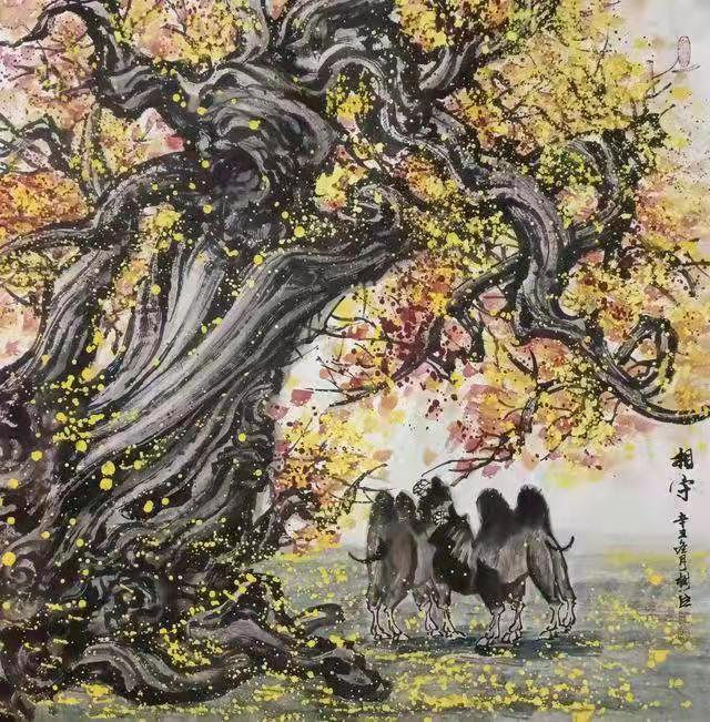 苍茫的大漠、劲倔的胡杨、坚韧跋涉的骆驼都是他取之不竭的创作源泉。胡杨树生而千年不死,死而千年不倒,倒而千年不朽,世人称之为英雄树。干旱之处,盐碱之地,不改妩媚风姿,坚韧地屹立于天地间,一梦千年,不改初衷地执着坚守,令人敬佩,胡杨已经成为中华民族坚韧不拔精神的象征和载体。他用独特的视角,笔耕不辍地描绘出“沙漠勇士”的英姿,向世人展现出一幅幅姿态各异的英雄之树。他笔下的胡杨画,构图讲究、布局合理,无论远近分布、疏密相间、大小搭配、高低错落、动静结合都既合法度,又独具匠心,具有强烈的民族意蕴和超强的现代意识。