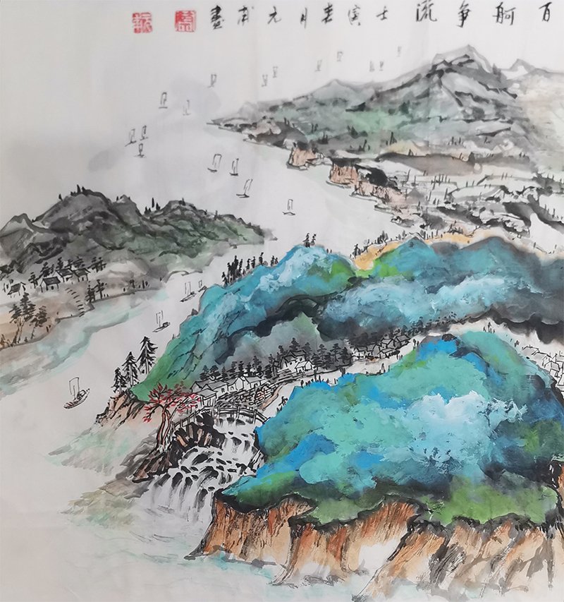 中原文化人杰地灵 成就了一代又一代的艺术大家,今观蔡元甫先生的丹青妙作,亦可以感受画以载道的精湛。他是当代山水新派伏羲画派的开山鼻祖,在他的画里可以看到丹青文化古今相续,再写奇观的表现力,不由感叹:丹青渊妙,代不绝人,青绿浅降,又见奇迹!