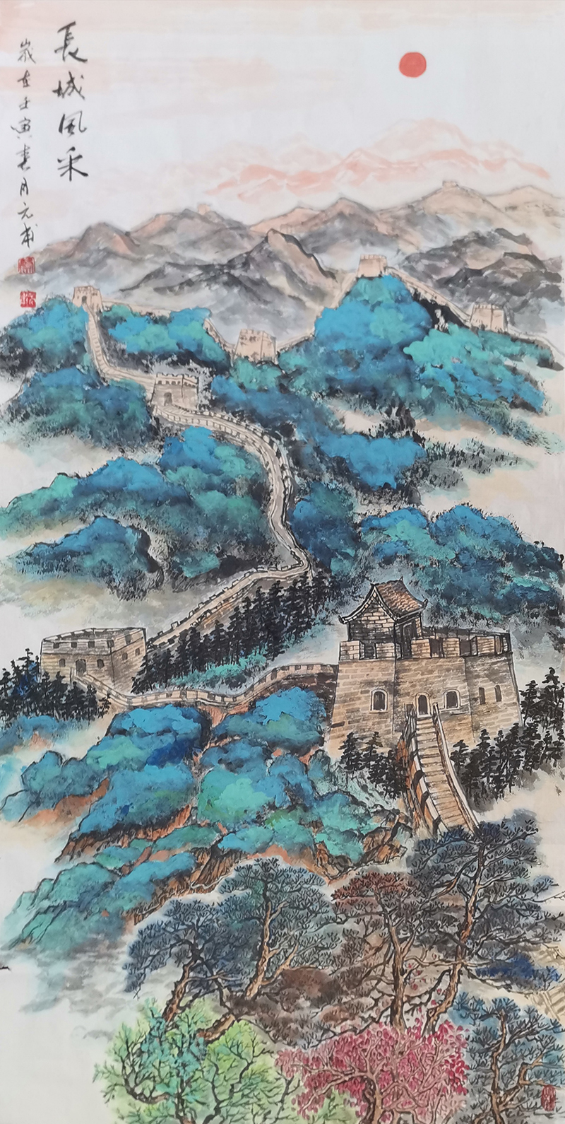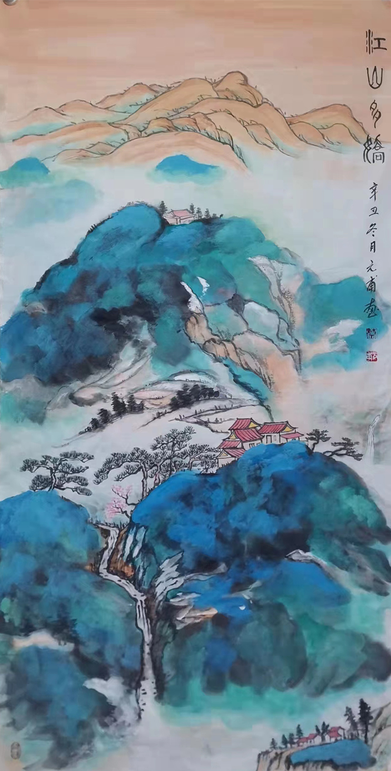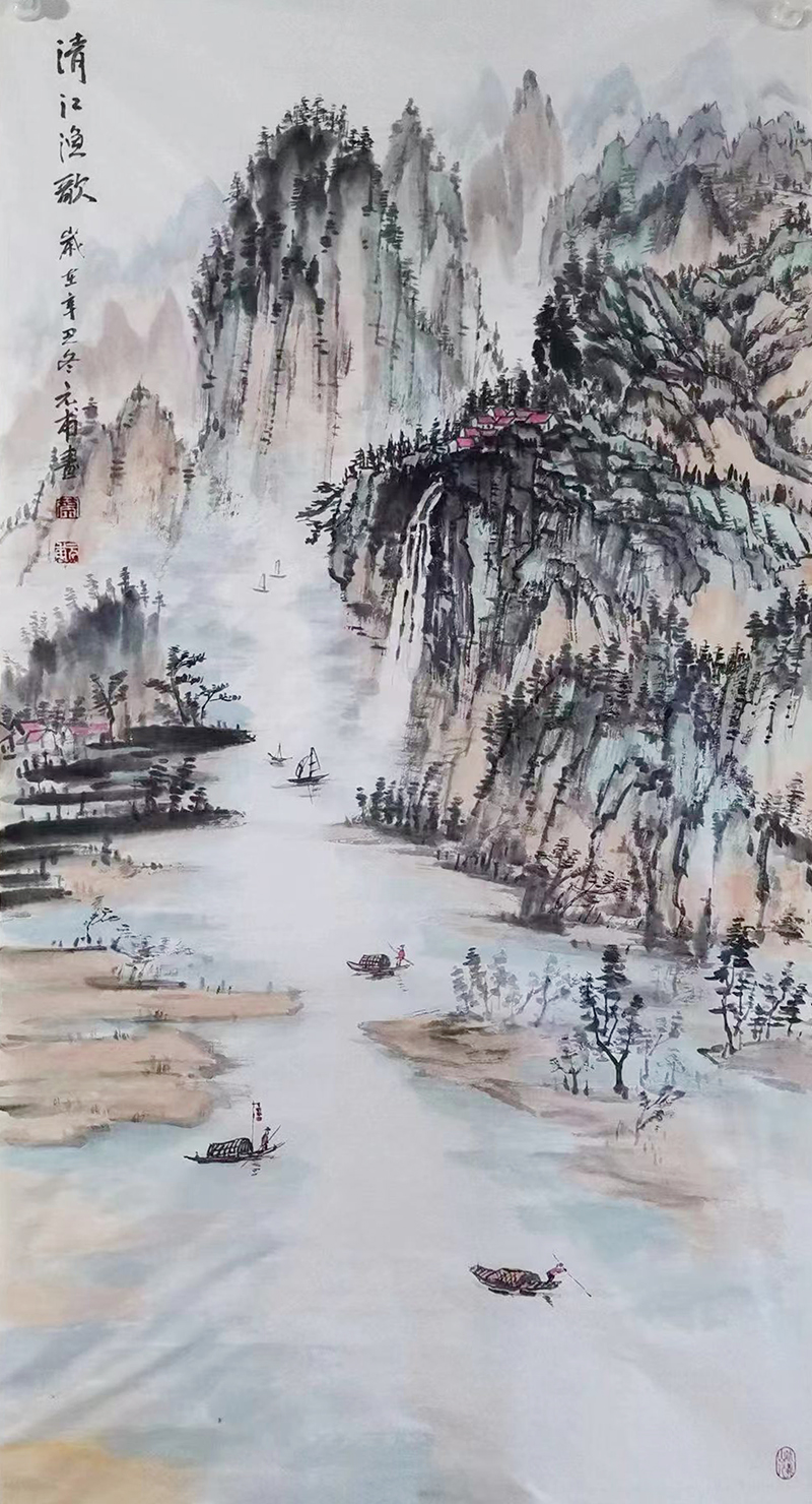 伏羲画派开山功,青绿浅绛自然风。搜尽奇峰打草稿,在与天地精神往来的交流中,他把山水的文化属性变焕成丹青的妙有,让青绿浅绛源于自然,成于心田,正是外师造化中得心源的证见。挂一件这样的山水在厅堂,蓬荜生辉,雅俗共赏,雄才之所作,必然成为经典永流传!