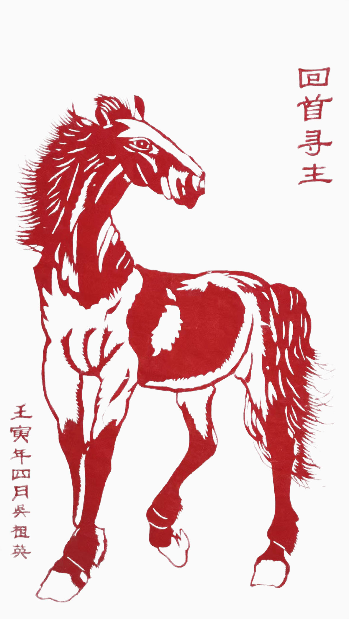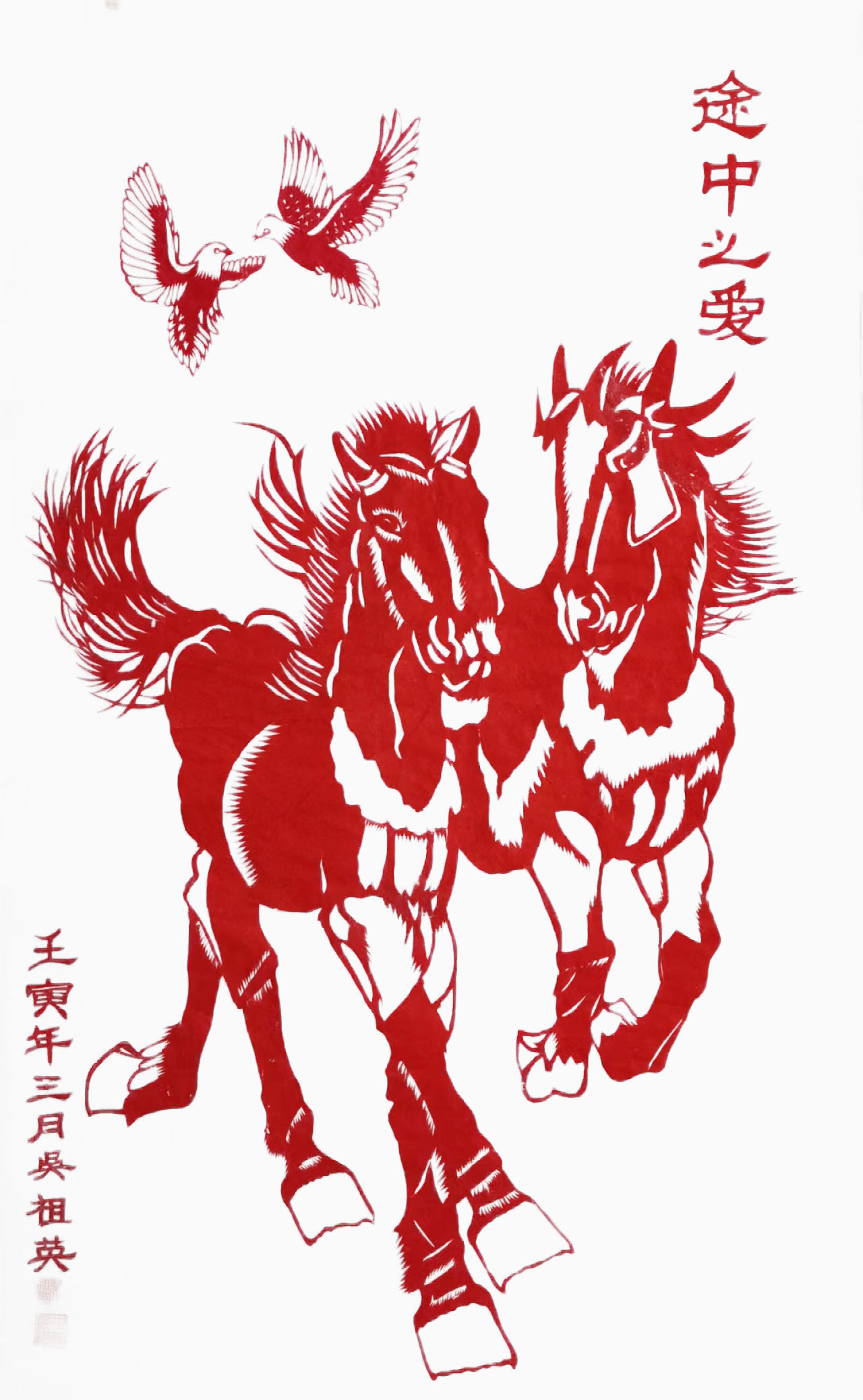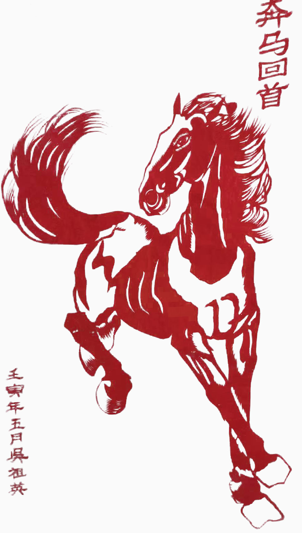 在技法上,吴祖英女士也是能尽显出自身的创作悟性,所剪物象无论是以人物为主题也好,还是以骏马为主题也罢,她都是能依靠于极高的剪面层次来衬托出形态的调和对比,旨在二维的层面上塑造出三维的玲珑感和剔透感,所剪空白,也是恰如篆法刻韵,时而阴剪,时而阳剪,相互搭配,古拙有力!强烈的立体感,让平面艺术如飞映于眼前,果然是活灵活现,惟妙惟肖!而作中的细节处理也是可彰于十分,那娴熟的剪刀技法不仅是能随心所欲,同时也是能根据相映的装饰元素来剪映主次,细节观之精微,粗细搭配有致,美感效果,足见深厚!