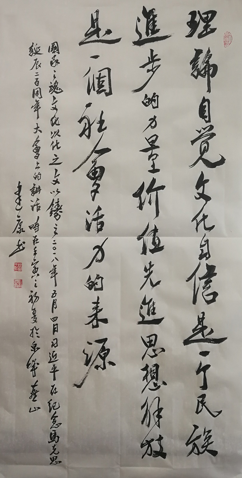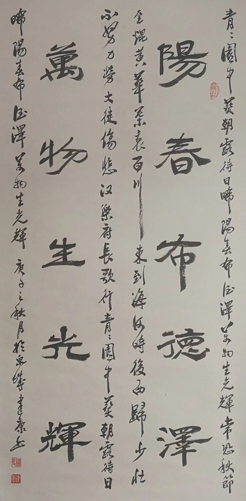 于行书创作上来说,杨建康先生的师法之径自然是有师正道,二王根基笔墨挺拔,笔线俯仰错落之际,也更是独具于超然书风!而相对于一些我们所常见的展览式书法作品,杨建康先生的行书造诣也显然是最得雅俗共赏之妙,字字散淡而取飘逸,通幅立品而达和畅!不仅如此,在个人文化内蕴的高度融合上,杨建康先生的众幅行书造诣也全然是能独昭性情,是谓笔随心动而墨随情变,性灵书法,雅俗共赏!