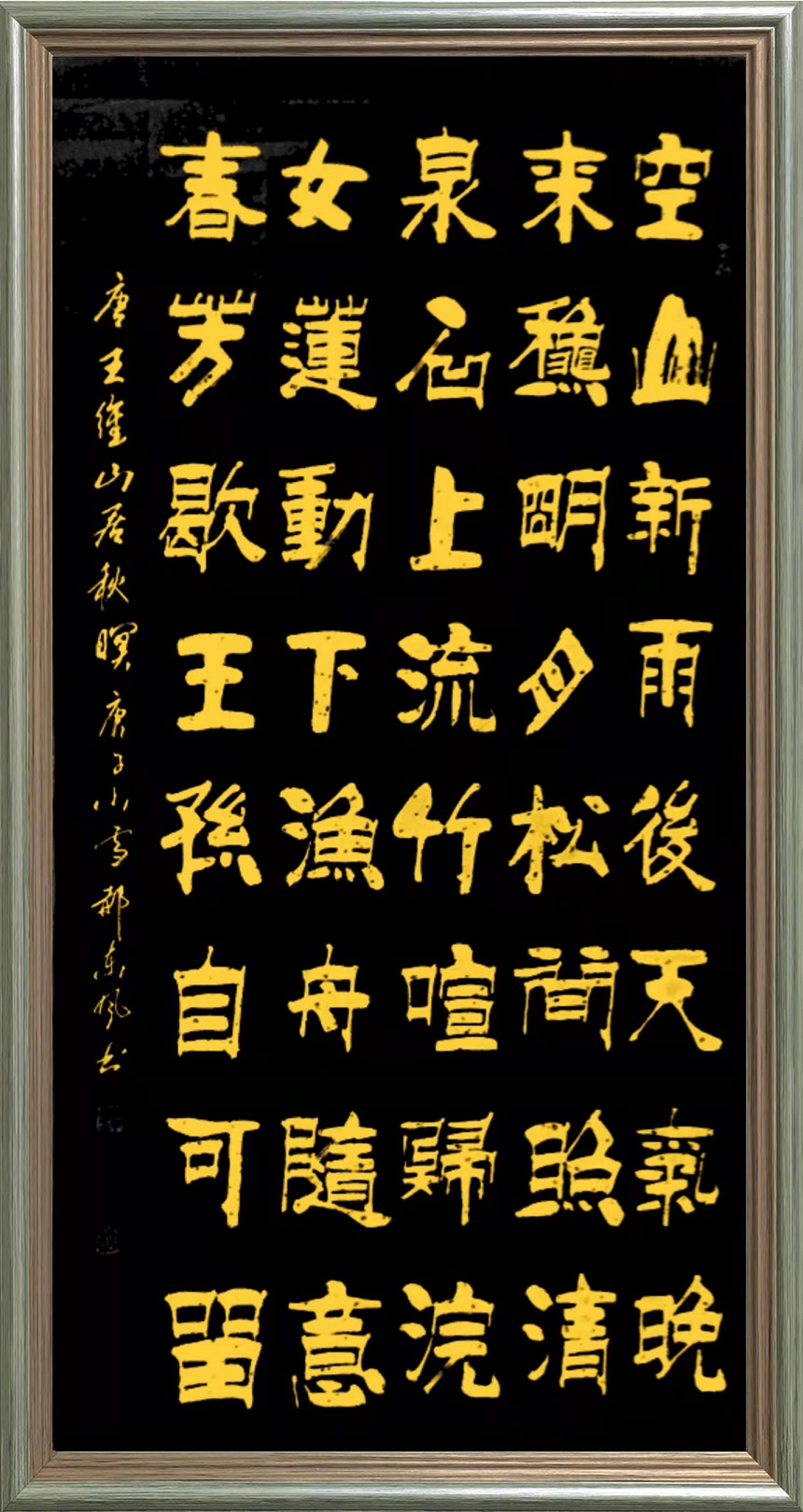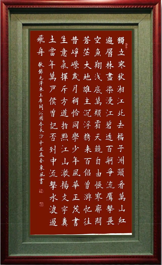 有一件书法家郝东风先生的书法作品《独立寒秋》,一经入目,楷精法详的精气神,就足以令人万分折服。当代书坛,多少是存在一些浮躁风气的,其表现就是不修楷法,结果根基不牢,令江湖书法比比皆是。现在看到郝东风先生如此精研的楷书作品,真是令人大振心颜!其楷书取法唐楷之严谨,稍带魏碑之方整,写得法度精湛,一丝不苟。写透了颜筋柳骨,还有欧楷以奇立笔,以险结构,最终复归平正的丰姿多神。由此作品,可以证明郝东风是当代书坛的中流砥柱,果然是楷法无欺,写得一手锦书金字!