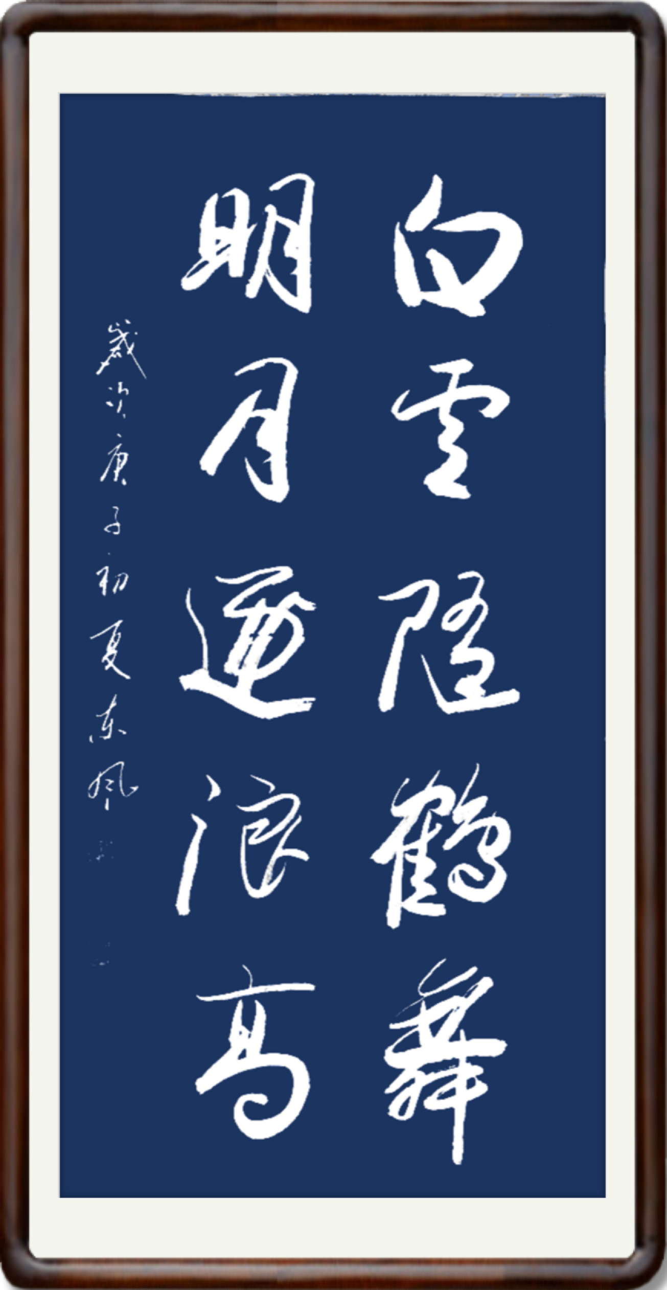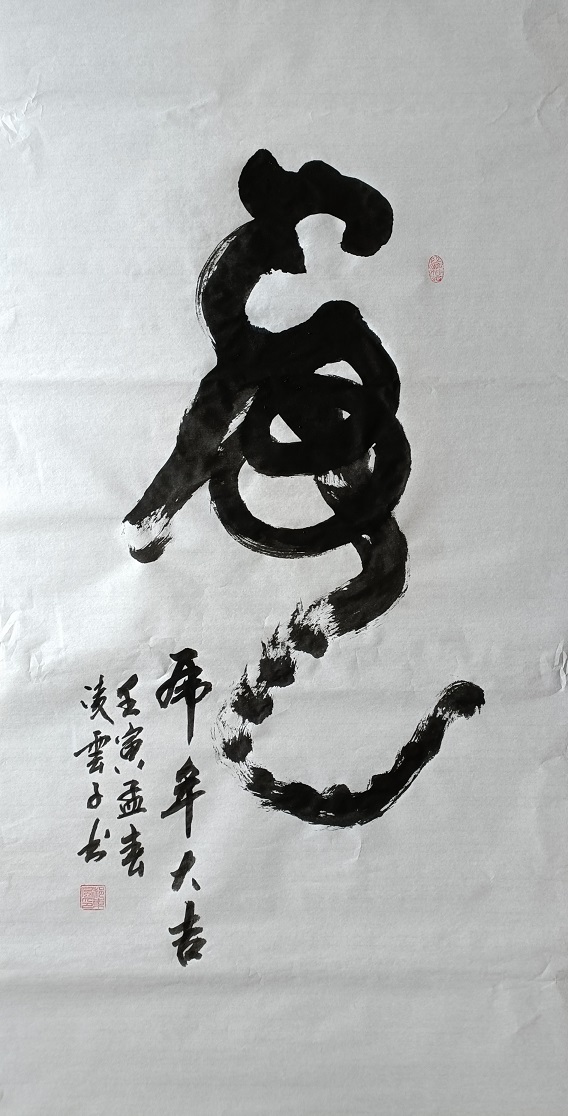书法是线条艺术,只要线条塑造得惟妙惟肖,行草创作就可以遂心应手,炉火纯青。这种书法境界,在郝东风的行草里大有可观,他执笔写行草,非常重视线条的塑造效果,比如狂草《虎》用速度与力度的千千万万种变化,来保障书法线条的生动活泼,无有一笔呆板,无有一字僵化。看速度,有快的惊雷驰电,有慢的落花飞雪。笔里有墨,墨里有笔,诡形怪状翻合宜,心手相师势转成!看力度,大笔一挥,凌空杀纸,千钧之力,力透纸笔,线条浑然厚重,势如乌云压城。轻写一笔,则使转自如,让线条在牵丝映带的塑造中,表现出纤纤如新月之出天涯,落落犹众星之列河叹的要妙趣味。比如《白云随鹤舞》既可以写虬龙蜿蜒,也可以写鸾凤徘徊,笔墨线条印象灵动多变,让其书法拥有无限的观赏魅力!