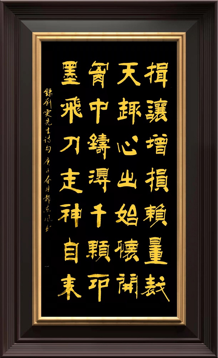 心追手临碑帖功,借古开今时代风。又见《揖让增损》这件作品,崇尚书法古风的郝东风先生,没有拘泥于一家一体的限制,而是带着诸体融合的思维,作出了独创“当代隶楷书”的新气象。他把隶书的蚕头燕尾与楷书的严谨精致融合在一起,作出了“隶中带楷,楷中带隶”的书法新印象,成为“郝楷”惊艳的一扇窗口。经于这个窗口的探究,人们可以看到郝东风的书法是从古风来,朝向未来去的独特方向。在这个方向上郝东风以及他的书法开拓了传承与创新的新天地,令书法渊妙代不绝人,作出了笔墨当随时代的巍仪功勋!