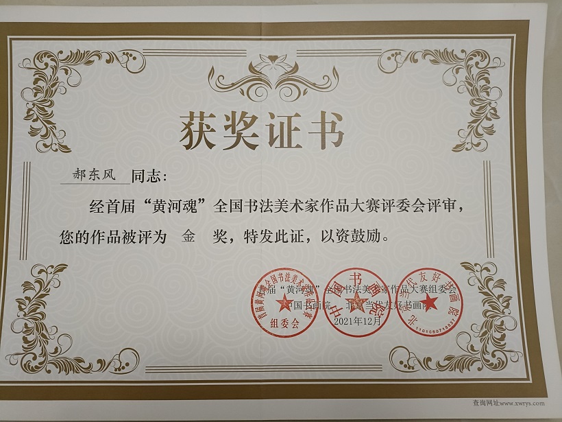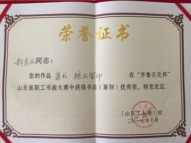 郝东风自幼酷爱书法。因学习工作诸原因歇笔多年。退休后重拾旧爱,遍临碑帖,临池不辍,尤长隶书。近年来师从各位名师书法进步显著,综合诸帖形成个人风格遒劲有力,多次参加全国、省市各类书法展赛取得好成绩。
