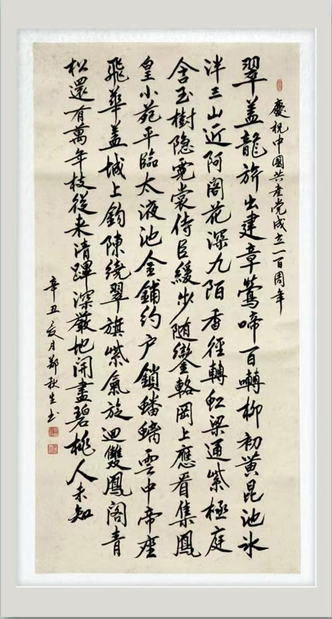 作品层参加全国各类展览大赛多次获奖,中国人民解放军建军90周年,我们的师旅书法大赛自创获奖作品《十八青春》已编入《我们的师旅},和《共同的记忆}两书中,已被中国人民解放军革命军事博物馆和档案馆收藏。笔耕书写宣传党的好政策,赞美新时代改革成果,赞美抗疫精神,赞美祖国大好河山作出了卓越的贡献。