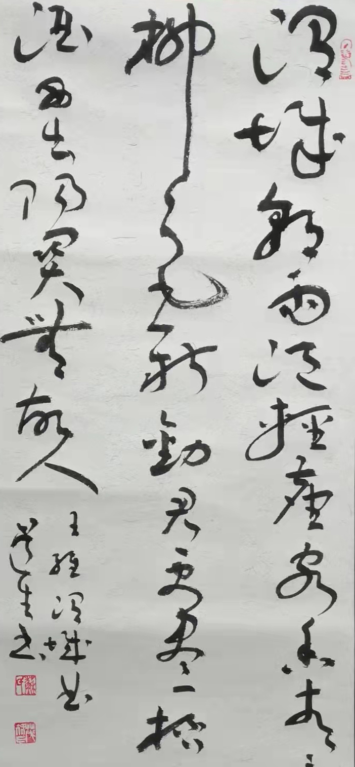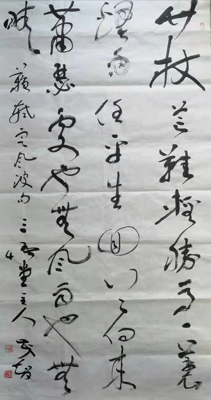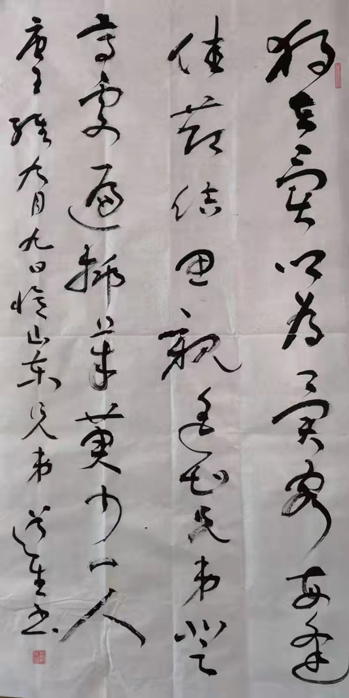 二者内蕴,则是可循以人品造势,正如唐代名家孙过庭于《书谱》一书中所言那般,是曰:“书法不过一技耳,然立品是第一关头。品高者,一点一画,自有清刚雅正之气;品下者,虽激昂顿挫,俨然可观,而纵横刚暴,未免流露楮外!”而苏茂智先生无论是立艺还是立德,也是皆有此大家品象可见,所以其众幅行草作品也就自然是风貌不凡!通幅行草所赋,时而精到畅快以至一气呵成,时而婉转错综极尽变化之能,所构章法结体,亦是深具传神达意,而毫无一丝杂乱之象,此般观之,真乃是笔下龙蛇似有神,挥毫落笔如云烟也!