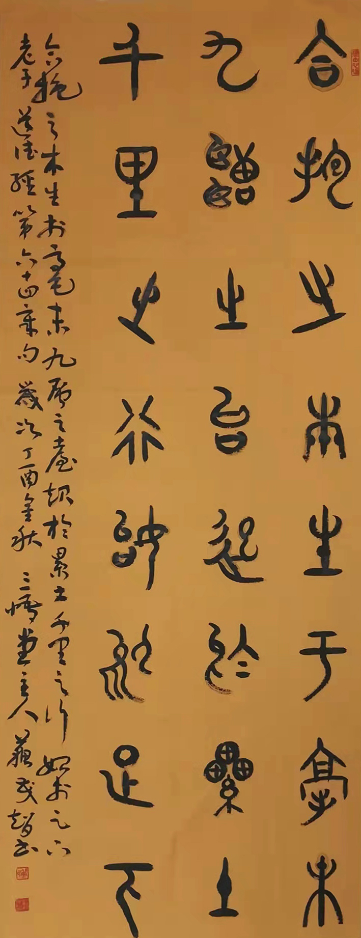 他的篆书主体以大篆遗迹为取法,远睹前人之奇迹,深师散氏盘、毛公鼎,所见甚深,所以非常娴熟地解锁了古代书法的点划秘籍,执笔拟刻,笔笔相生,笔笔相映,以生动活泼作线条,以正大气象写高古。每一件大篆作品都可以把人们的书法欣赏目光从当下向渊源处吸引,让人们从当代书法作品中,可以尽览书法源起时的惟妙惟肖。从这个意义上来讲,苏茂智先生的篆书作品,不仅仅是令人赏心悦目的书法上品,也是传统文化经由笔墨溯源,把精彩魅力复作于眼前的文化经典,即有审美的表现力量,也有文化的弘扬功勋,艺术与学术的价值双重显赫。