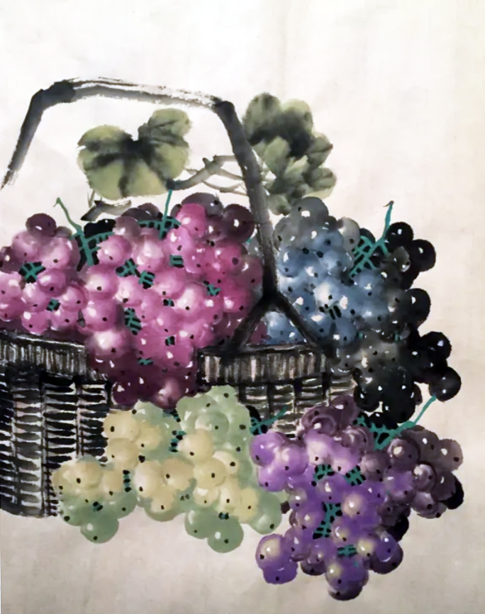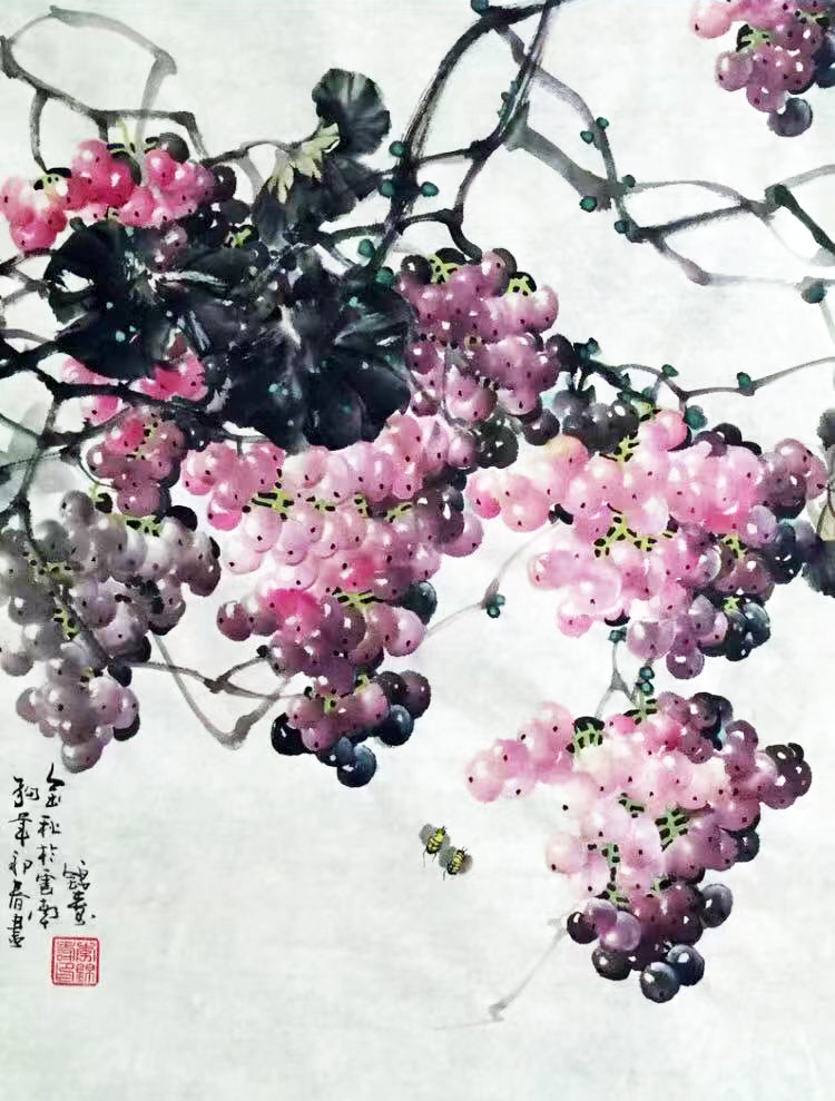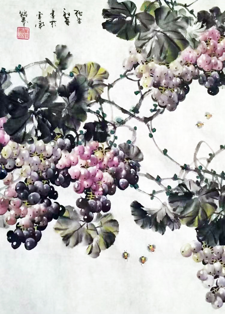 在画牡丹、葡萄时始终秉承“不要人夸好颜色,只留清气满乾坤”的画风精神,从立意、构图、色彩上贯彻始终。
