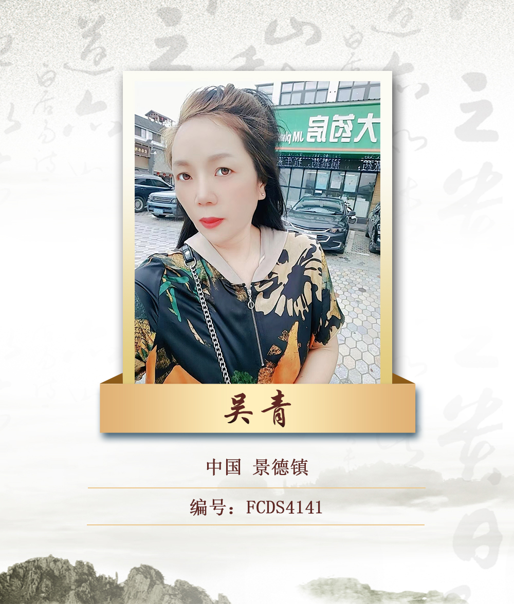 吴青,女1970年12月3曰出生,国家一级美术师,江西省景德镇市一名普通干部家庭,自小喜爱美术,考进一家市职业美术中专,爱好陶瓷工艺美术。经常获市级奖励!曾获杭州市工艺美术陶瓷金奖,多次获得奖章。市级青年杯∵优秀奖金。