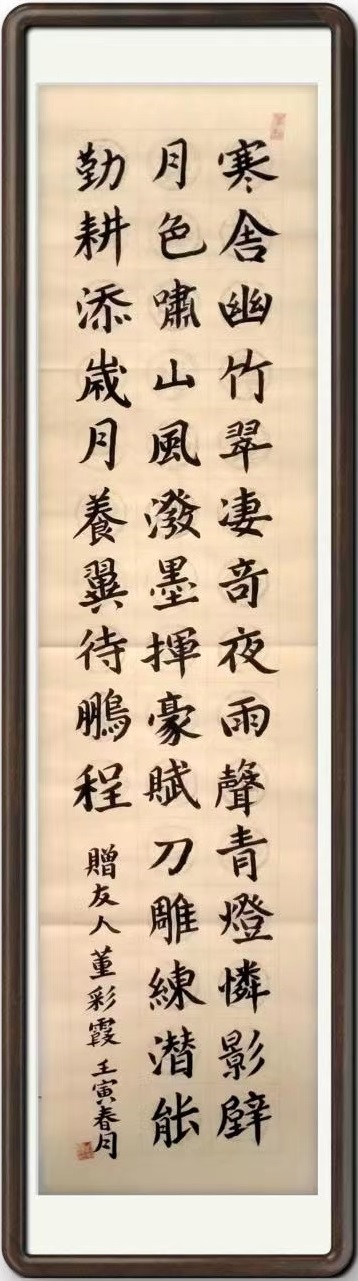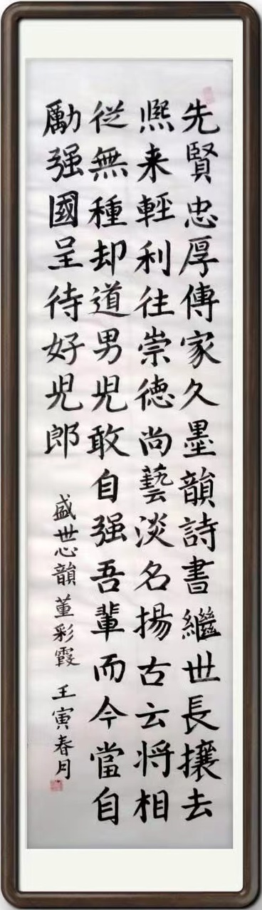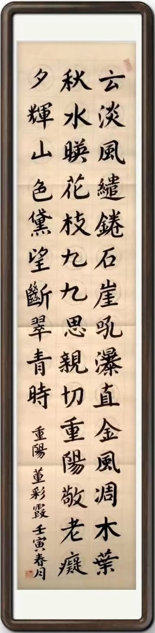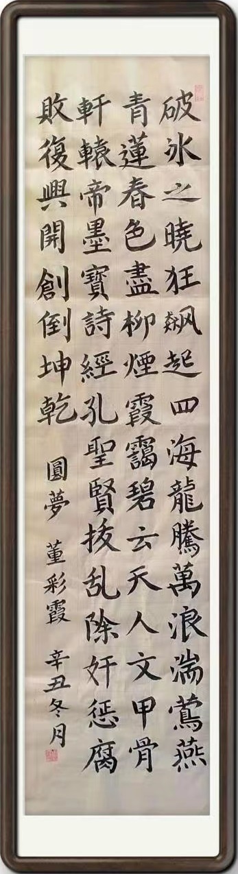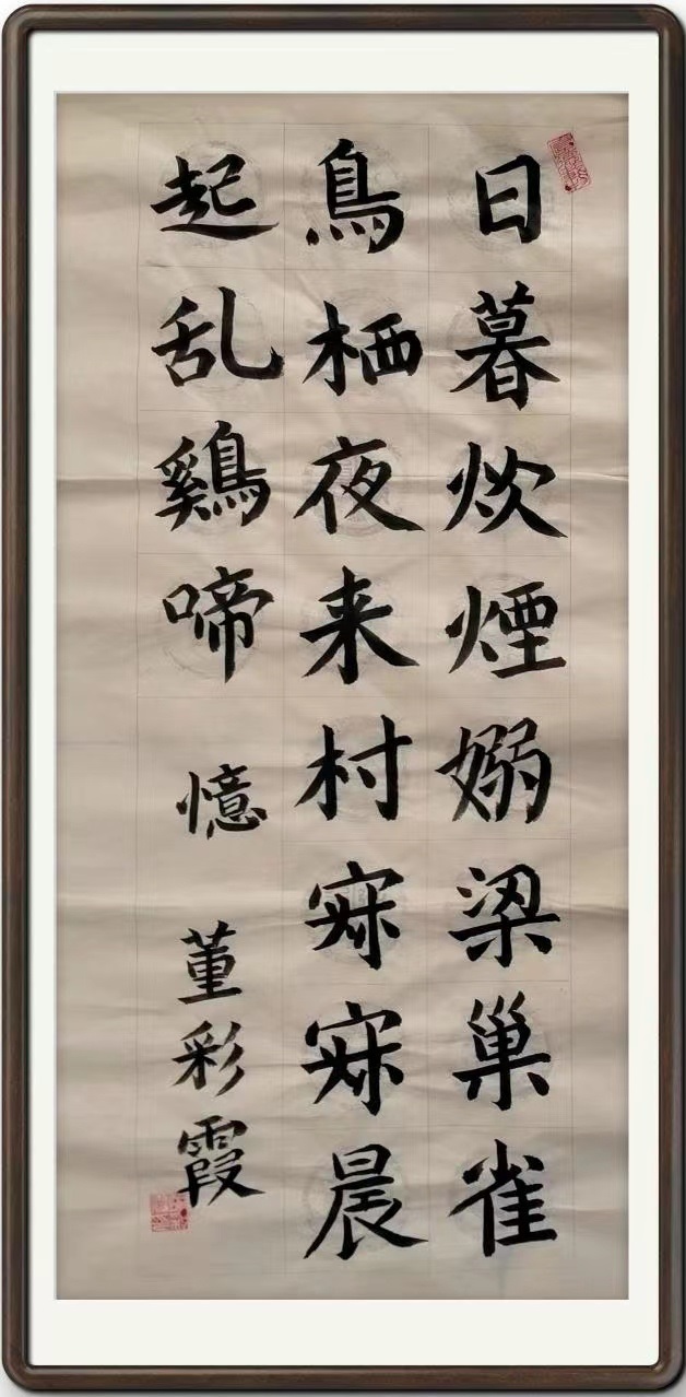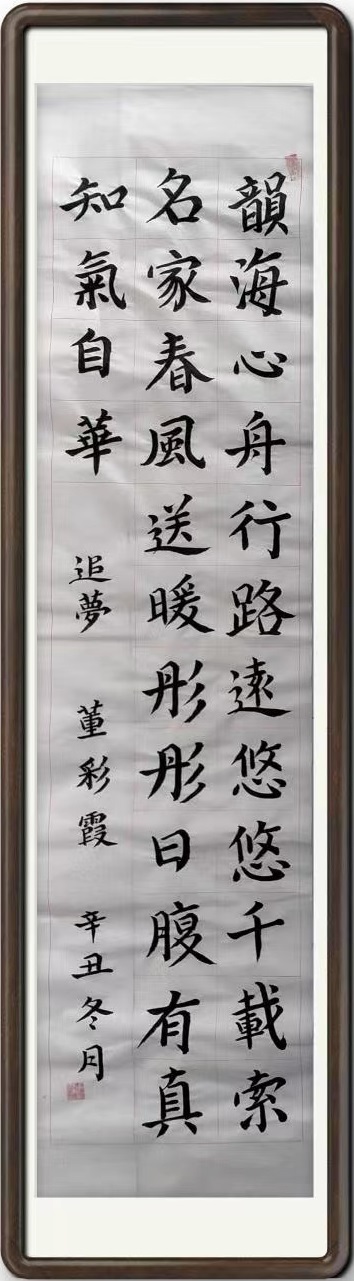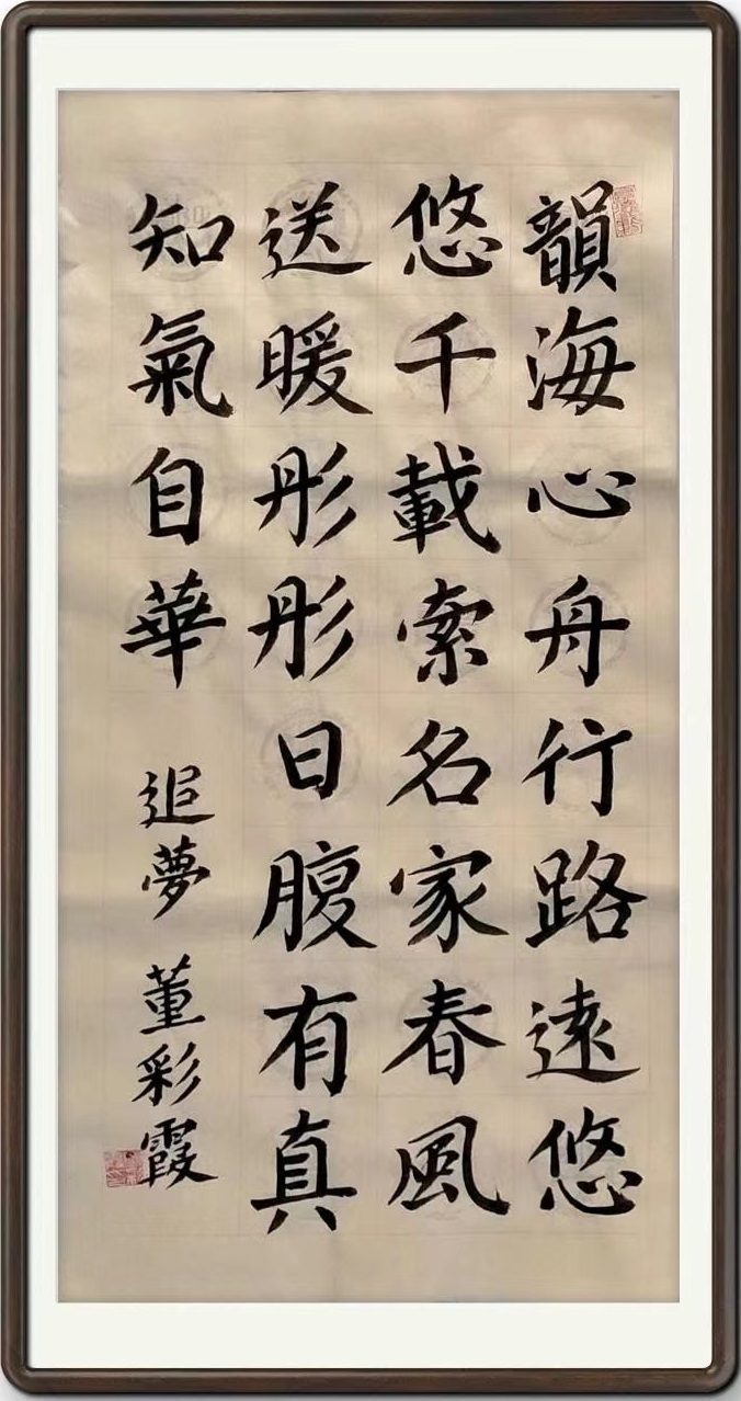董彩霞,女,北京人。喜欢文学、诗歌,现为:中国大众文化学会名人书画艺术发展委员会委员,中华卫视艺术风采栏目艺术会员,2022中国冬奥会艺术形象大使,在第二十一届世纪大采风年度盛典中,荣获“当代诗歌杰出人物”荣誉称号,2021年9月在《笔尖下的中国——时代楷模》评选中获"时代楷模"荣誉称号。2021年11月,被功勋艺术家评审委员会评为"2021当代中国诗书画百杰",曾为艺术家张梦瑶的画作配诗,作品散见于报刊杂志及网络平台,经书画艺术大数据中心评定委员会评定为中国杰出艺术家,2021年被全国艺术档案馆、功勋艺术家网、时代书画家网及各大媒体评选为《独特书画艺术创新人物》,现为人民文艺家协会会员(作家、诗人)。2022年入选"文化强国——让中国艺术走向世界"明信片制作,被十国驻华大使馆收藏,由驻华大使馆外交官签署点评寄语,被授予当代书画艺术大使荣誉称号,2022年5月受邀为西班牙皇家艺术家协会会员。