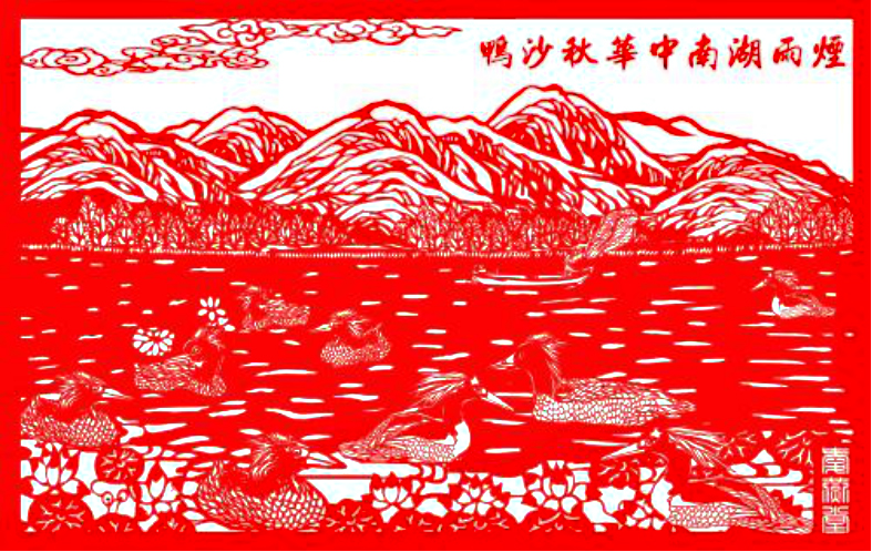 剪纸作品:烟雨湖南.中华秋沙鸭