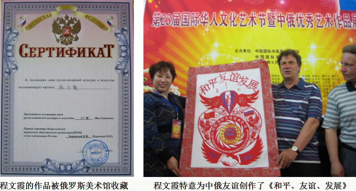2013年5月,为了加强国际文化艺术交流,浇铸两国人民友谊桥梁,发展中俄友谊,促进世界和平。程文霞代表国家剪纸艺术出访俄罗斯,通过在圣彼得堡与莫斯科巡回展与文化艺术交流,加强了中俄两国文化艺术交流,增进了中俄两国人民的深厚友谊,促进世界和平作出了重大的贡献。剪纸作品得到了国内外的有关领导、各界人士与各国优秀艺术家们的一致好评, 现场创作的《和平、友谊、发展》荣获“中俄文化艺术交流重大贡献奖”并被授予“中俄世代友好大使”;