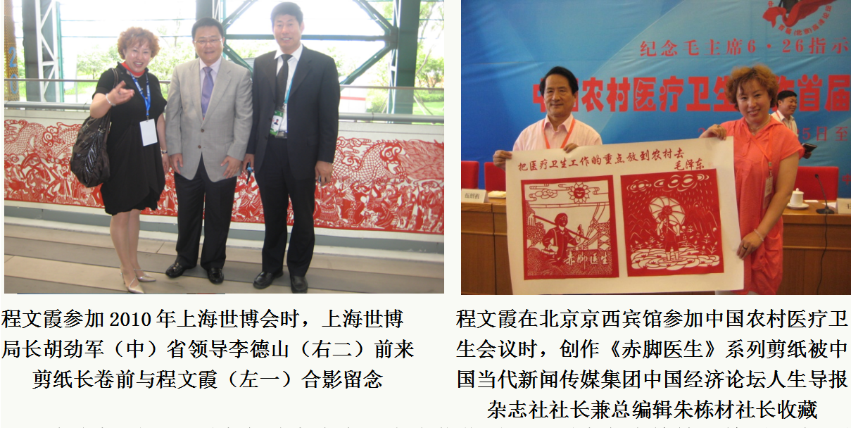 2010年,她的二幅剪纸长卷:一幅是《和谐中国》;另一幅是以上海世博会为主题的《城市,让生活更美好》进入上海世博会,成为了上海世博会的焦点之一。2010年上海世界博览会组织委员会主任委员(原国务院副总理)现国家副主席王岐山、执行委员会主任(原上海市委书记)上届国家政协主席俞正生授予“程氏剪纸代表性传承人程文霞亲笔签名的中国2010年上海世界博览会突出贡献奖” 并授予“程文霞剪纸艺术技能大师工作室纪念奖牌一枚”。
