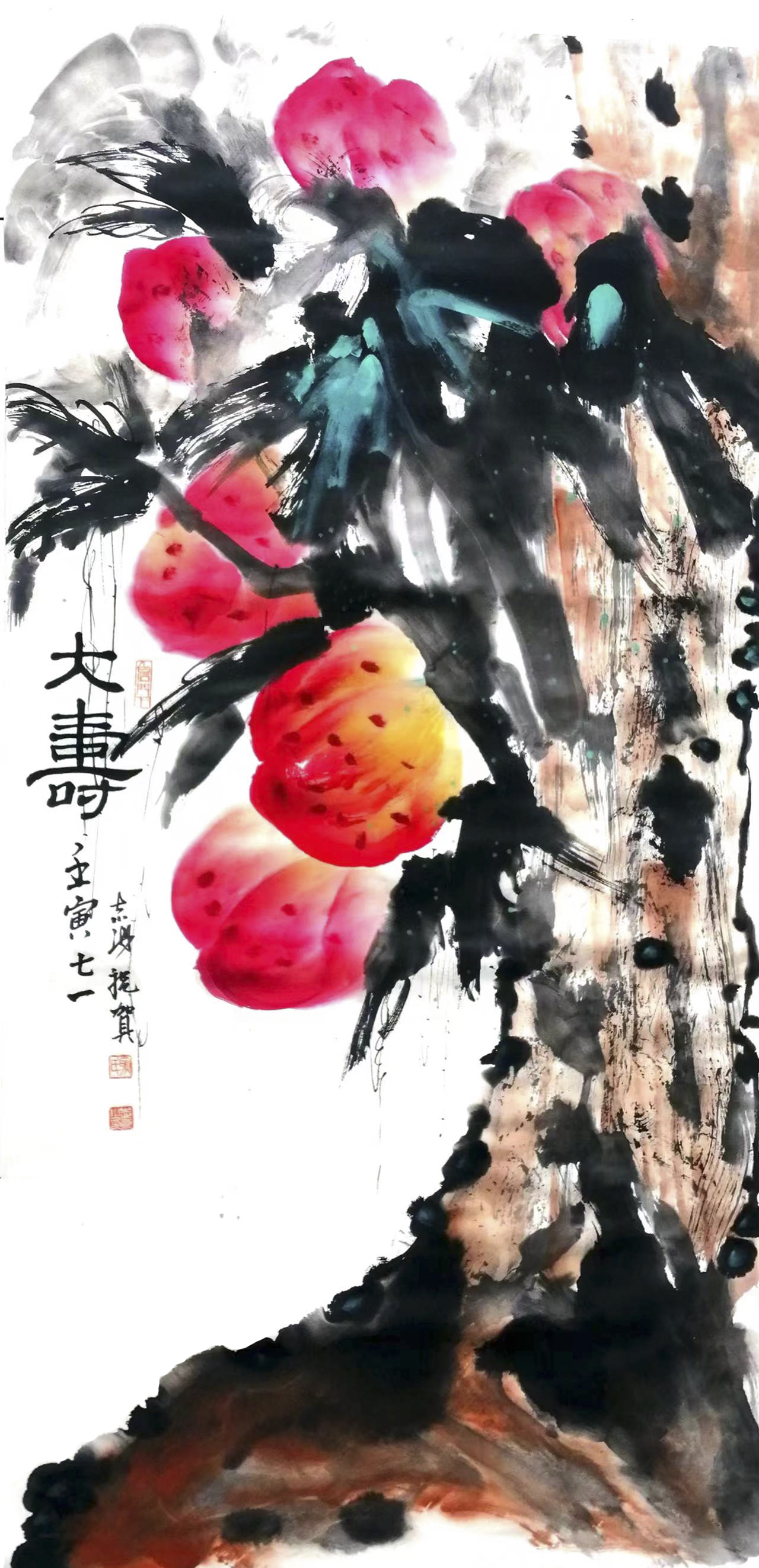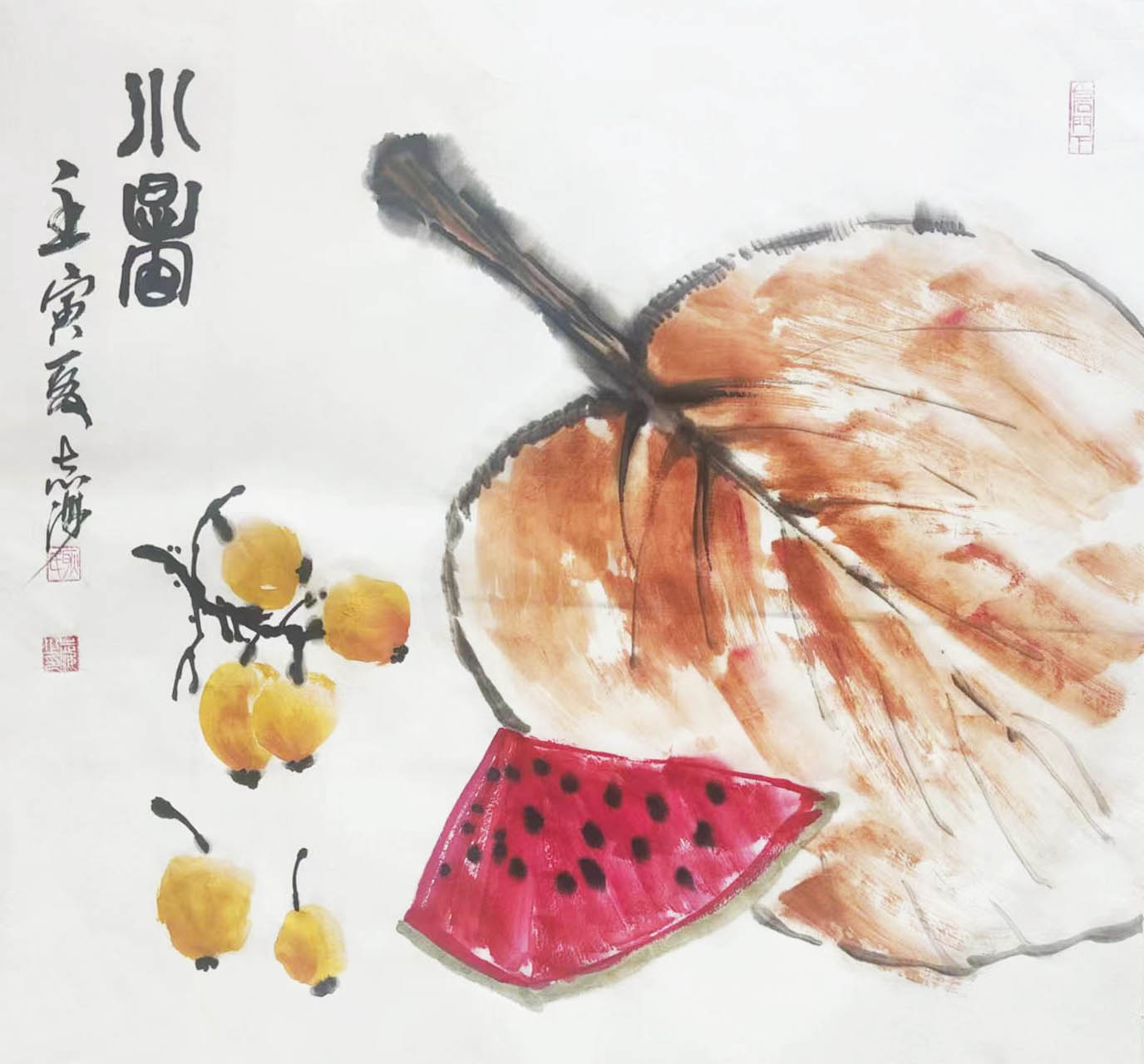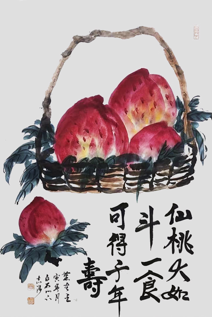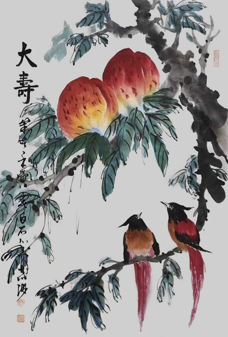 在笔墨技法和形神章法上,耿志海先生也是有展现出一种外师造化而中得心源的创作语境,写意花鸟以寿桃为题材,用笔用墨野逸潇洒,赋色之际更是艳而不媚,浓而不俗,所构寿桃,是可感于和谐韵味,也可品于典雅之风,观之由是赏心更悦目!其墨虾之作,则是当下画坛内为数不多能够充分继承白石精神的上品佳作,所绘墨虾皆是不已外形为高,而是唯任内藉为本,正如齐老所言那般,是曰学我者生似我者死,今日的耿志海先生显然就是有悟于此要论!作中用笔,是有注重传统的底蕴,却也不缺乏于对个性的造化,笔墨之间可谓尽是有赋简淡之畅达,墨虾体态又是充分秉持写生脉络,明快自然,气韵生动,一幅所展,时而两三相游,时而四五相聚,品观之余,诚是惬意自然更宜人心神!