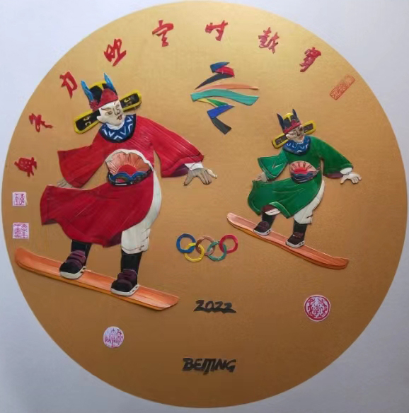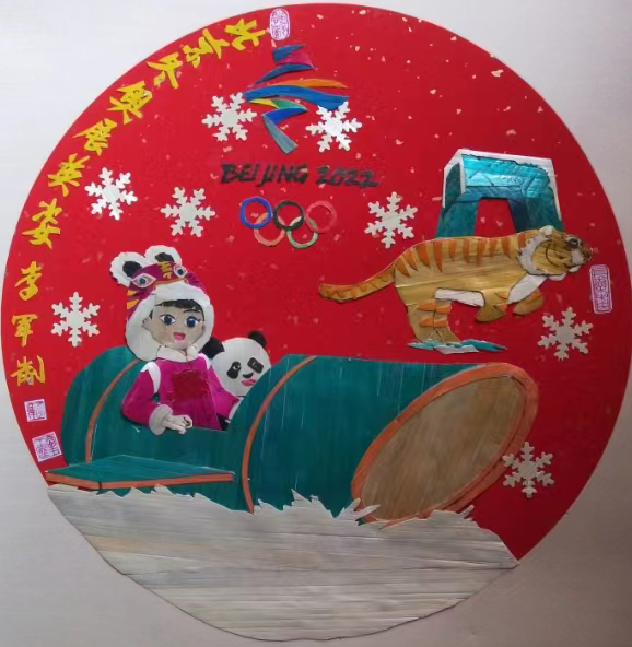 《穿越时空 助力冬奥》:麦秆画是中国非物质文化遗产,是老祖先留下的艺术瑰宝。新时代、新时期在党和政府的高度重视下,不断推陈出新,得到长足发展。这幅作品大胆创新,把古人和冬奥结合在一起,用麦秆做成画,赋予非遗艺术新的生命力。同时,北京成功举办了2008年的夏季奥运会、2022年的冬季奥运会,是世界上唯一同时举办夏奥和冬奥的城市。所以这幅麦秆画具有极高的收藏价值。
