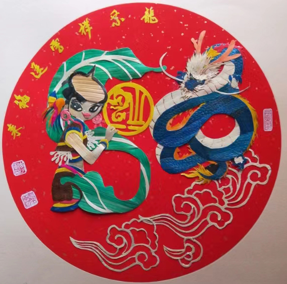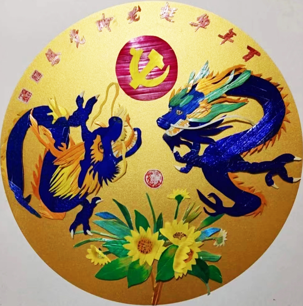 如:《腾飞中国》: 这幅作品双龙舞动、巨龙腾飞,寓意深刻。龙是中国汉族的民族图腾、中华民族的象征,中国人都以自己是“龙的传人”而骄傲。巨龙腾飞拱卫国徽深深表达我们伟大的祖国蒸蒸日上、繁荣昌盛。一幅看似简单的作品却能表达深深的内涵。这幅画用非遗艺术麦秆画的手法做出来,既有传承更显创新。整幅作品以黑卡纸相衬显得庄重严肃、稳重发展;龙以本色、金色麦秆作主色调,与黑背景形成鲜明反差透视出龙腾之力度,具有很强的进取精神。双龙舞动,朝气蓬勃,奋发向上,威武不屈。这就是中华民族龙的精神。也是中华儿女一往无前、势不可挡、无所畏惧、孜孜追求为之奋斗的精神。