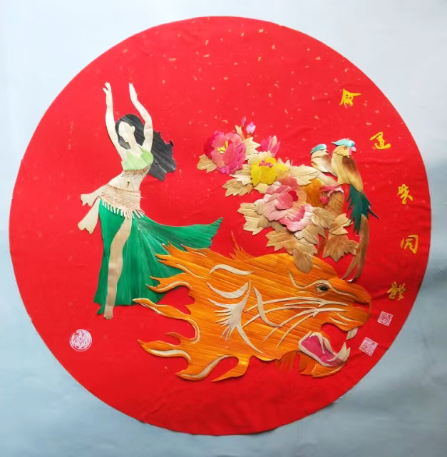 《中国梦 民族风》:中国共产党建党100周年,特别是新中国成立以来,在中国共产党的领导下中国巳发生了巨大变化。现在的中国巳成为世界第二大经济体,科学技术迅猛发展,人民生活极大改善。截止到2020年底,中国全面脱贫。国强民富、民族复兴大业的中国梦必将梦想成真。这幅麦秆画的特点以"华表、天安门和万里长城"为主景。以民乐和民族舞为集中表现,讴歌共产党,讴歌新中国。表达了人民生活丰富多彩,如同芝麻开花节节高。这幅画的背景以蓝天绿地衬托,天空中有宇宙飞船、卫星和大型客机C-919,这些代表着我国高科技的飞速发展。华表、天安门、长城象征我们伟大的祖国。龙是中华民族的图腾。雄狮、丹顶鹤代表着雄狮已醒,巨龙腾飞,国泰民安、幸福美满,以此寓意"中国梦民族风",中国梦梦想成真,民族风舞动世界。