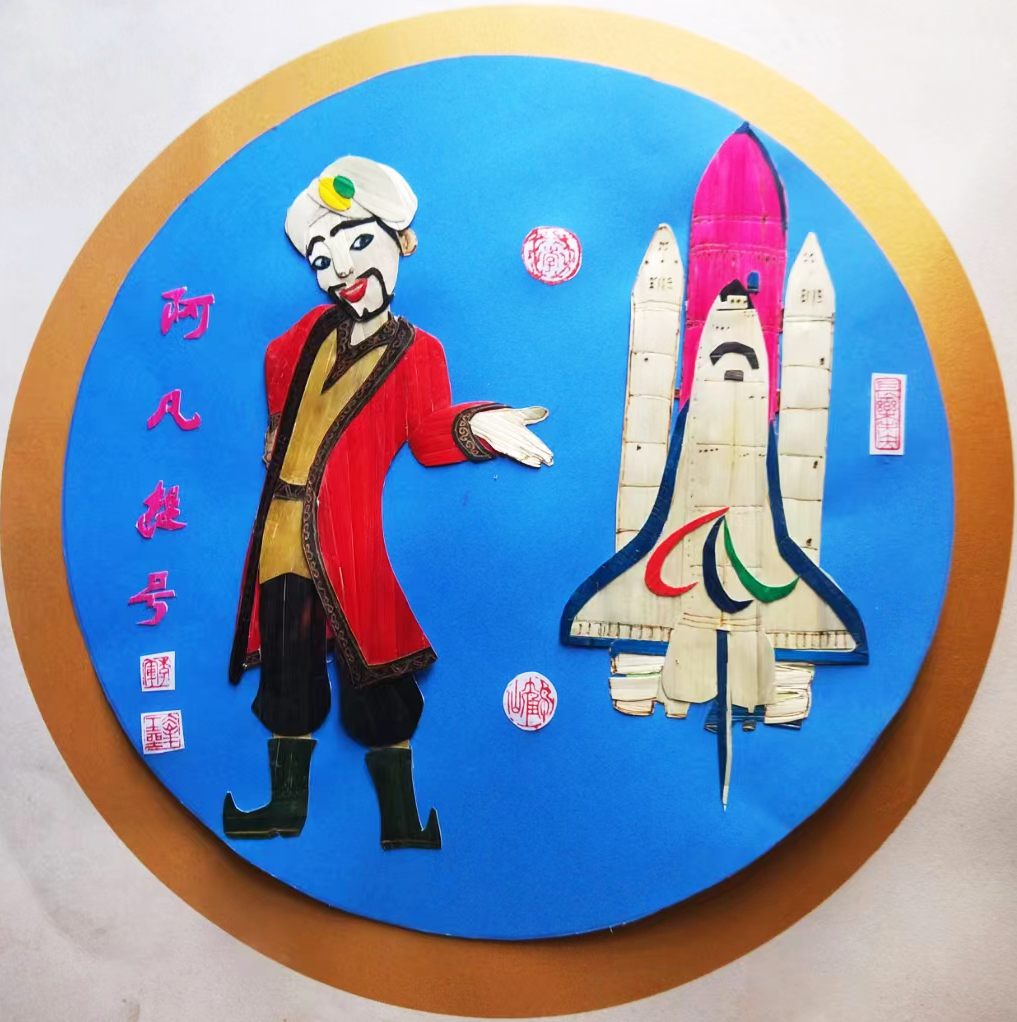 《阿凡提号》:我为冬残奥制座驾,北京2022年冬残奥会即将升起冬残奥旗,现在各国运动员正严阵以待,拧着行李箱、推着行李车准备登机。冬奥会"阿凡提号"迎接、送往各国冬奥运动健儿。这幅麦秆画使用冬奥会统一标识"心"字少一笔。这幅画把中国传统文化与当今科技文化和冬残奥文化融入一体,使作品更具新意,更有趣意。