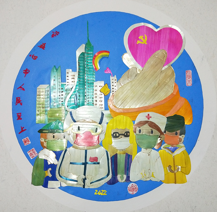 《党在心中 人民至上》:没有共产党就没有新中国。尤其在当今新冠疫情肆无忌惮席圈全球,美、欧等国漠视疫情,对人民莫不关心,反观我国,在共产党领导下,隔三差做核酸、做检测,早发现早预防早治疗。全国各地″共产党员岗"、"志愿者帐篷"遍布大街小巷。发现阳性立马住单间,送吃送喝的隔离,把病毒消灭在萌牙状态。这幅麦秆画讴歌共产党的正确领导,人民至上"为人民服务"的宗旨始终如一。