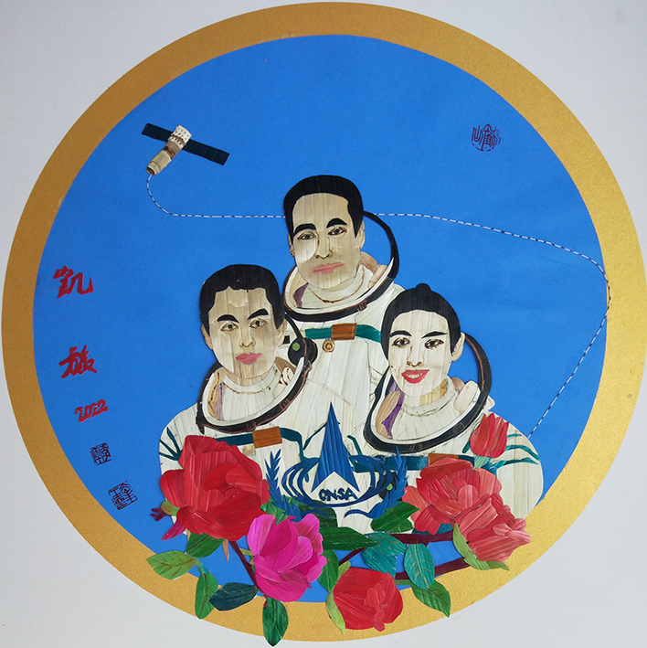 《凯旋》以神舟十三号载人飞船的翟志刚、王亚平、叶光富3名航天英雄的光辉形象为蓝图,制作而成的麦秆画作品。三位宇航员牢记伟大领袖毛主席的教导″可上九天揽月,可下五洋捉鱉"。圆满完成任务,凯旋归来,成功返回。