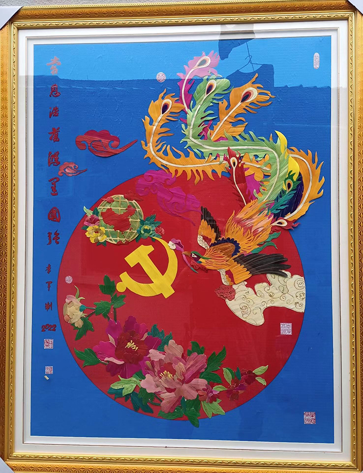《党恩浩荡 鸿运国强》:中国共产党第二十次全国代表大会于2022年下半年在北京召开,为了表达非遗艺术传承人对党的二十大的提前祝贺,制作这幅麦秆画《党恩浩荡 鸿运国强》。这幅麦秆画主景用党旗,代表中国共产党。党旗下方一簇簇牡丹花竞相开放,表达在党的领导下人民生活蒸蒸日上,国力强盛、科技发达。党旗右上方为凤凰展翅,嘴衔灵芝跋山涉水、不远万里飞来献礼,迎接党的二十大召开。"凤皇是古代传说中的百鸟之王。雄的叫凤,雌的叫凰,通称为凤或凤凰。羽毛五色,声如箫乐,常用来象征瑞应。"这里代表全国各族人民如凤凰舞动、快乐奔跑,是吉祥和谐的象征。灵芝寓意着吉祥如意,它本身就代表着吉祥,是美好、富贵、幸运的象征。