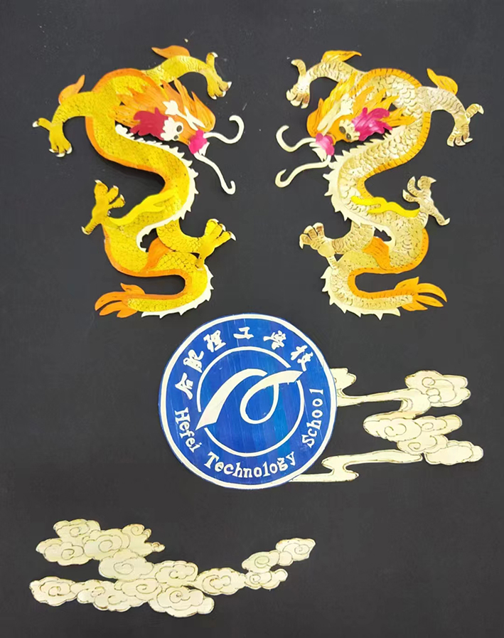 《龙耀理工》:合肥理工学校是培养大国工匠的摇蓝,造就蓝领工人的沃土,是江淮大地上中职技校的一颗璀璨的明珠。这幅麦秆画以校徽蓝色背景。巨龙腾飞深深表达理工未来更发达、更辉煌。一幅看似简单的作品却能表达深深的内涵。这幅画用非遗艺术麦秆画的手法做出来,既有传承更显创新。整幅作品以黑卡纸相衬显得庄重严肃、稳重发展;龙以本色麦秆作主色调,与黑背景形成鲜明反差透视出龙腾之力度,具有很强的进取精神。龙的活动空间十分广阔,能上九天,能潜深渊。各种艺术中的龙形象,大多是飞龙、腾龙或奔龙,朝气蓬勃,奋发向上,威武不屈。神话传说中的龙,大多是一往无前、势不可挡、无所畏惧的。 龙的精神正是合肥理工学校孜孜的追求,为此奋斗的精神。