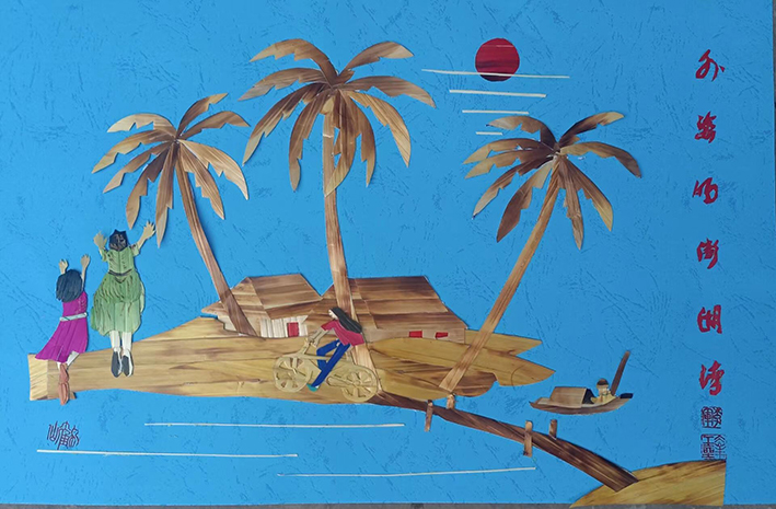 《外婆的澎湖湾》是根据上世纪七十年代末《外婆的澎湖湾》一首优美抒情的校园歌曲,加以创作,制作成麦秆画作品。以充满激情的抒怀笔调表达了对美丽的外婆澎湖湾可爱家园的赞美之情,同时也勾起了对童年美好时光的怀想。用麦秆画做出来,乡土气息更浓,让人浮想联篇。让人们联想到漫步在童年时熟悉的沙滩,留下了一步一个脚印的生动场景,浪潮起伏,浮想联翩,抒发了对美丽家园的赞美之情。