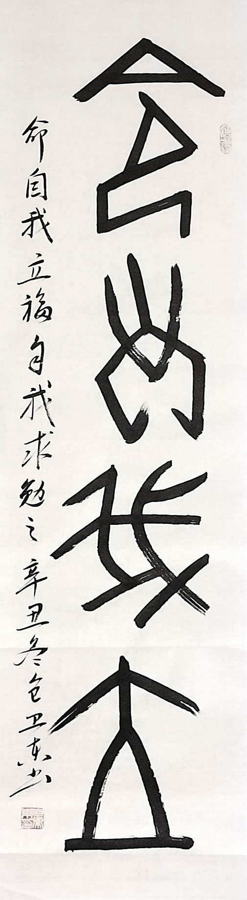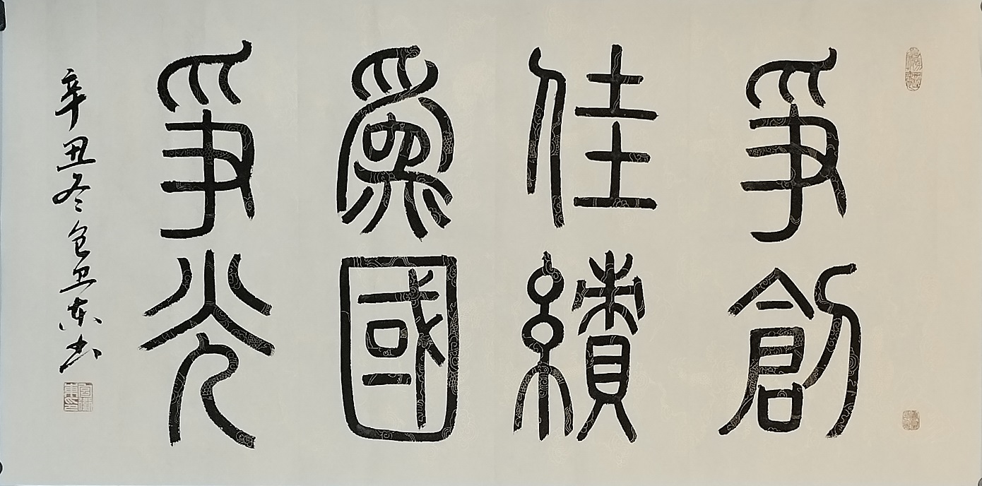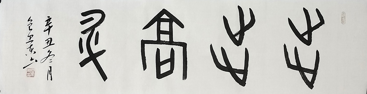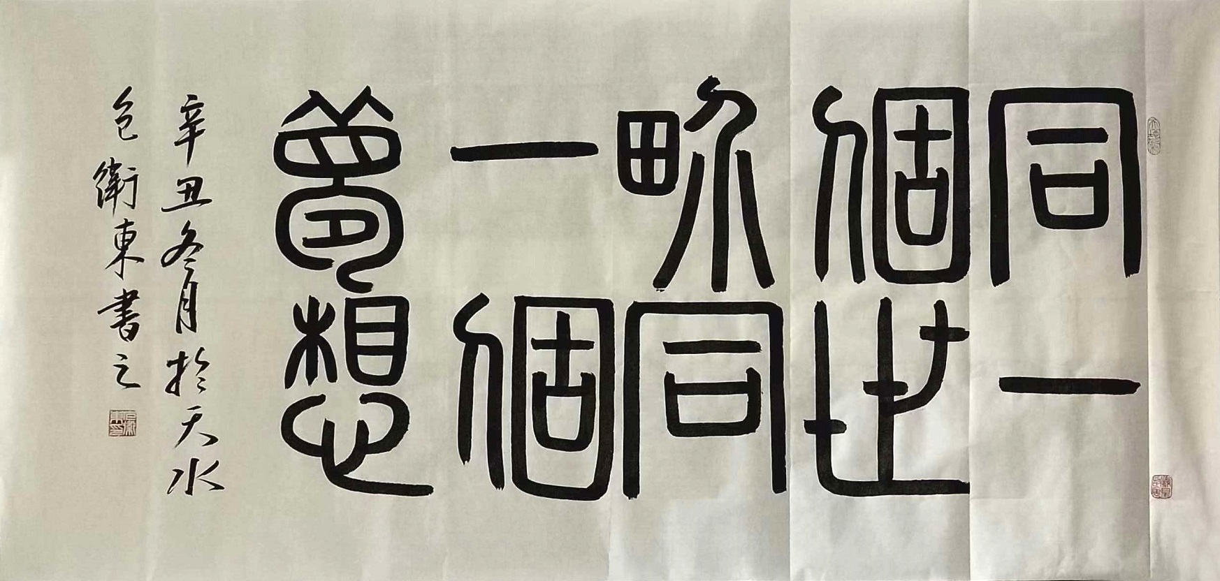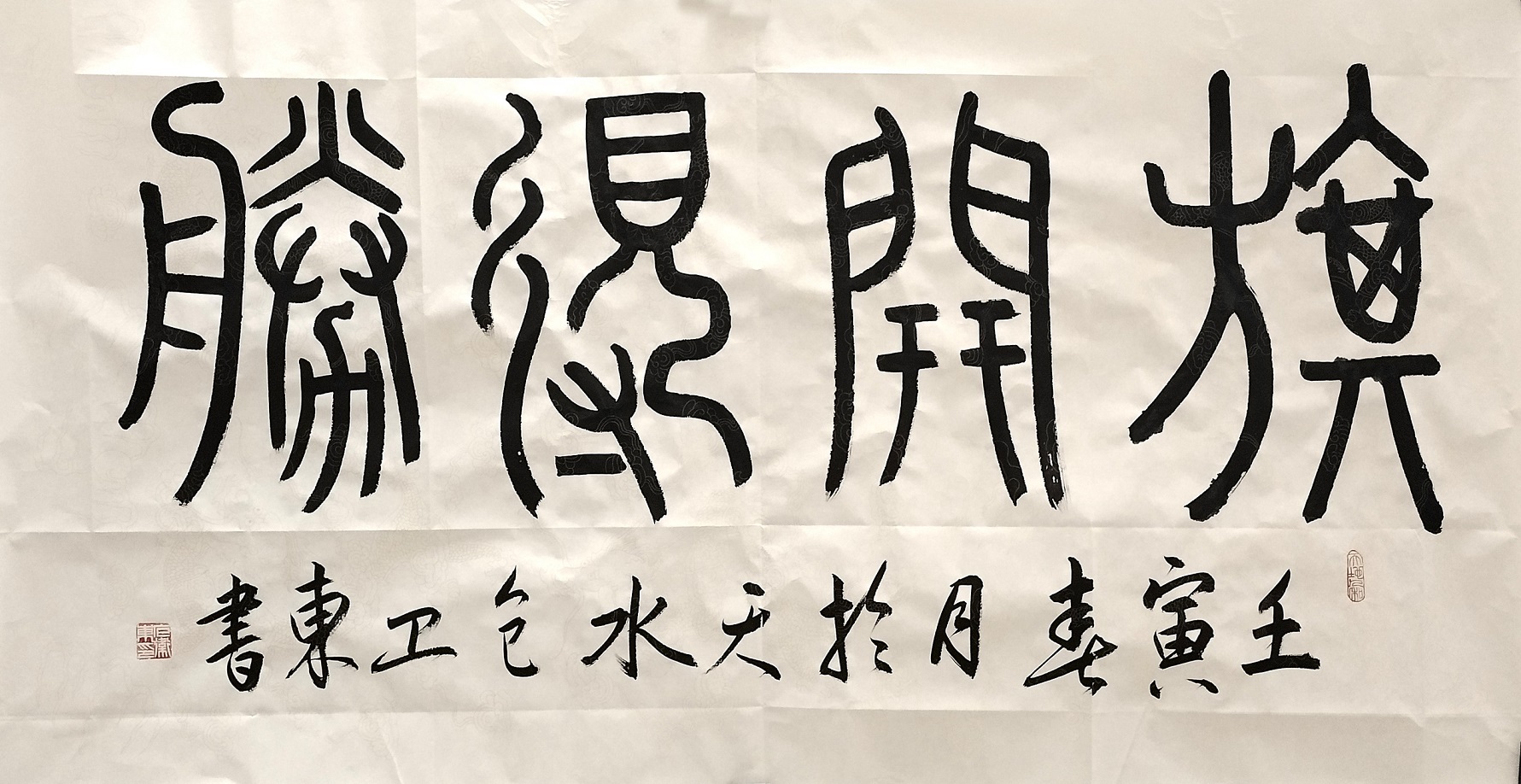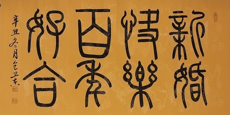 从书法创作的宽度来看,包卫东有五体皆能的博涉多优。远溯甲骨文、金文的朴茂气象,汲掘书法原本。又精研篆籀,参意泰山碑的方圆兼备,取法峄山碑的生动圆活,一手篆书写得中锋劲道,畅达恣意,可以装饰万家屏障。把篆书的学术属性和文化本质都表现得无以复加,成为他可以写得金书锦字极为重要的根基,这恰合书圣王羲之所论“穷研篆籀,功省易成,攥集精专,形彰势显”的笔墨历练法则。