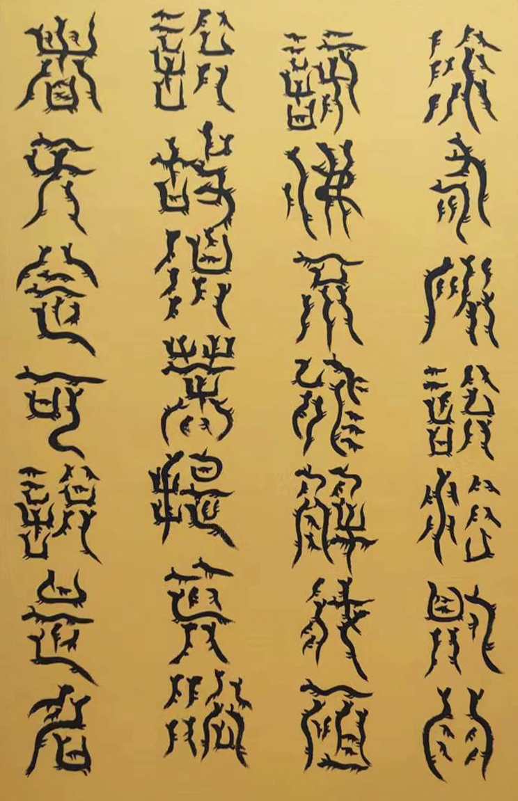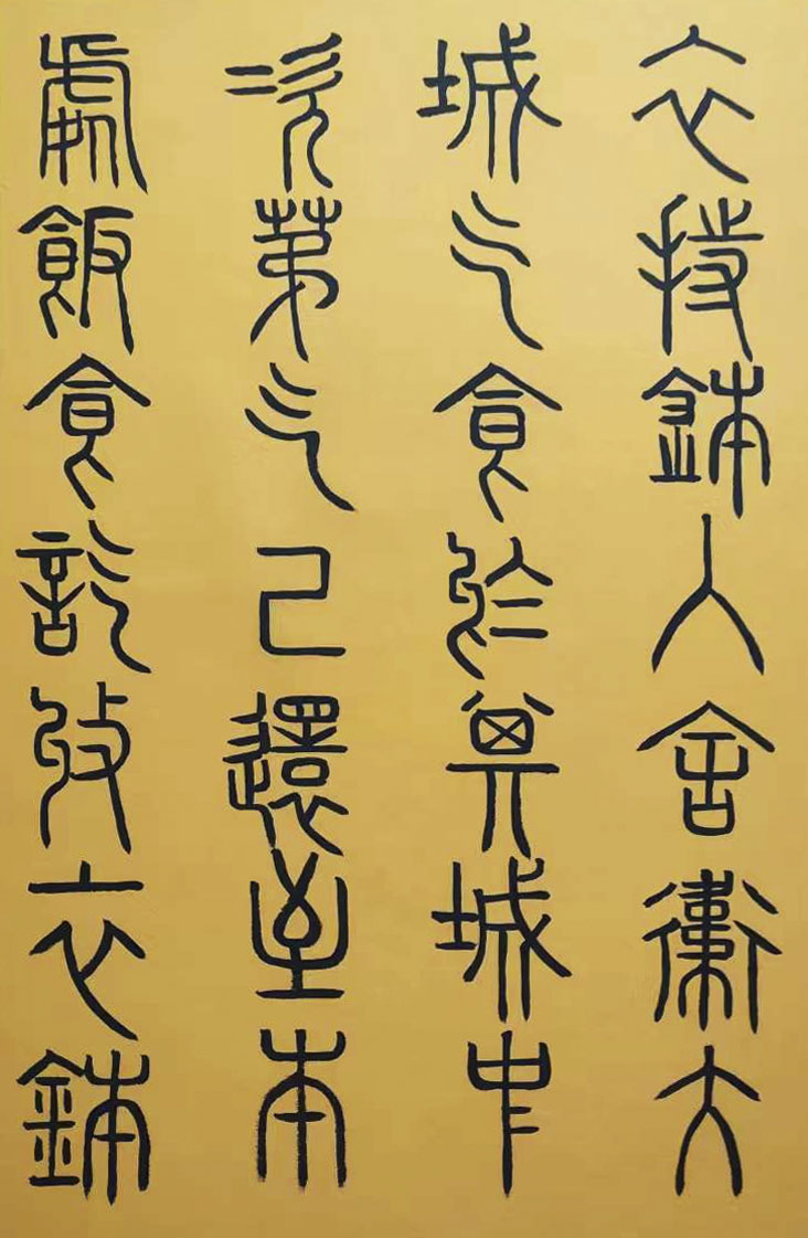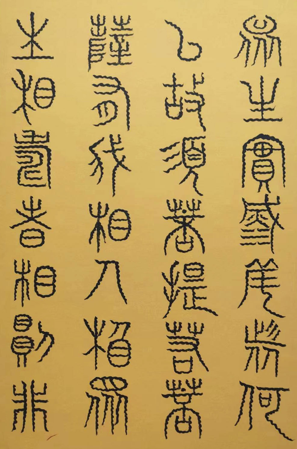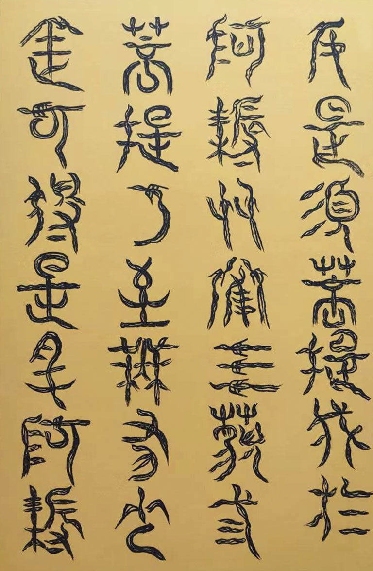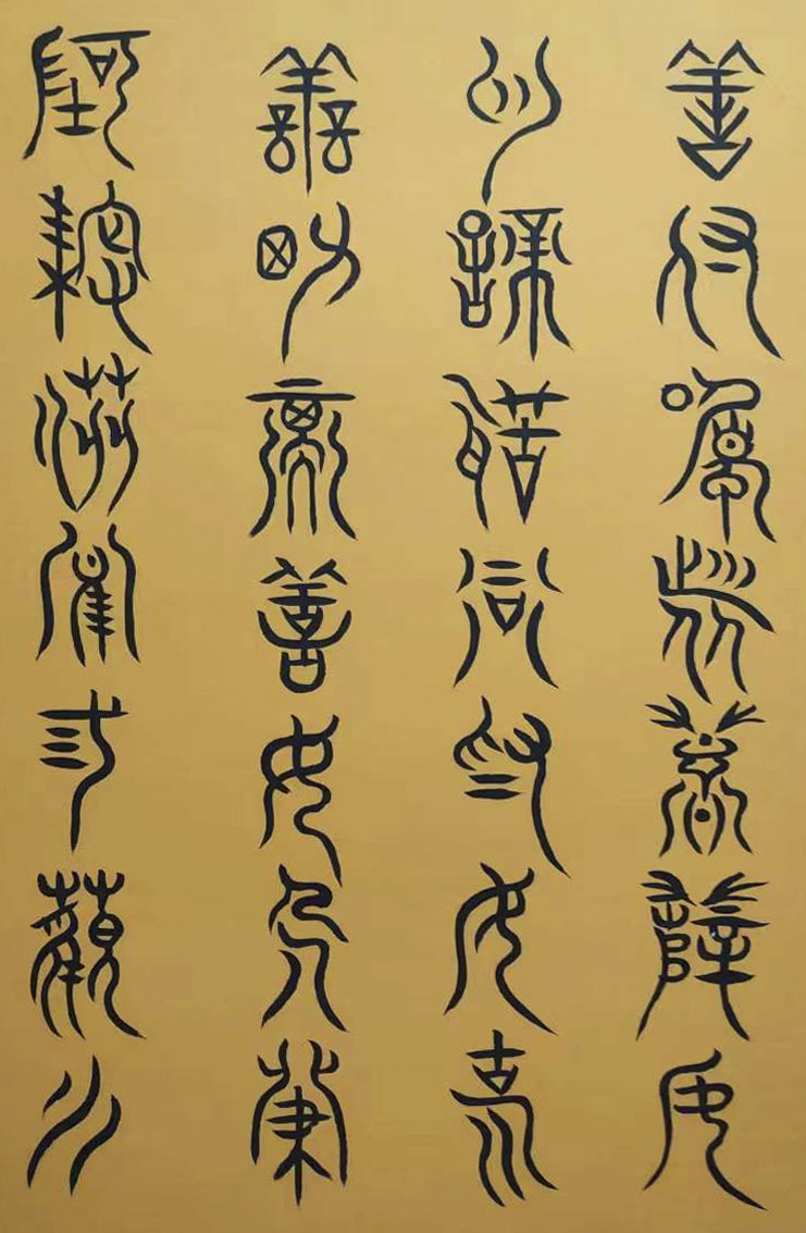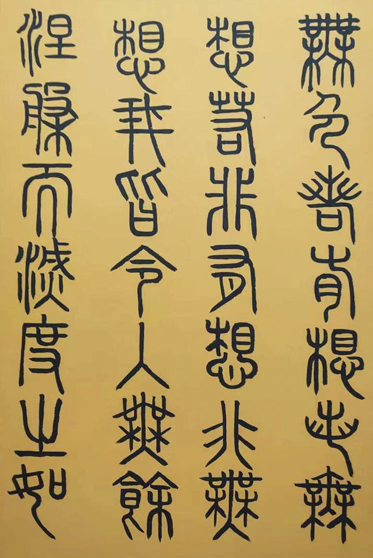 各类篆书之所常见,泰山碑为代表的官家气象,峄山碑所代表的秦风铁丝。再向远溯,则有石鼓文勒石朴茂的风范,亦有金文叩击山河的变化多端。但是,这些大篆类小篆书类的书法现象,却不能完全表现书法文化在秦以及先秦时代的百花齐放。走进当代著名书法家韩学友先生的书法体系,足以极视听之愉,可以大览篆书源头的无量奇观!他以书法家的历练,深刻挖掘篆书的三十二体的写法秘籍,以亘古相续的文化弘扬姿态,把篆书宏伟博大的历史奇观,在当下焕发出夏鼎商彝式的巍巍精神!