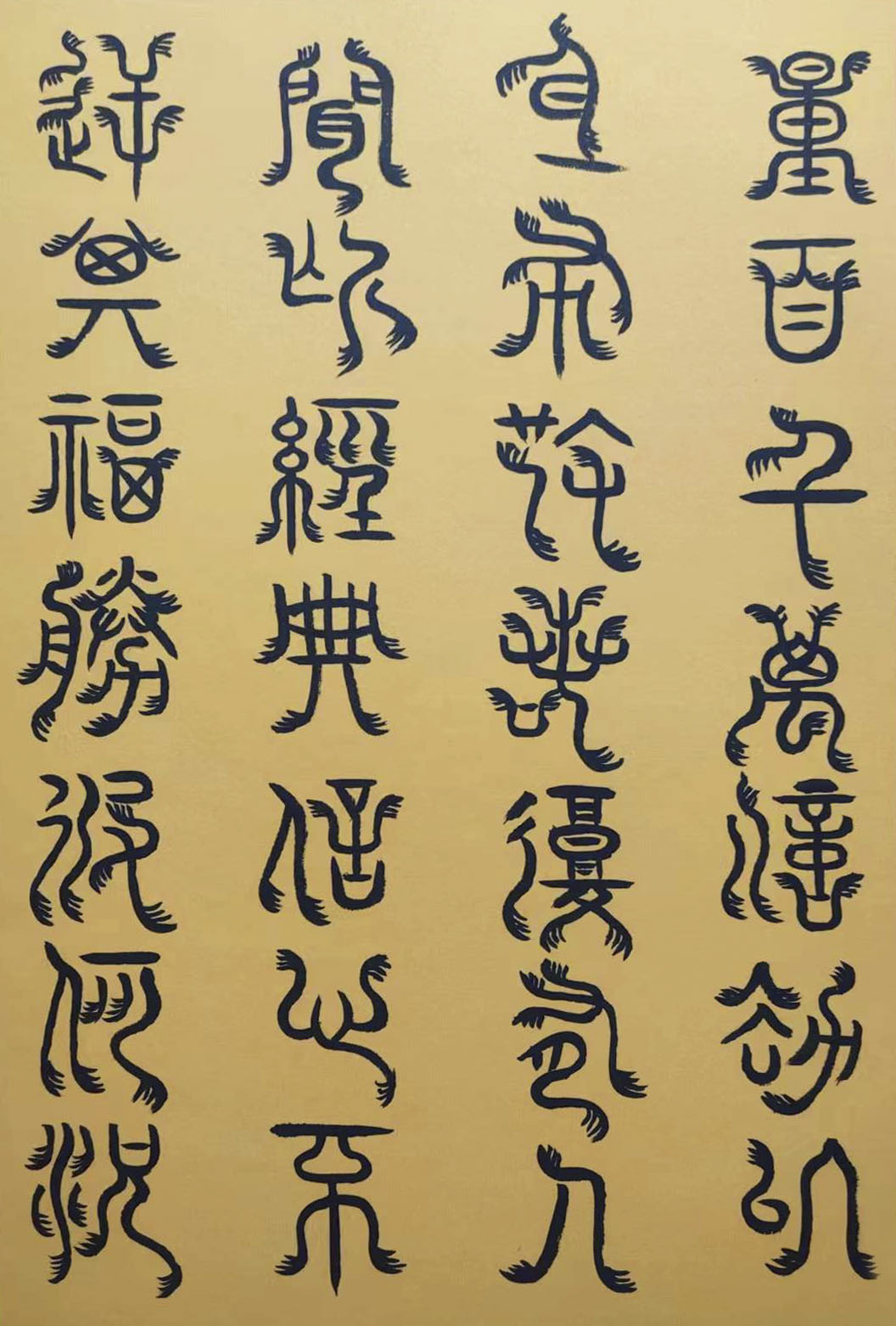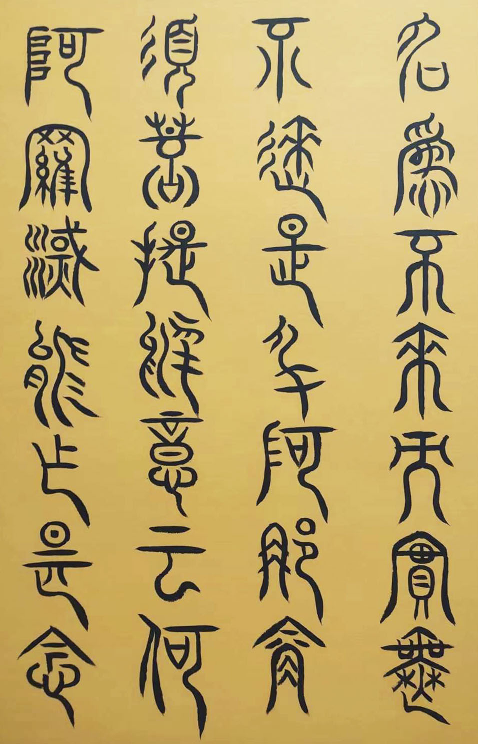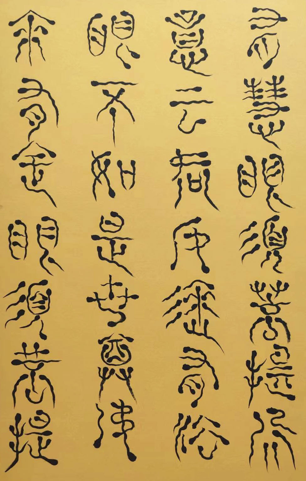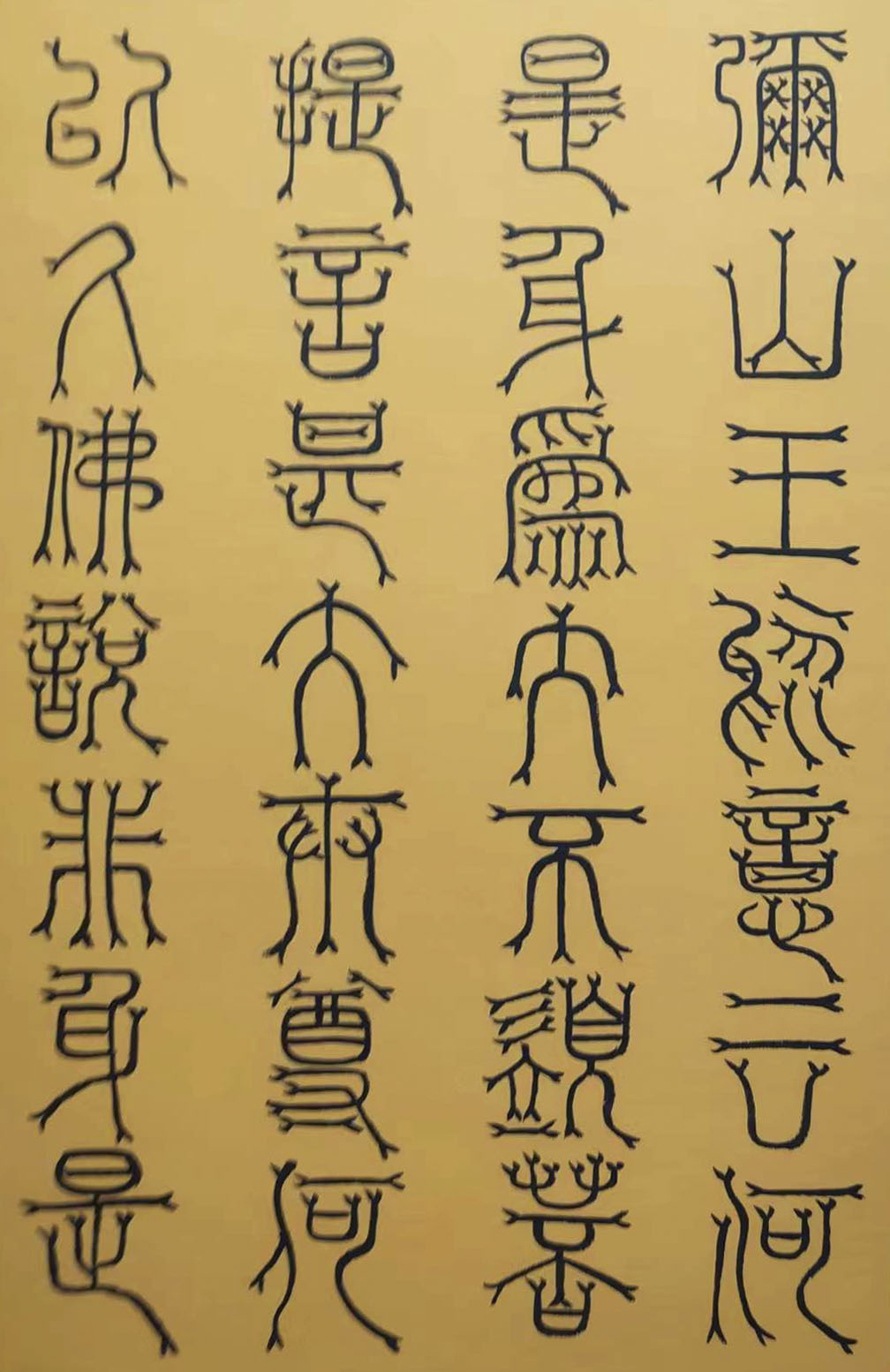 各类篆书之所常见,泰山碑为代表的官家气象,峄山碑所代表的秦风铁丝。再向远溯,则有石鼓文勒石朴茂的风范,亦有金文叩击山河的变化多端。但是,这些大篆类小篆书类的书法现象,却不能完全表现书法文化在秦以及先秦时代的百花齐放。走进当代著名书法家韩学友先生的书法体系,足以极视听之愉,可以大览篆书源头的无量奇观!他以书法家的历练,深刻挖掘篆书的三十二体的写法秘籍,以亘古相续的文化弘扬姿态,把篆书宏伟博大的历史奇观,在当下焕发出夏鼎商彝式的巍巍精神!