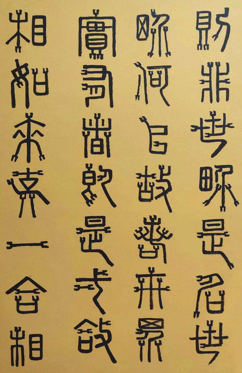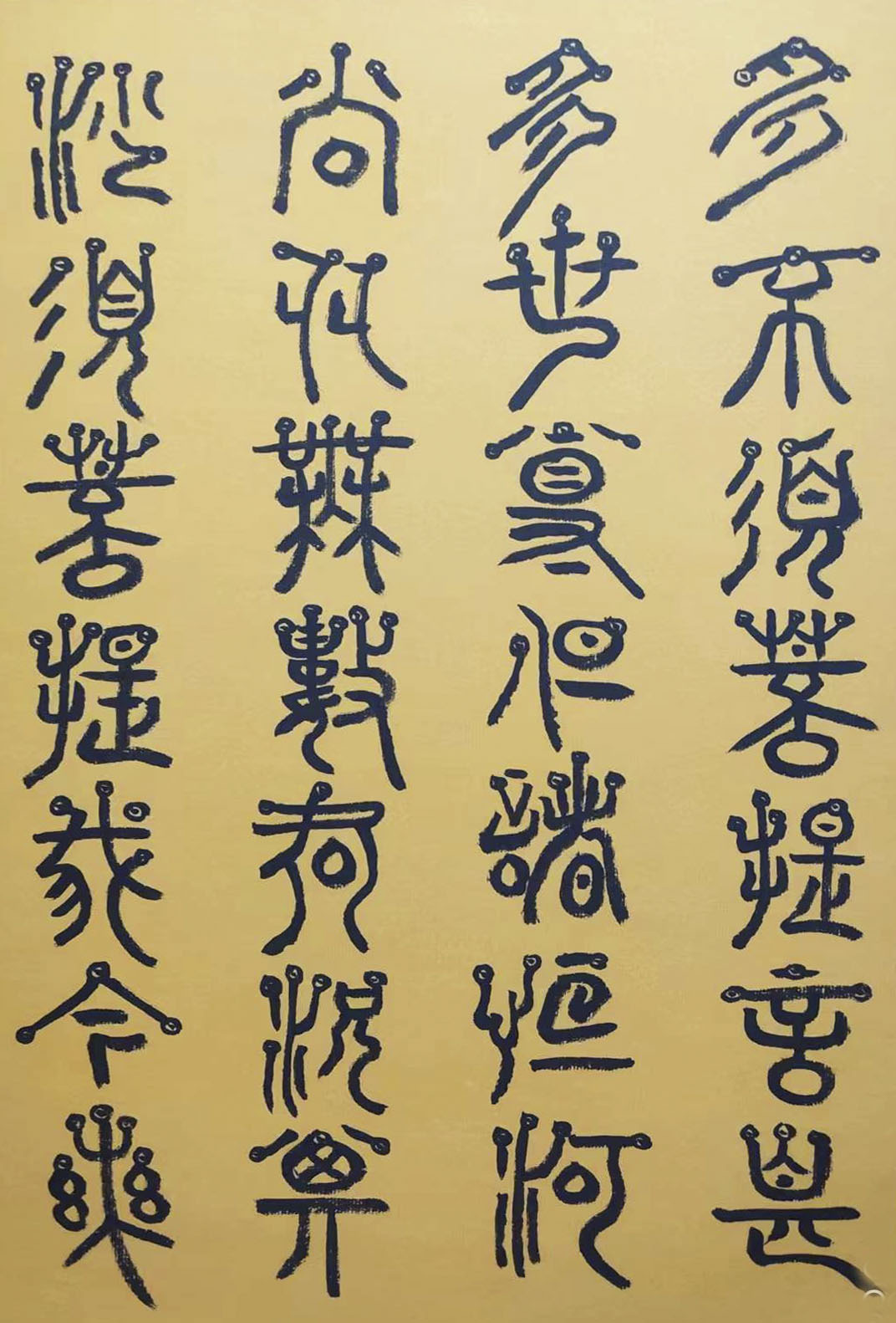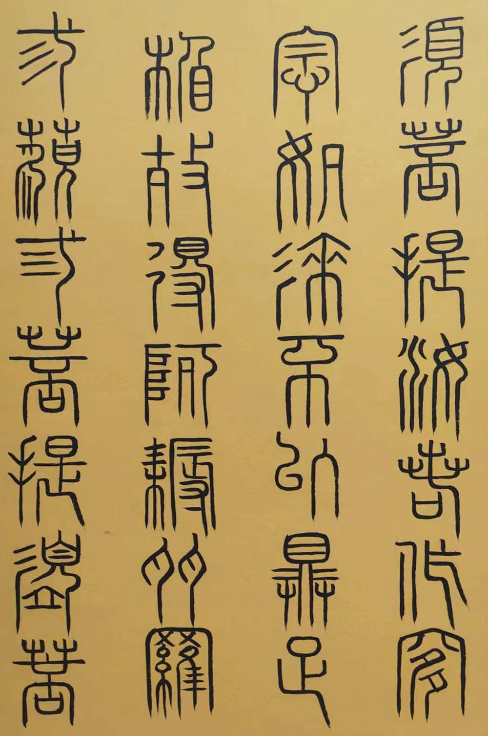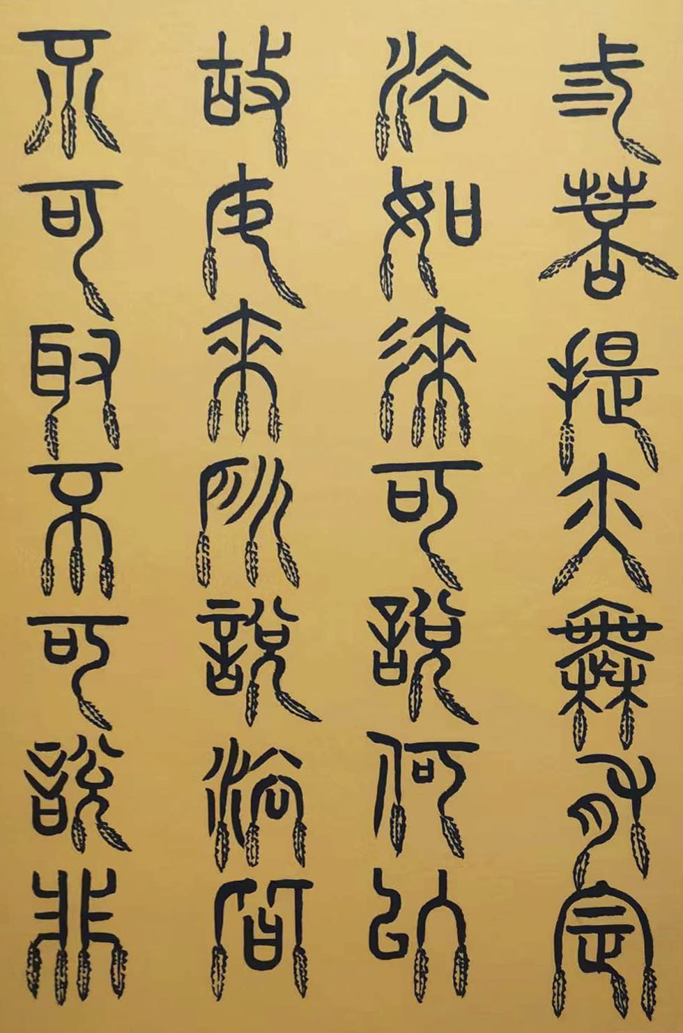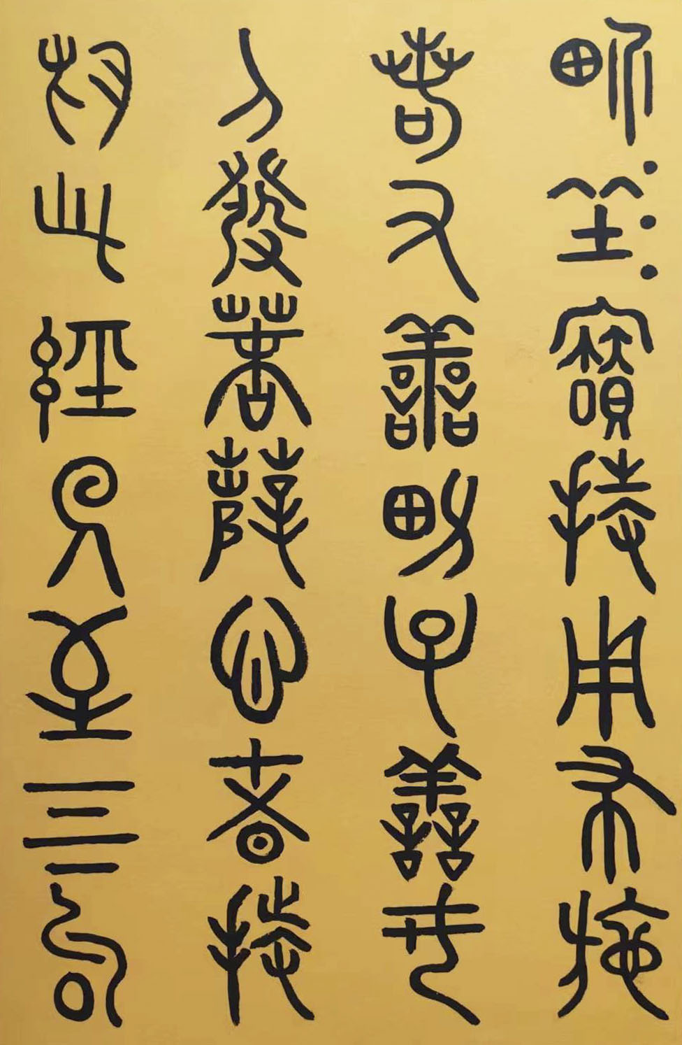 各类篆书之所常见,泰山碑为代表的官家气象,峄山碑所代表的秦风铁丝。再向远溯,则有石鼓文勒石朴茂的风范,亦有金文叩击山河的变化多端。但是,这些大篆类小篆书类的书法现象,却不能完全表现书法文化在秦以及先秦时代的百花齐放。走进当代著名书法家韩学友先生的书法体系,足以极视听之愉,可以大览篆书源头的无量奇观!他以书法家的历练,深刻挖掘篆书的三十二体的写法秘籍,以亘古相续的文化弘扬姿态,把篆书宏伟博大的历史奇观,在当下焕发出夏鼎商彝式的巍巍精神!