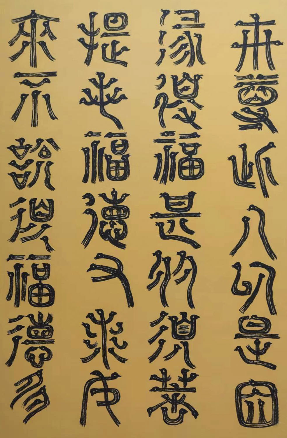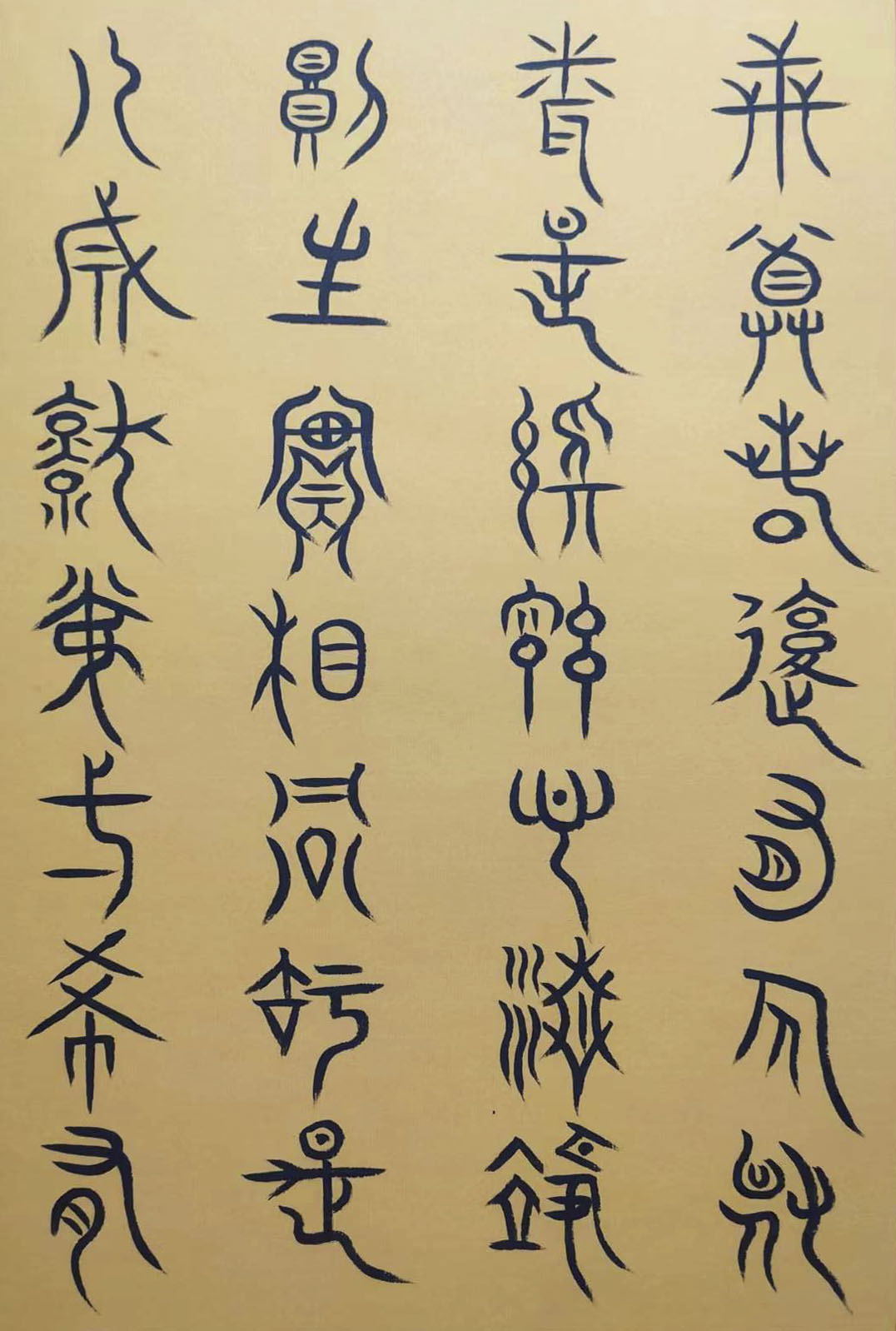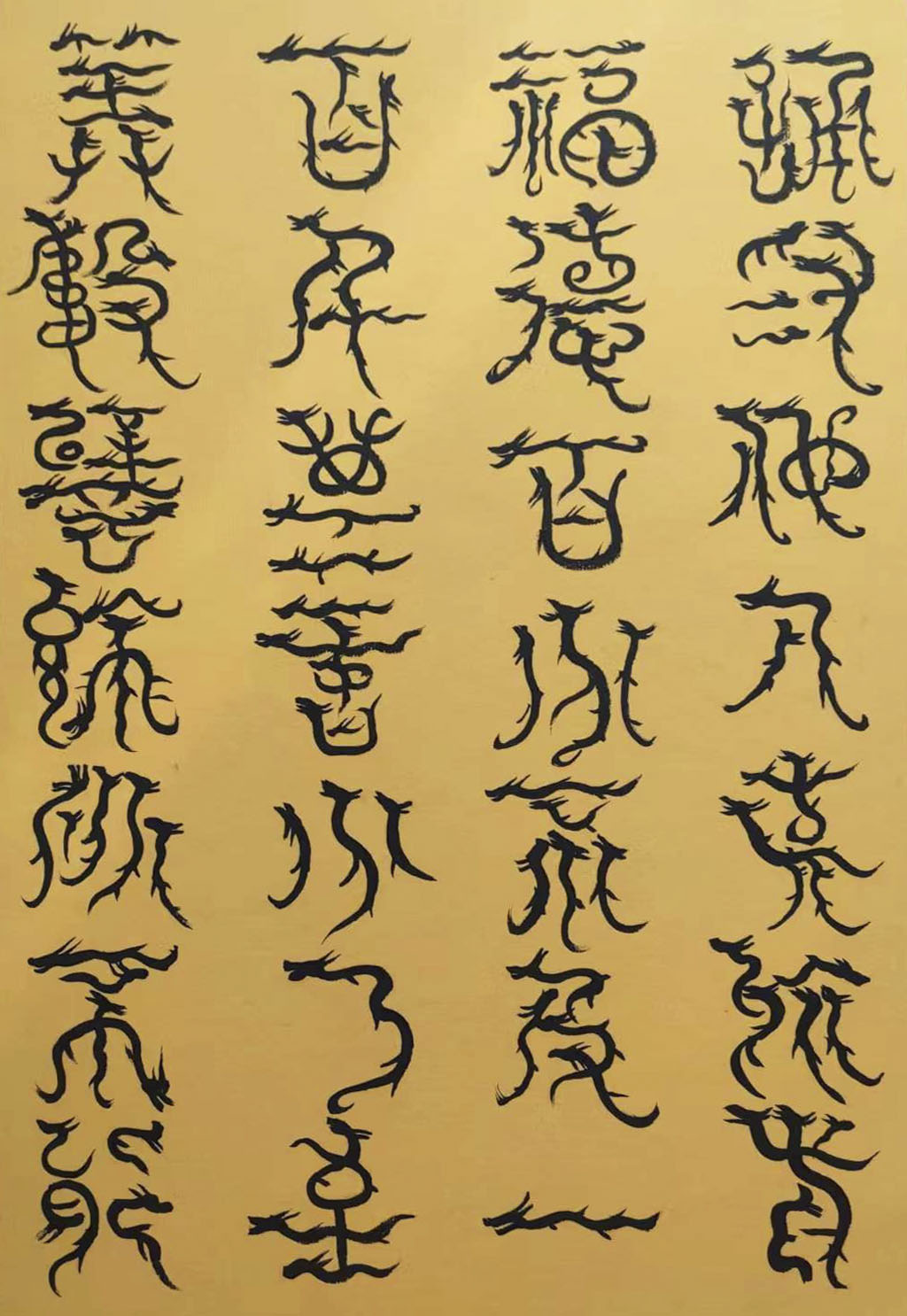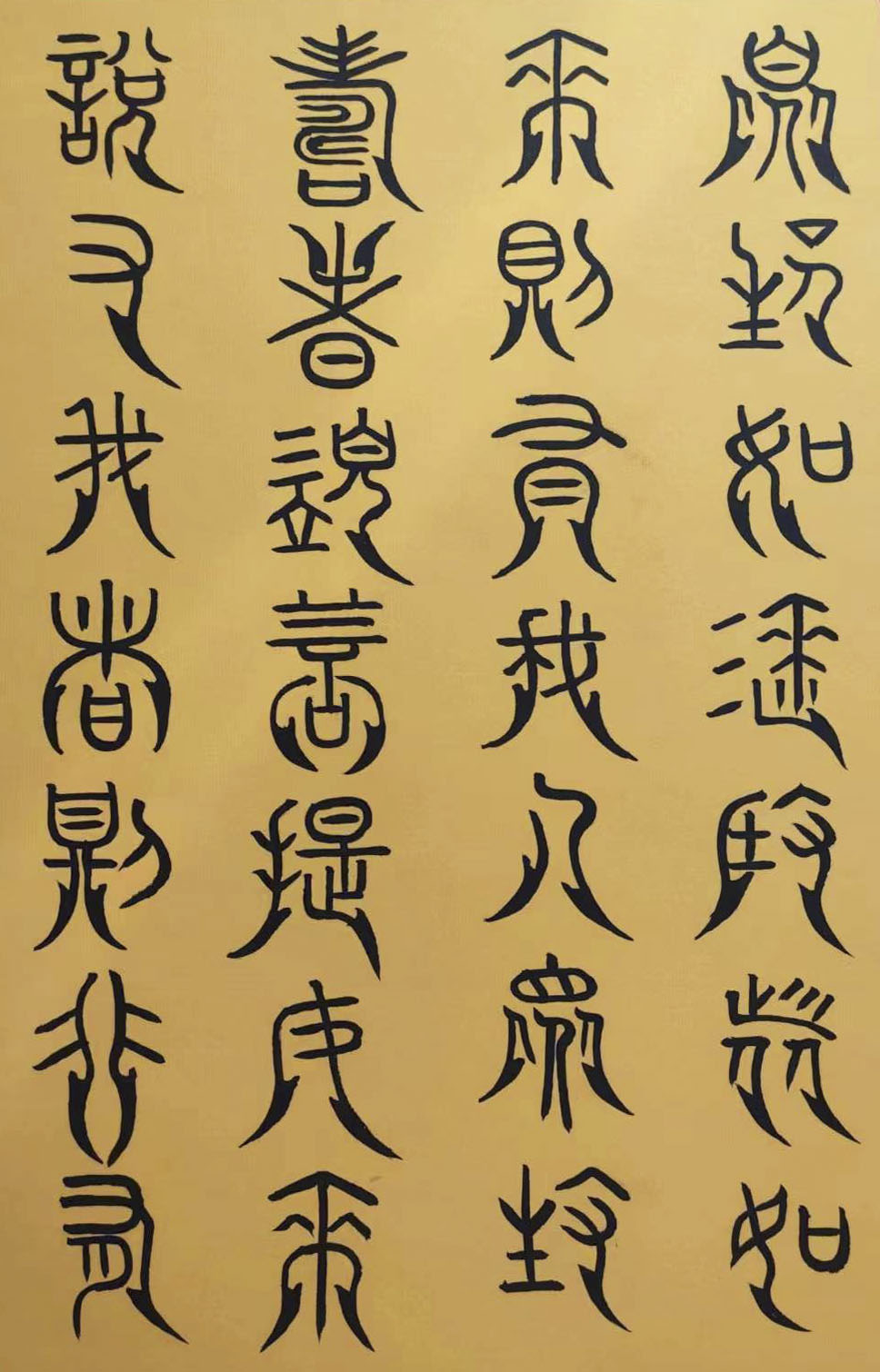 各类篆书之所常见,泰山碑为代表的官家气象,峄山碑所代表的秦风铁丝。再向远溯,则有石鼓文勒石朴茂的风范,亦有金文叩击山河的变化多端。但是,这些大篆类小篆书类的书法现象,却不能完全表现书法文化在秦以及先秦时代的百花齐放。走进当代著名书法家韩学友先生的书法体系,足以极视听之愉,可以大览篆书源头的无量奇观!他以书法家的历练,深刻挖掘篆书的三十二体的写法秘籍,以亘古相续的文化弘扬姿态,把篆书宏伟博大的历史奇观,在当下焕发出夏鼎商彝式的巍巍精神!